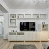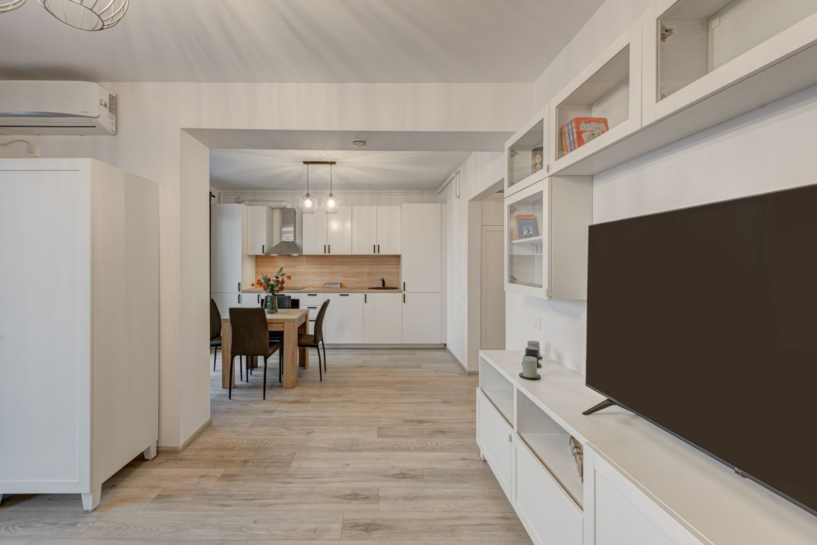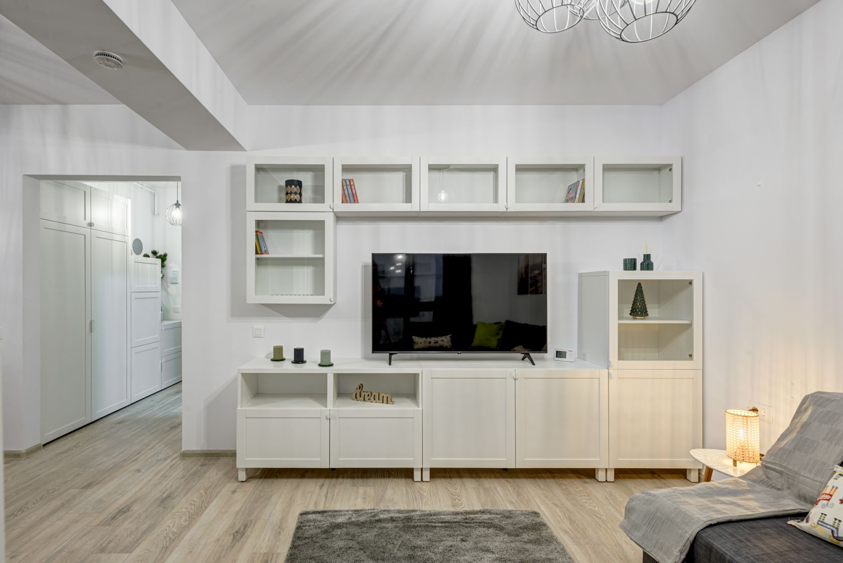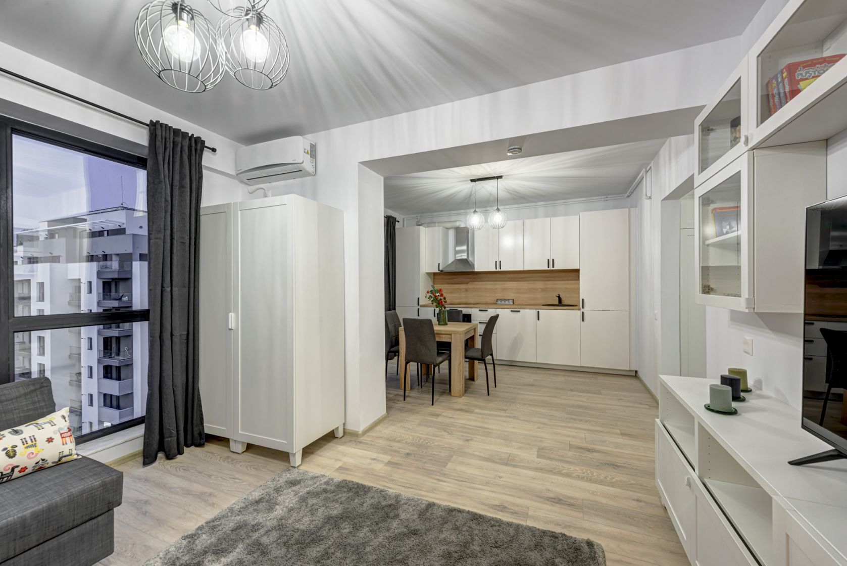 Zona de zi este amenajata modern cu o canapea extensibila, mobilier de zi cu multe spatii de depozitare, TV smart si un dulap de haine.
