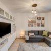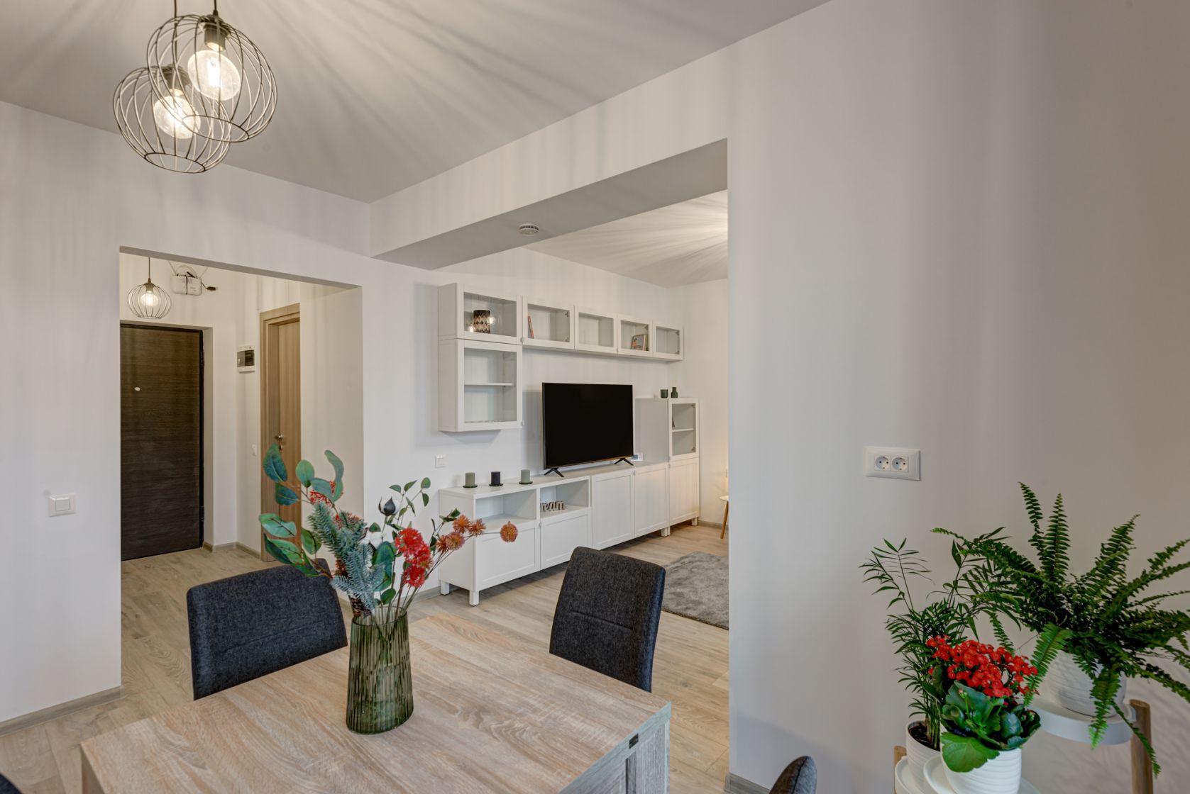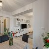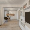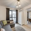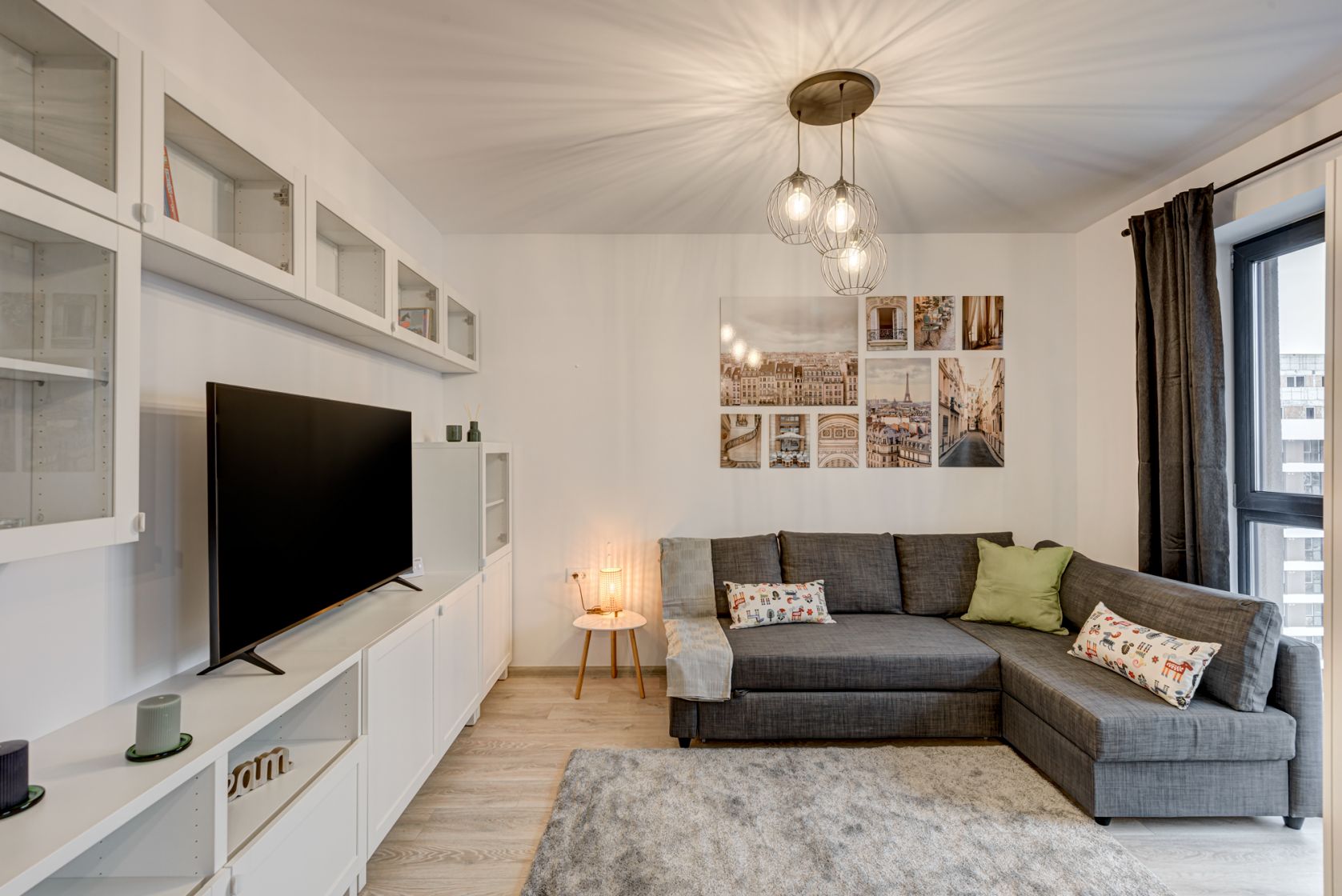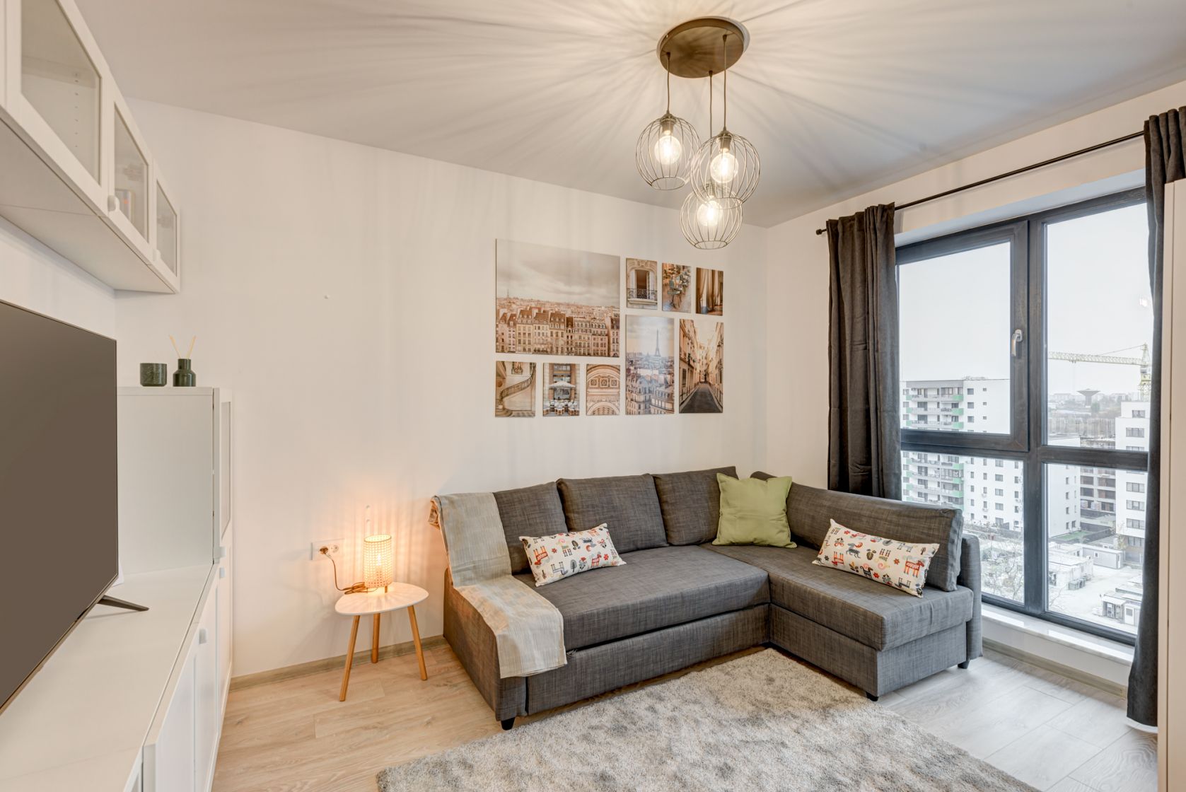 Zona de zi este amenajata modern cu o canapea extensibila, mobilier de zi cu multe spatii de depozitare, TV smart si un dulap de haine.