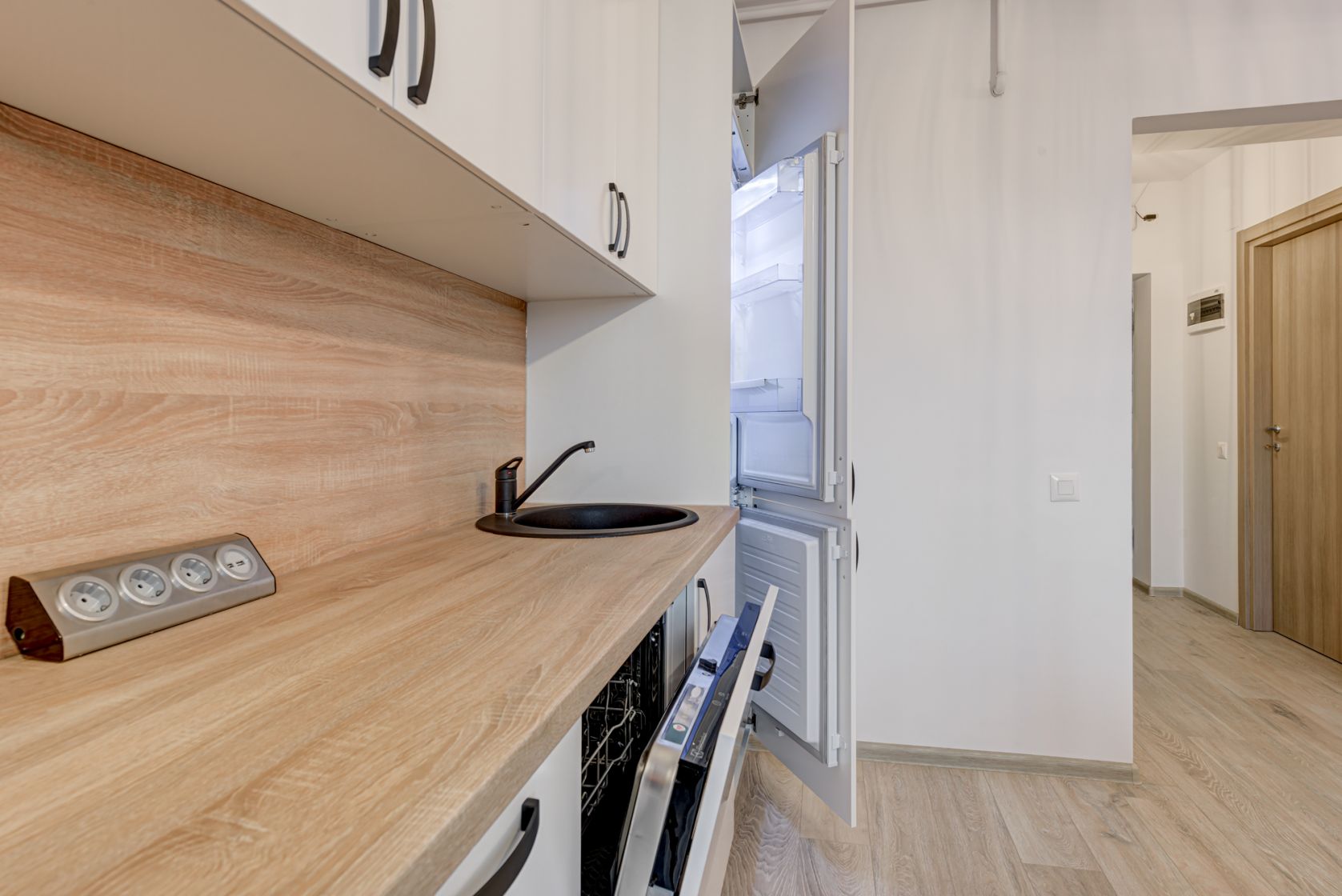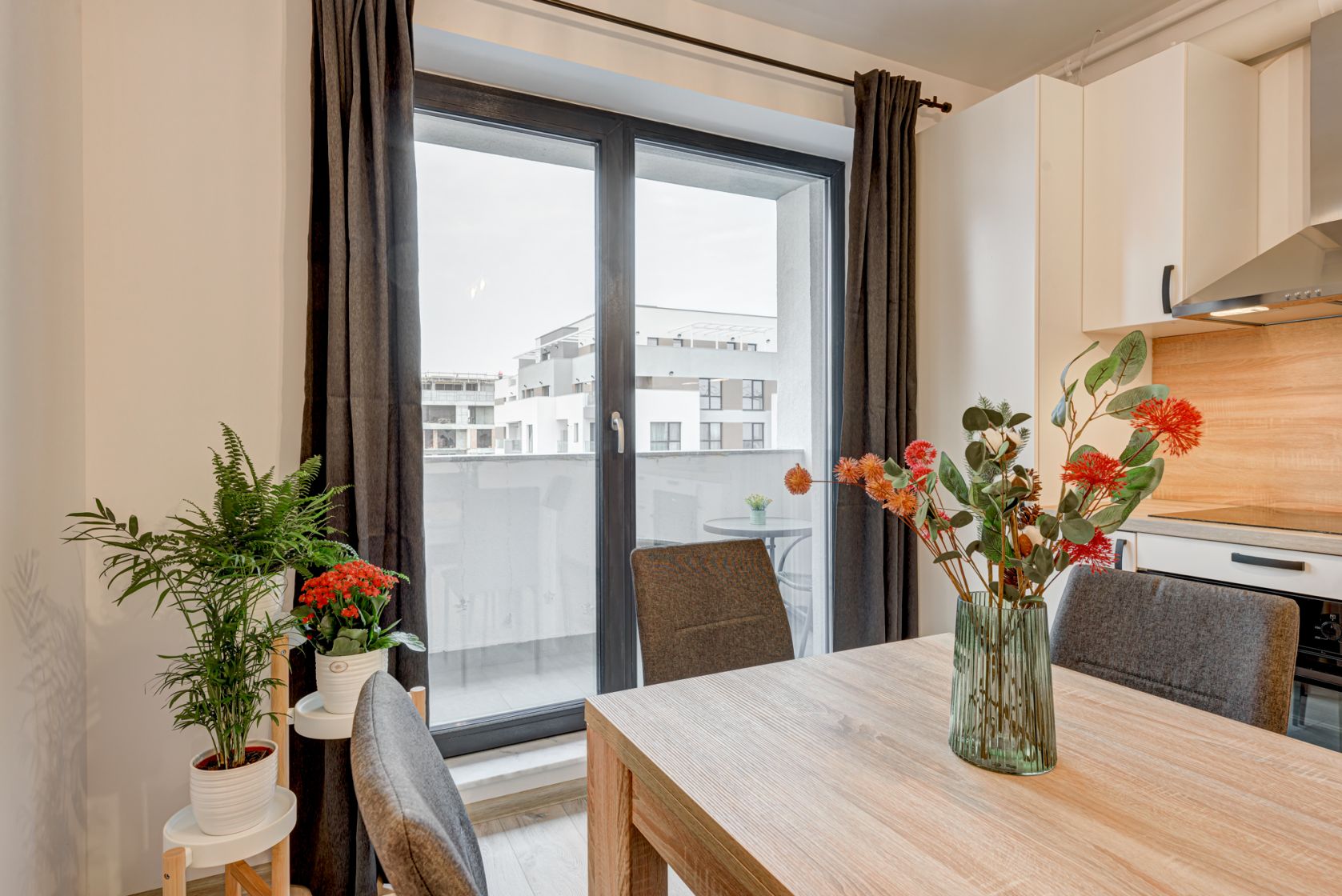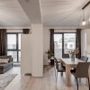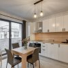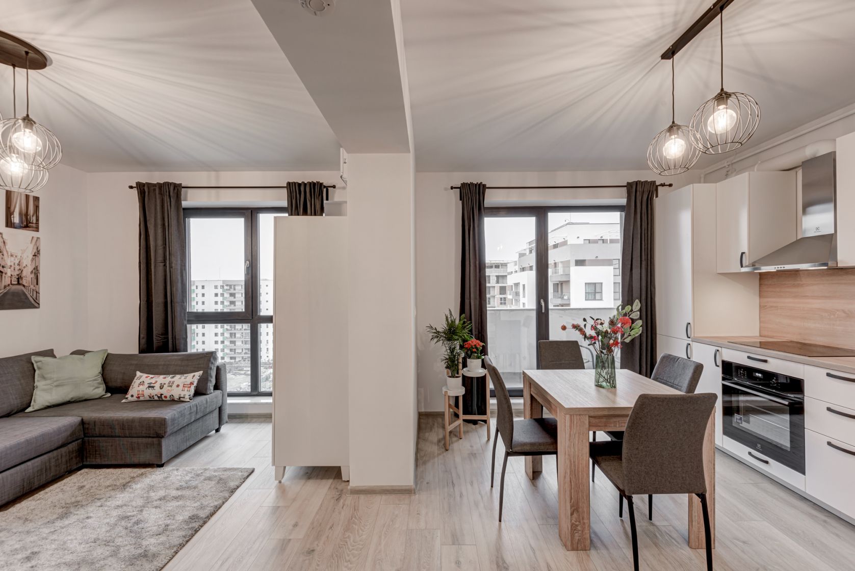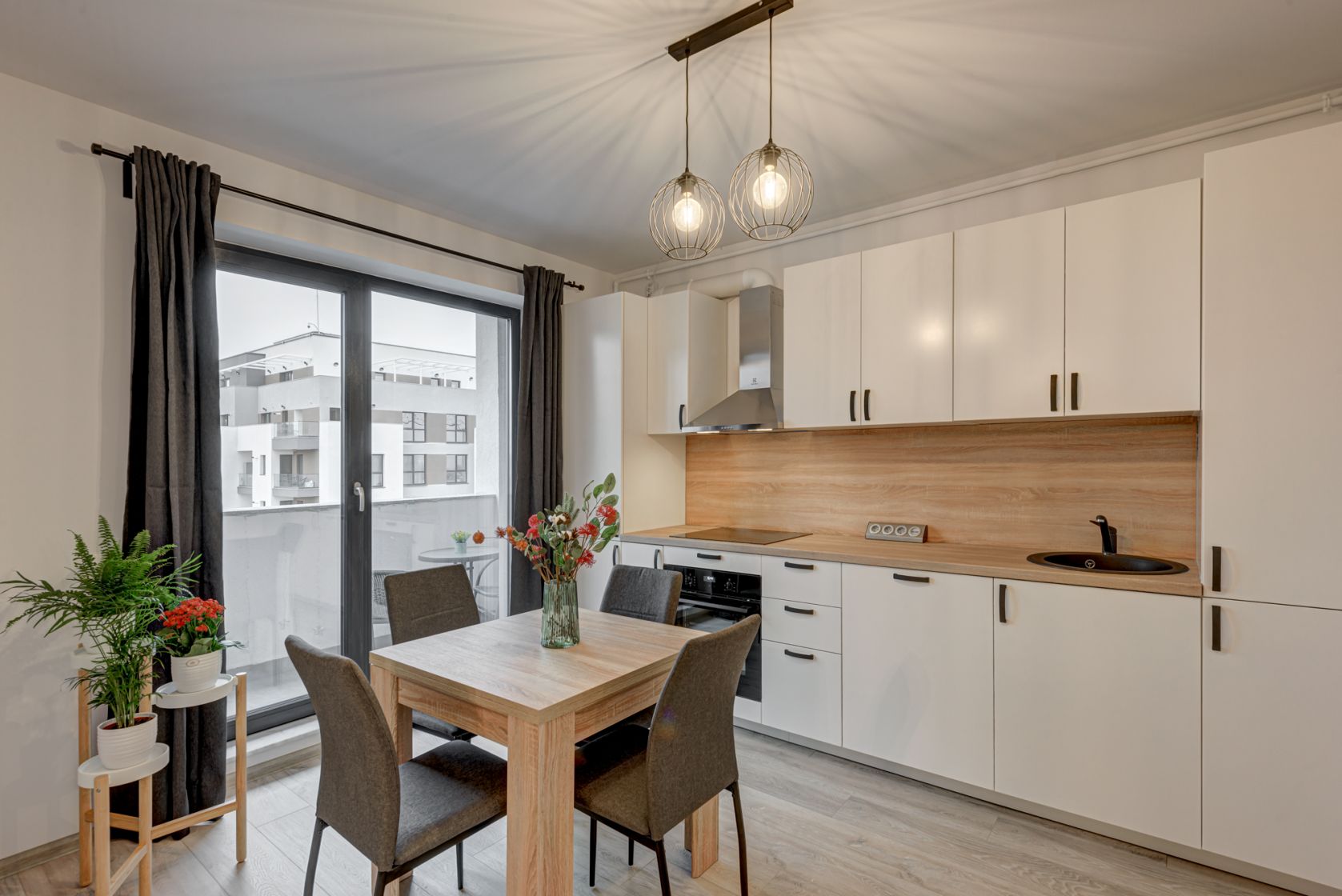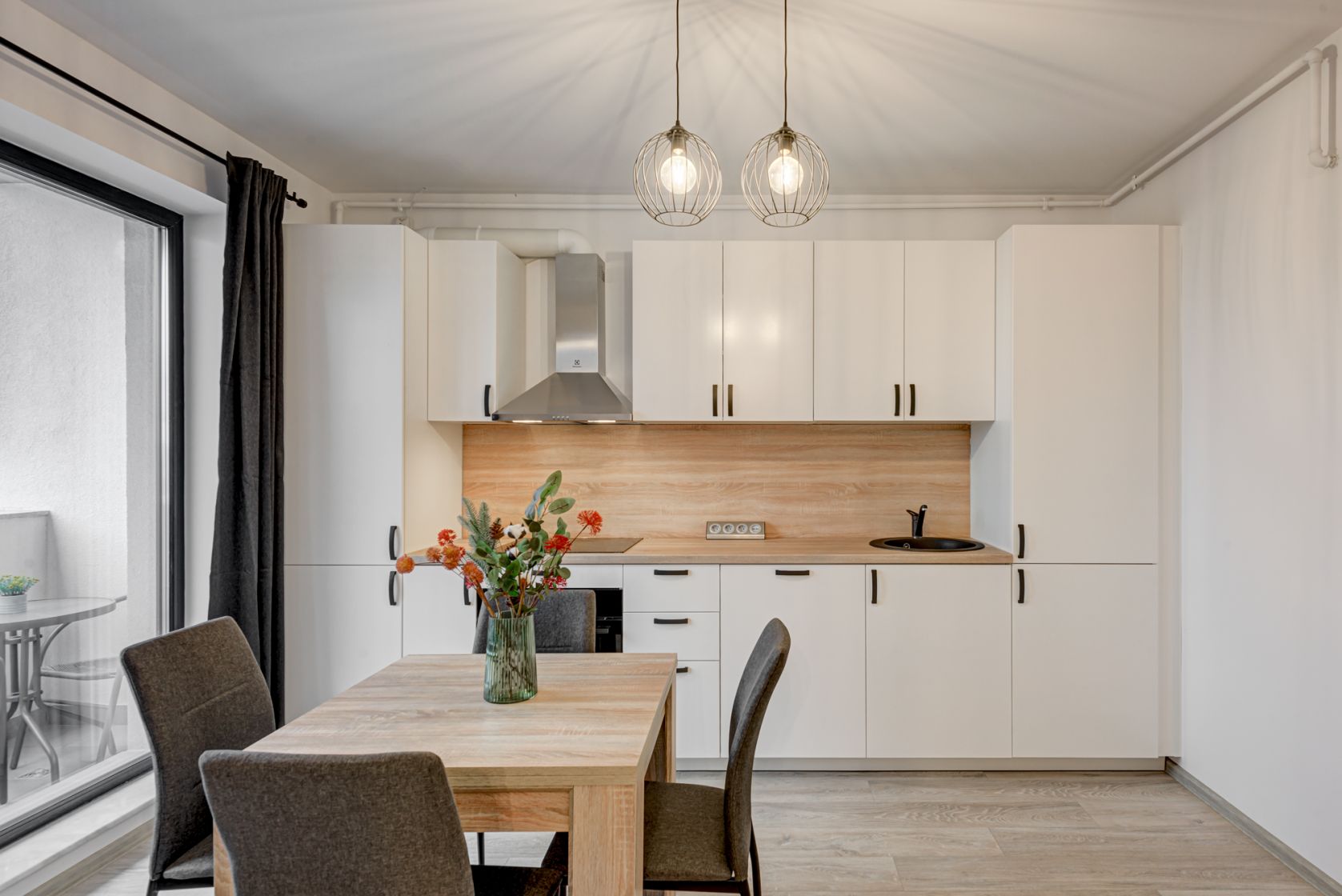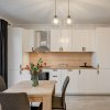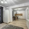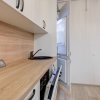 Bucataria este mobilata si echipata full, dotata cu plita electrica, cuptor electric, hota, masina de spalat vase si frigider incorporabil, toate marca Electrolux. Tot in bucatarie s-a creat un loc de luat masa pentru 4 persoane.