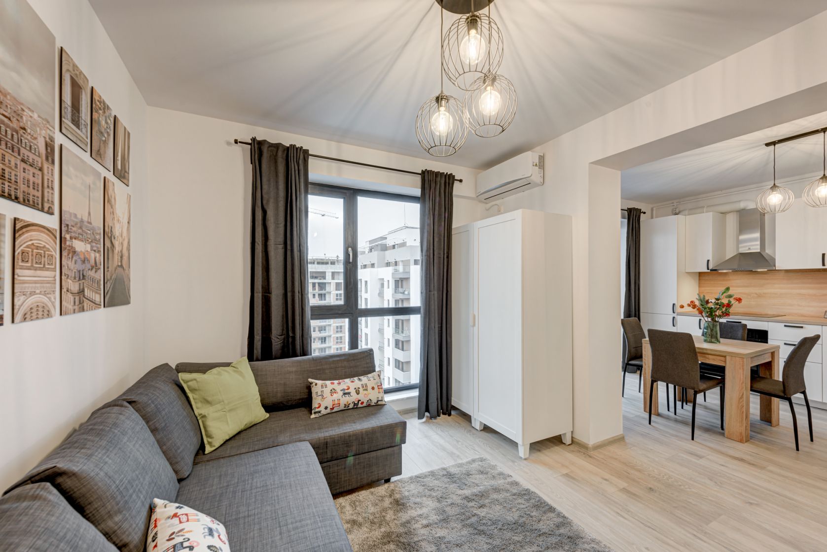 Studio-ul este situat la etajul 8/10, are o compartimentare practica, decomandata cu multe de spatii de depozitare. Are o suprafata de 36 mp si beneficiaza de un balcon cu acces din zona bucatariei. Beneficiaza de finisaje moderne, este dotat cu incalzire prin pardoseala, centrala termica proprie, 1 aparat de aer conditionat iar ferestrele sunt panoramice atat in zona de living cat si cele din bucatarie.