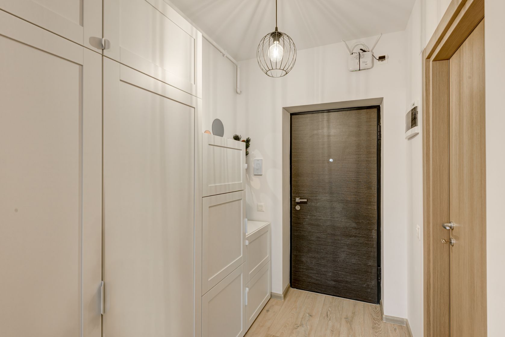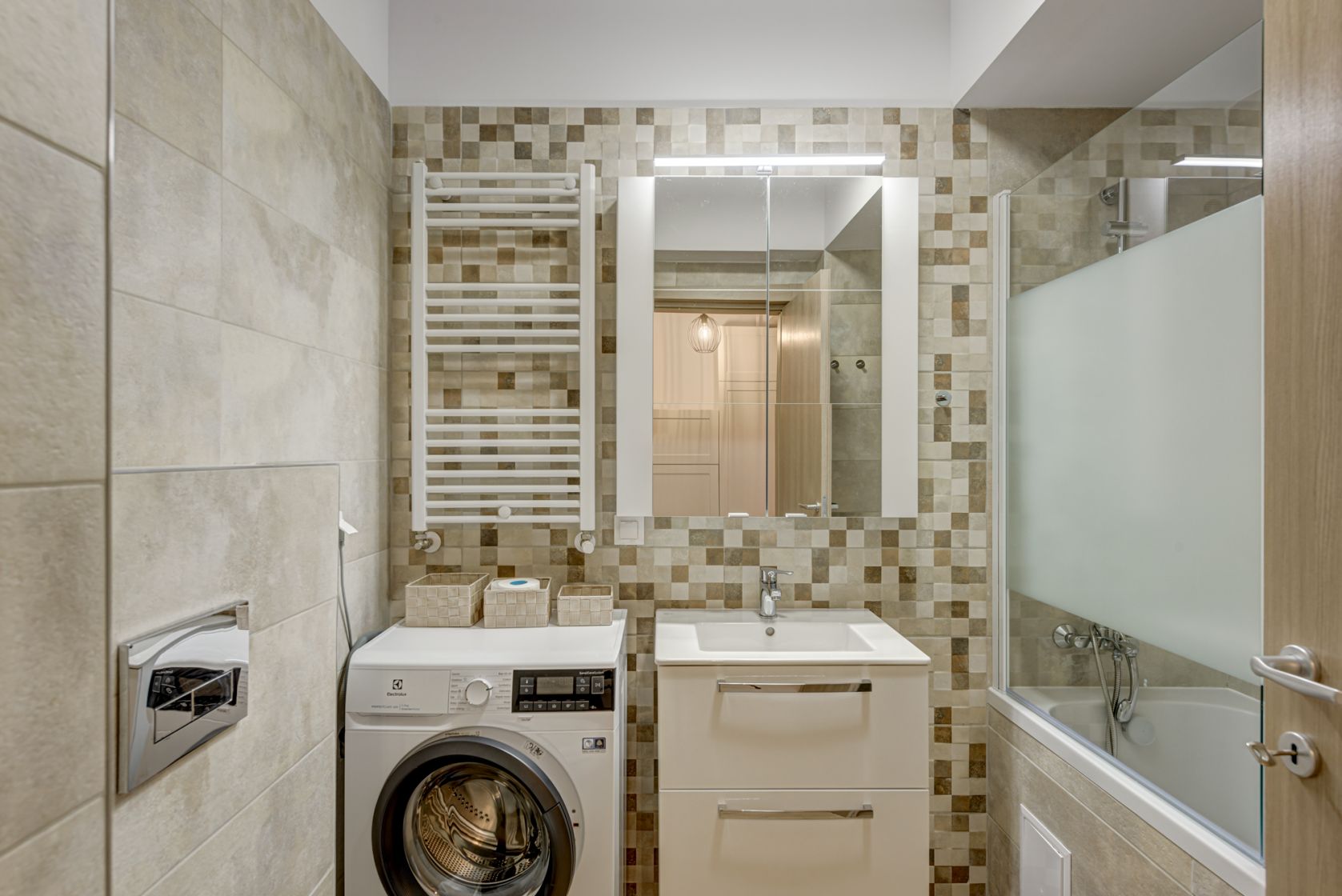 Baia este spatioasa, amenajata complet, dotata cu cada, obiecte sanitare si masina de spalat rufe Electrolux. In holul de la intrare spatiul a fost maximizat creandu-se spatii suplimentare pentru depozitare atat pentru haine cat si pentru incaltaminte.