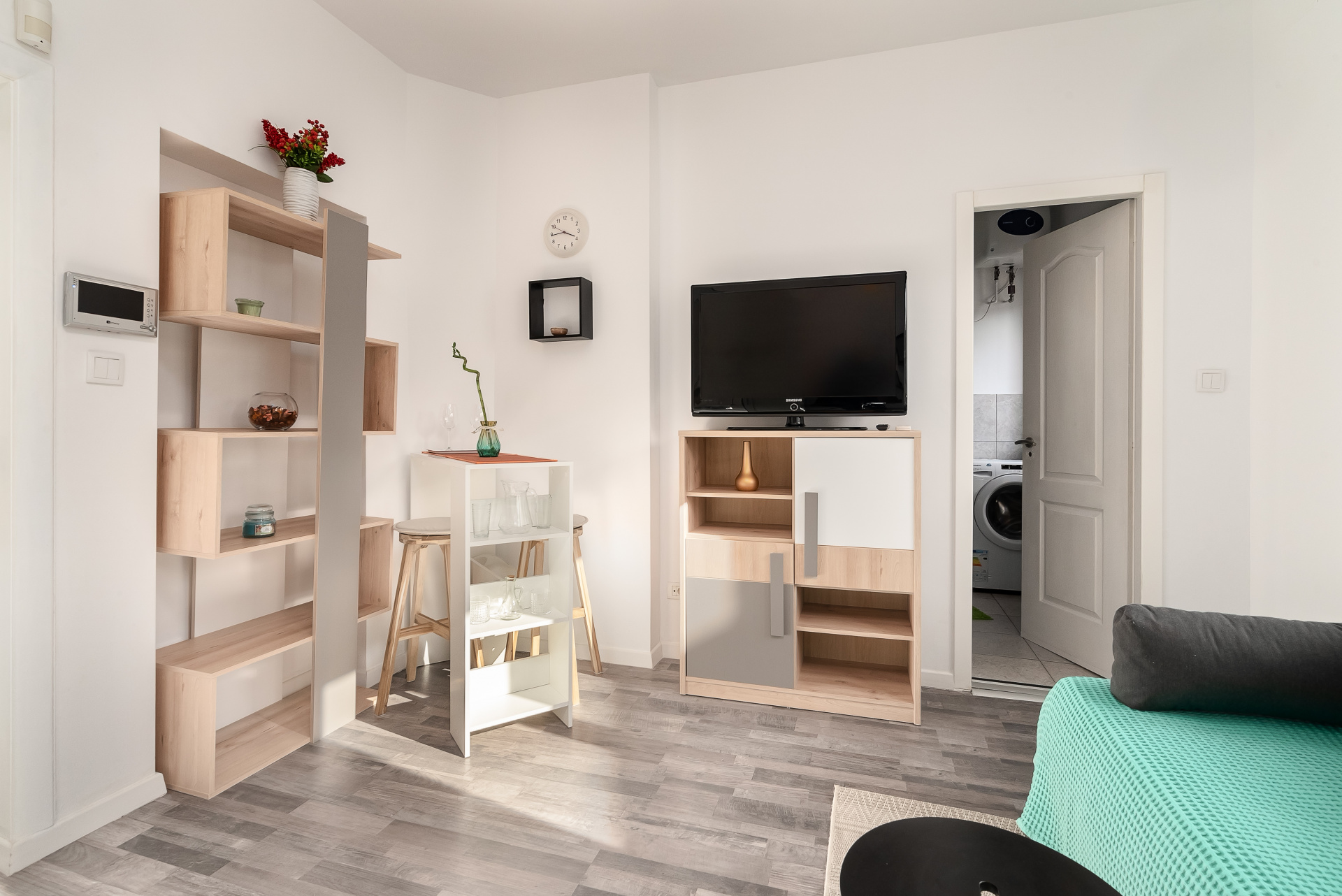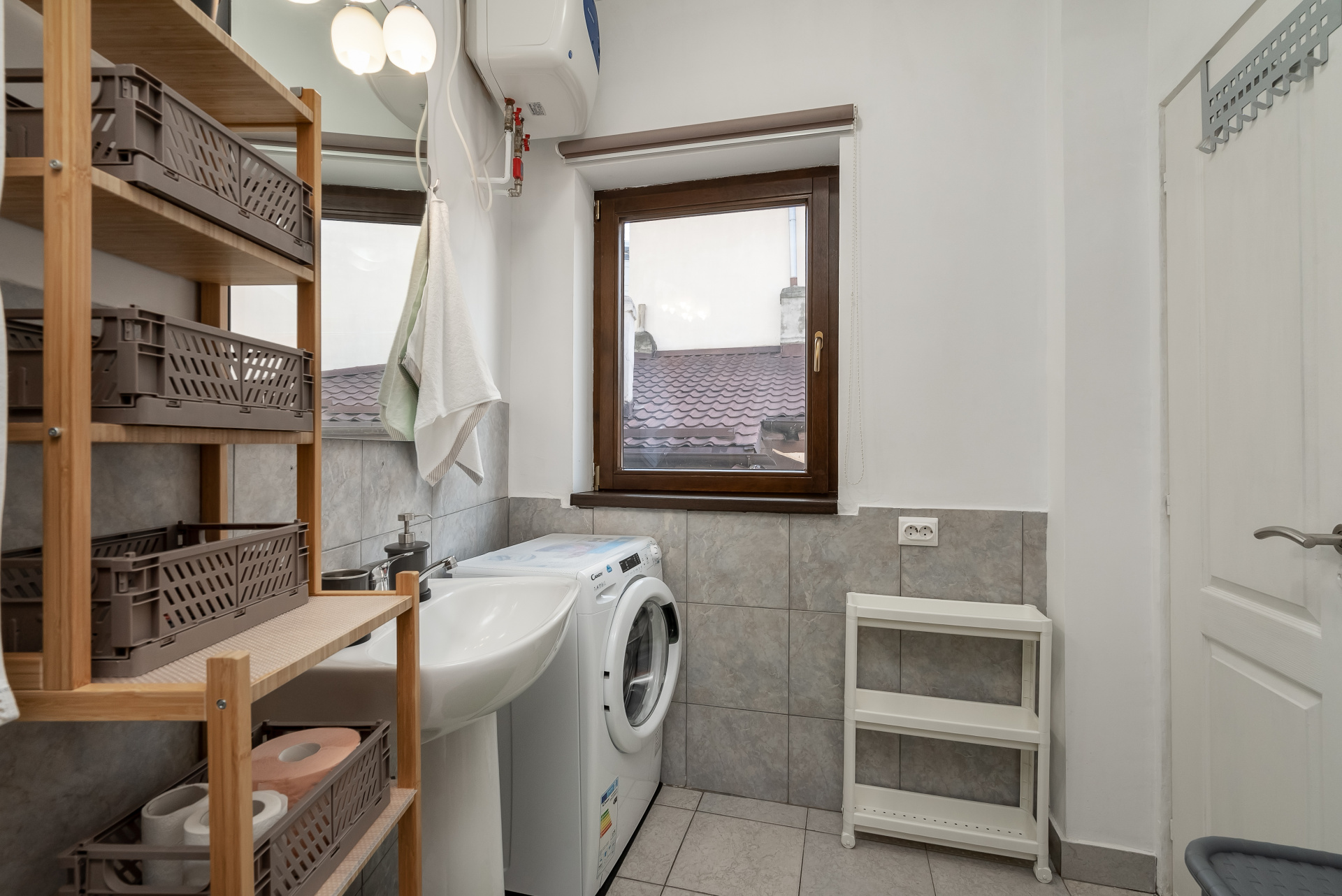Dupa cum am relatat si mai devreme acest apartament a fost facut pentru regim hotelier. Aveti televizor, Internet de 300 mb/s Orange, aparat de aer conditionat, saltea ortopedica, fier de calcat, masa de calcat, feon. Baia este prevazuta de la masina de spalat rufe pana la orice raft pentru sampon, periuta de dinti...etc. Bucataria care este separata de restul apartamentului, asa se construiau casele in acele vremuri, dotata pana la ultimul pahar ( cuptor microunde, filtru de cafea, fierbator, cuptor, hota, toaster de paine, oale, tigai, farfurii, castroane).