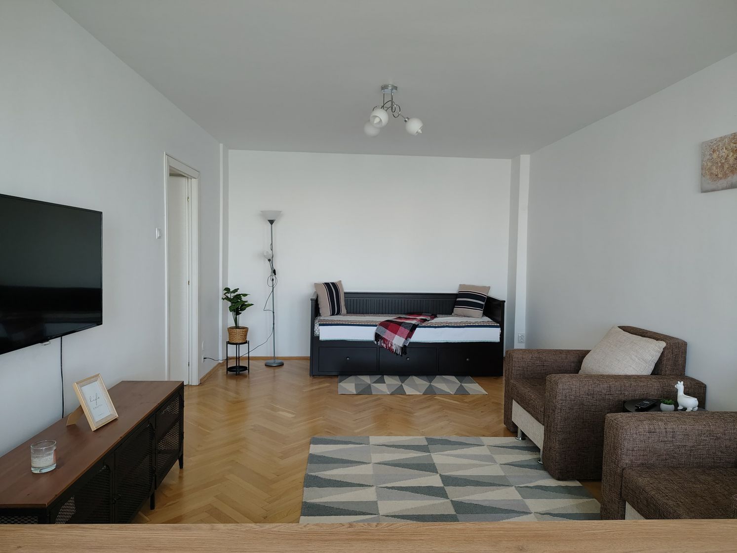 Dormitor cu canapea extensibila Zonă de citit cu doua fotolii, birou si TV si spațiu de depozitare.