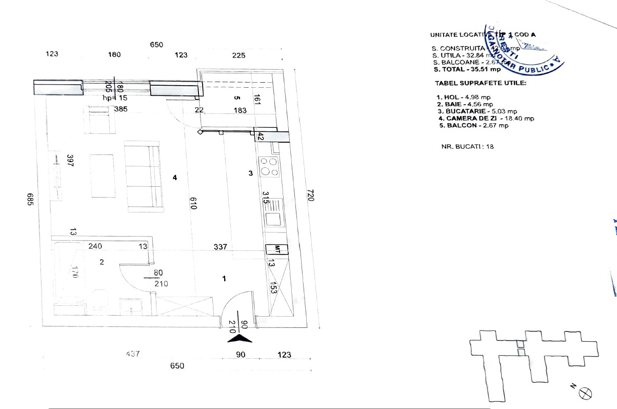 Studioul are o suprafata utila totala de 35.5mp dintre care 2.8mp de balcon. Orientarea este catre N-E, iar vederea este libera, catre lac.
