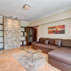 Livingul dispune de canapea tip coltar ( extensibila), corpuri de biblioteca ce incadreaza un perete placat cu piatra naturala, televizor smart.