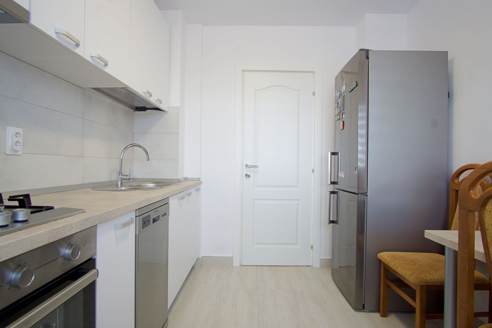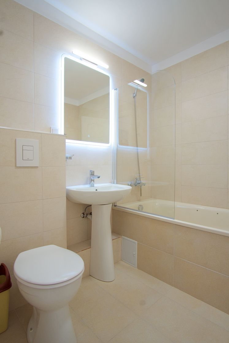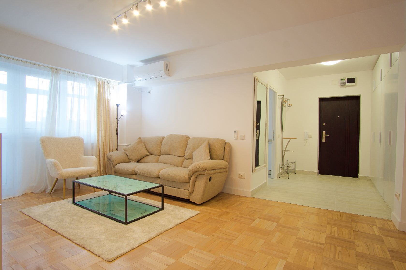 Mobilierul nou este completat de electrocasnice aflate in garantie: plita pe gaze, cuptor electric, hota cu aerisire, masina de spalat vase, masina de spalat rufe cu uscator, frigider. Confortul termic este asigurat de 2 aparate de aer conditionat inverter (LG si Midea) care dau caldura si la temperaturi exterioare negative si, in caz de avarii la radet, exista instalat in paralel un boiler electric Ariston de 80l. Consumul de caldura, apa calda si rece sunt masurate de apometre si repartitoare.