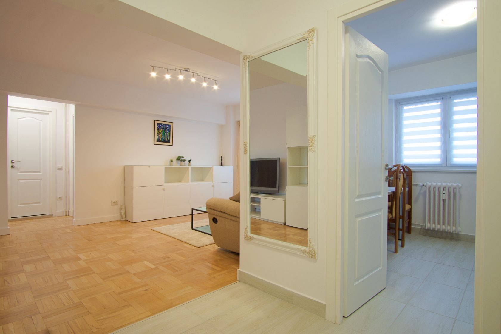 Locuinta se afla la etajul 4 si are vederea spre spatele blocului, beneficiind de liniste si zona verde insorita. Apartamentul a fost complet renovat cu finisaje de înaltă calitate, avand instalatiile electrice si sanitare inlocuite si modernizate.