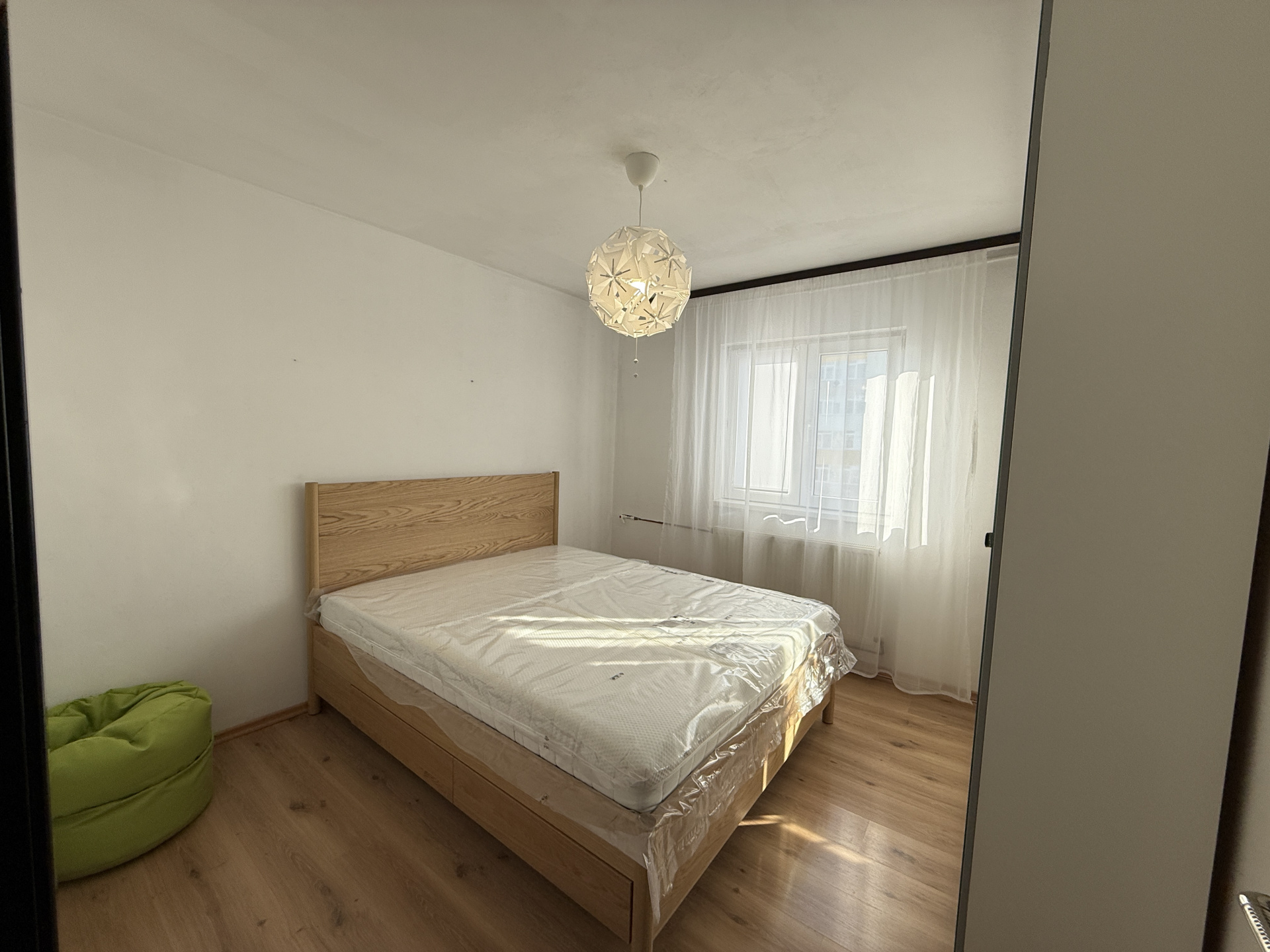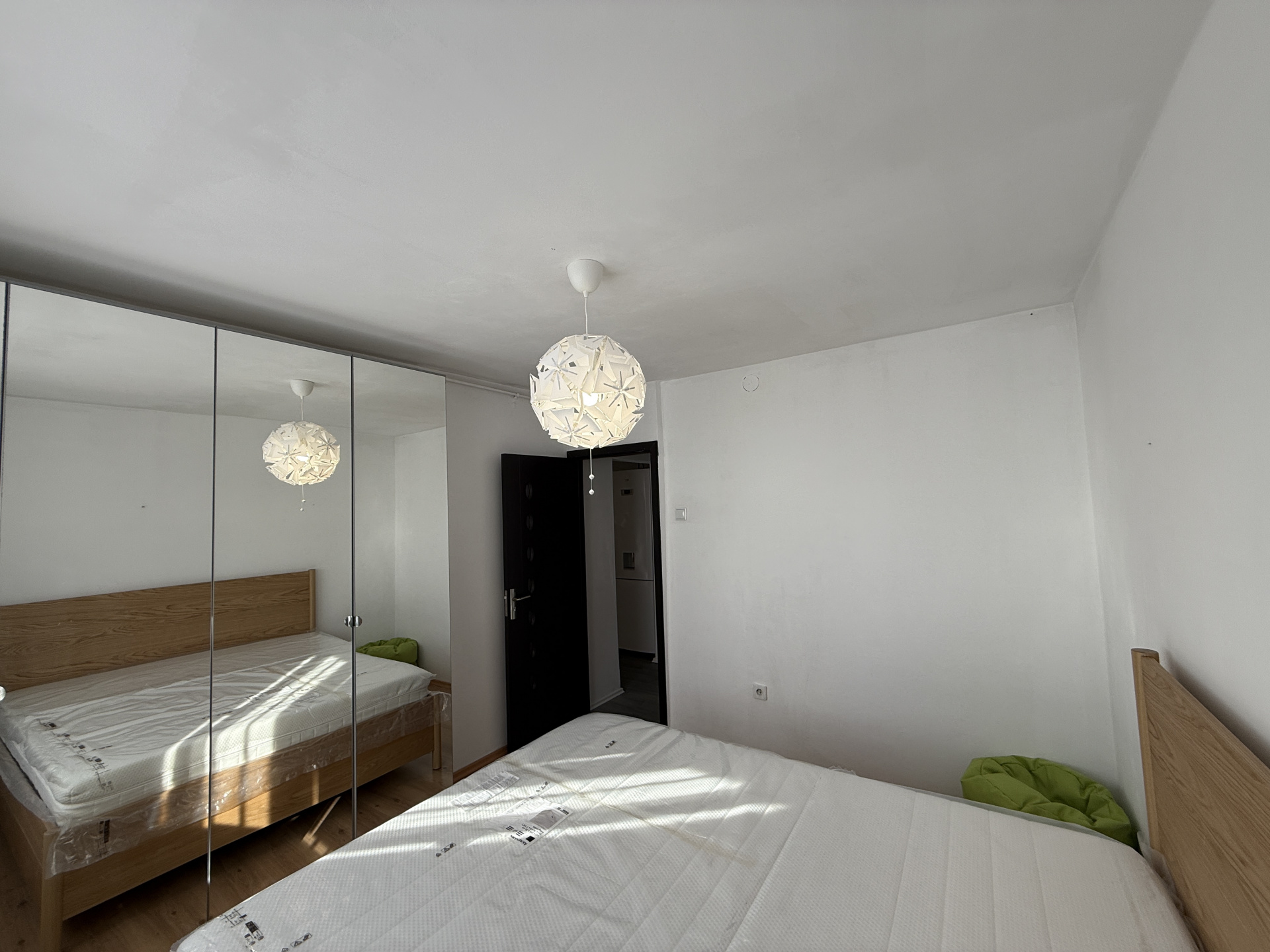 Dormitorul impresioneaza prin mobilierul nou din lemn natural de calitate, un dulap generos cu usi glisante cu oglinzi (care amplifica vizual spatiul), pardoseala din parchet si o lampa designer sferica care adauga personalitate. Ferestrele mari permit patrunderea luminii naturale, creand o atmosfera relaxanta.