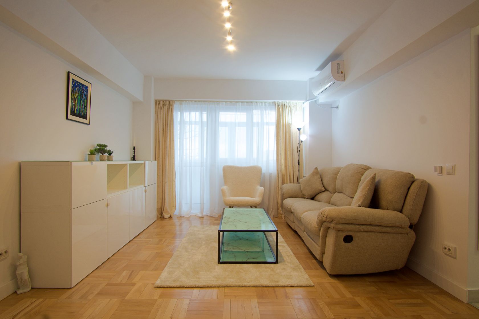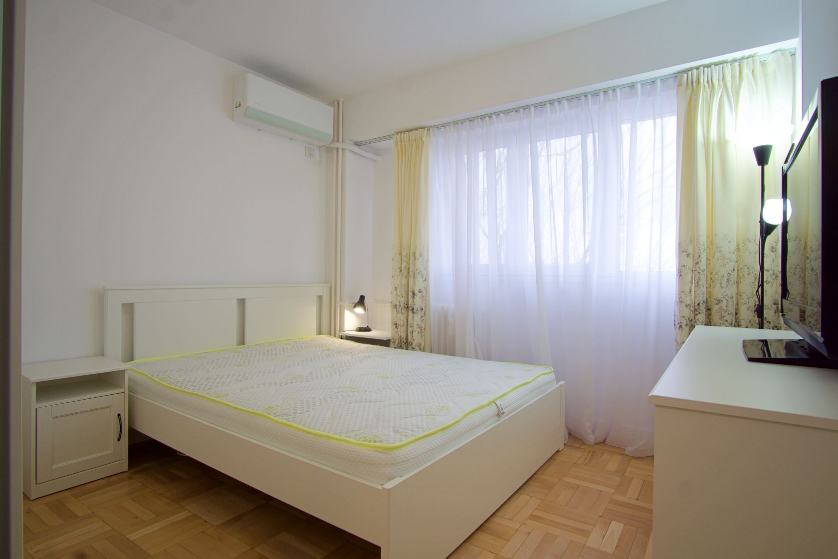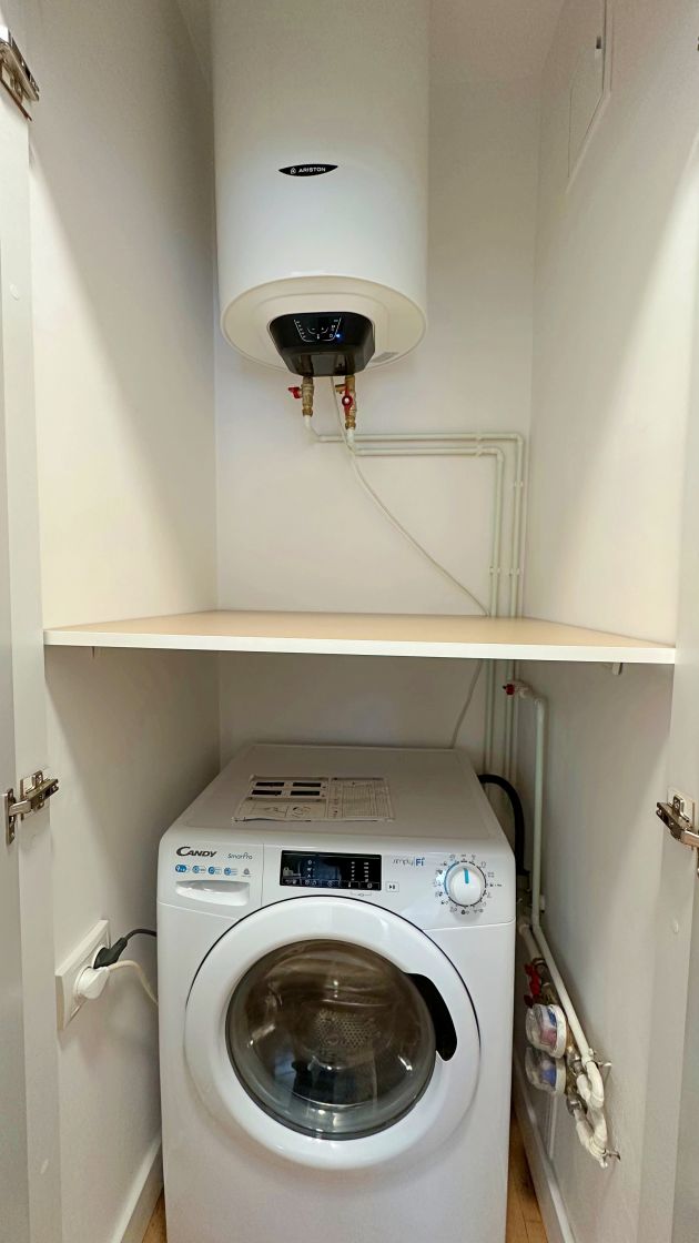 Mobilierul nou este completat de electrocasnice aflate in garantie: plita pe gaze, cuptor electric, hota cu aerisire, masina de spalat vase, masina de spalat rufe cu uscator, frigider. Confortul termic este asigurat de 2 aparate de aer conditionat inverter (LG si Midea) care dau caldura si la temperaturi exterioare negative si, in caz de avarii la radet, exista instalat in paralel un boiler electric Ariston de 80l. Consumul de caldura, apa calda si rece sunt masurate de apometre si repartitoare.
