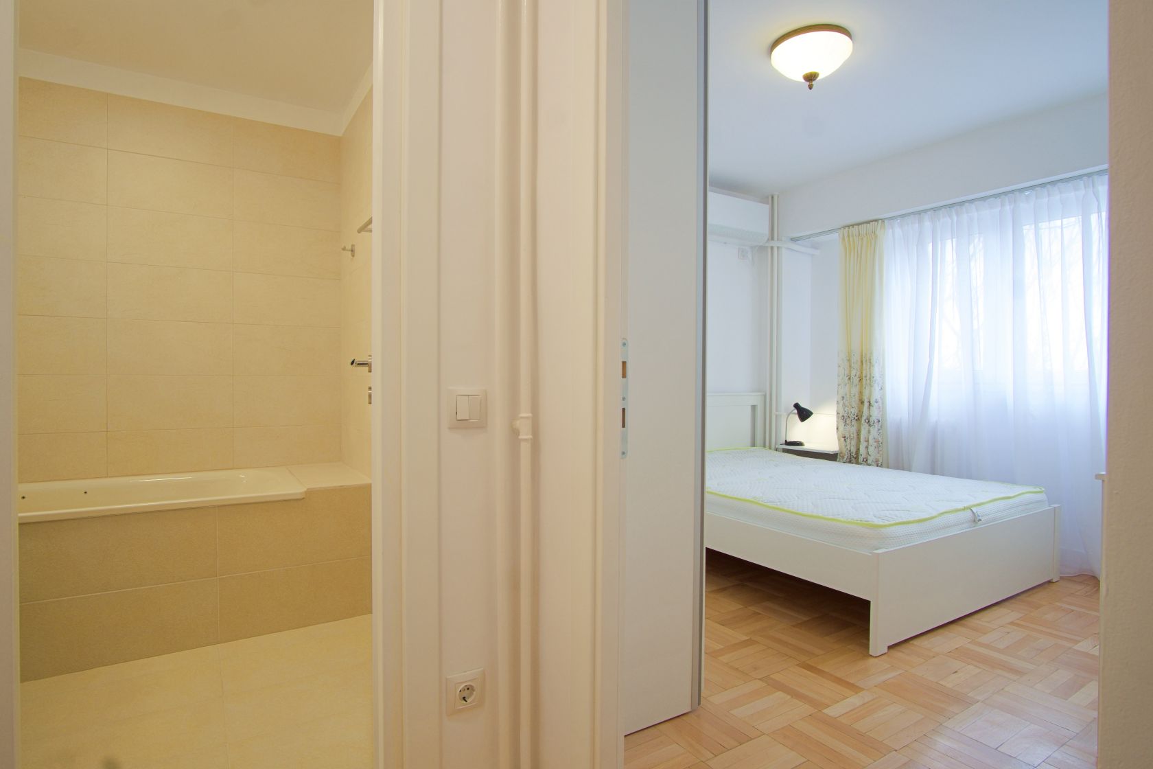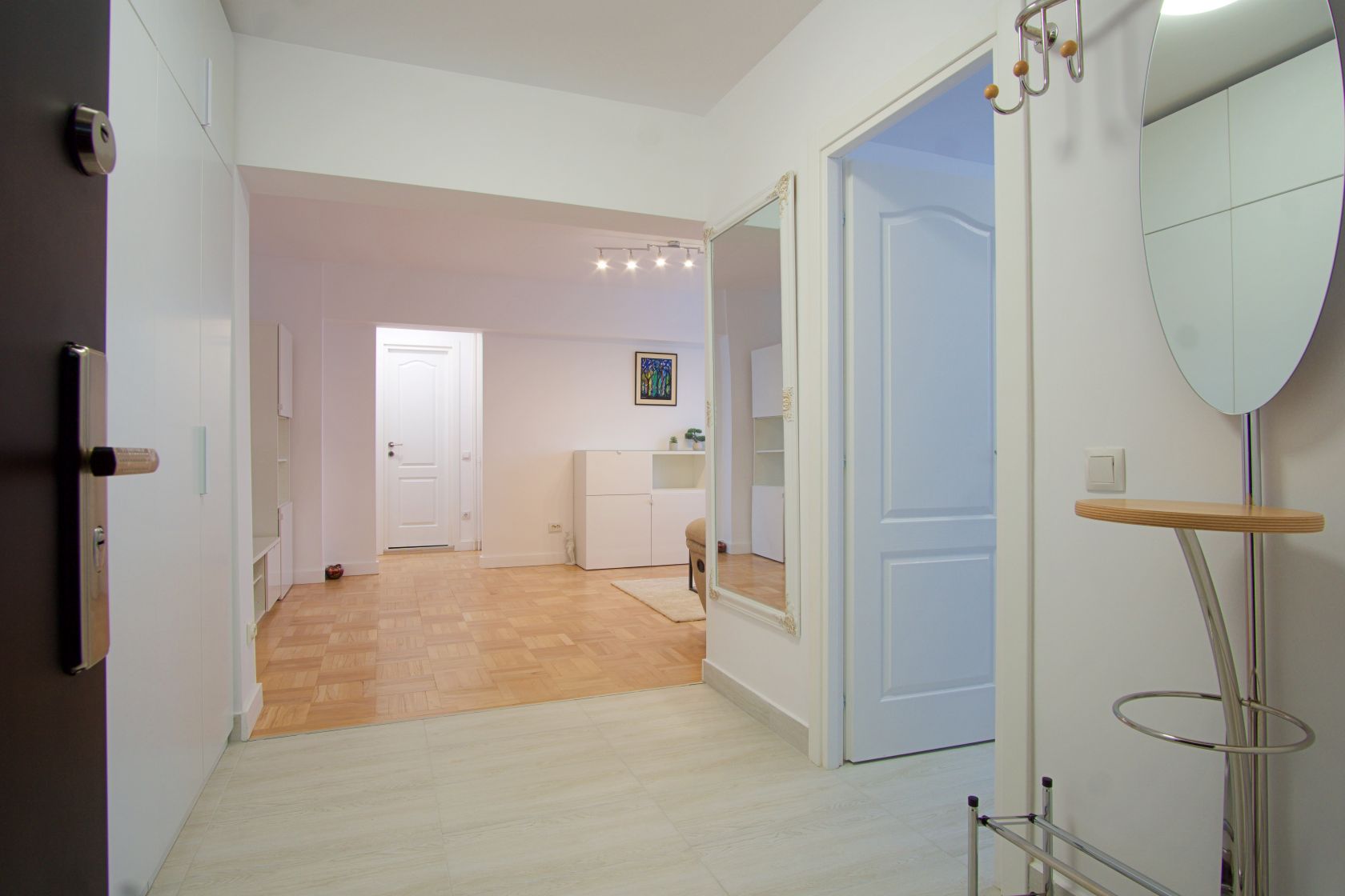 Locuinta se afla la etajul 4 si are vederea spre spatele blocului, beneficiind de liniste si zona verde insorita. Apartamentul a fost complet renovat cu finisaje de înaltă calitate, avand instalatiile electrice si sanitare inlocuite si modernizate.