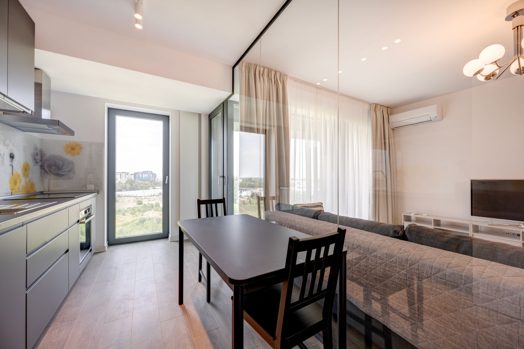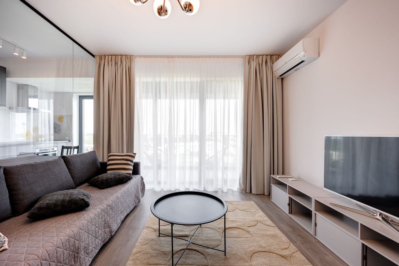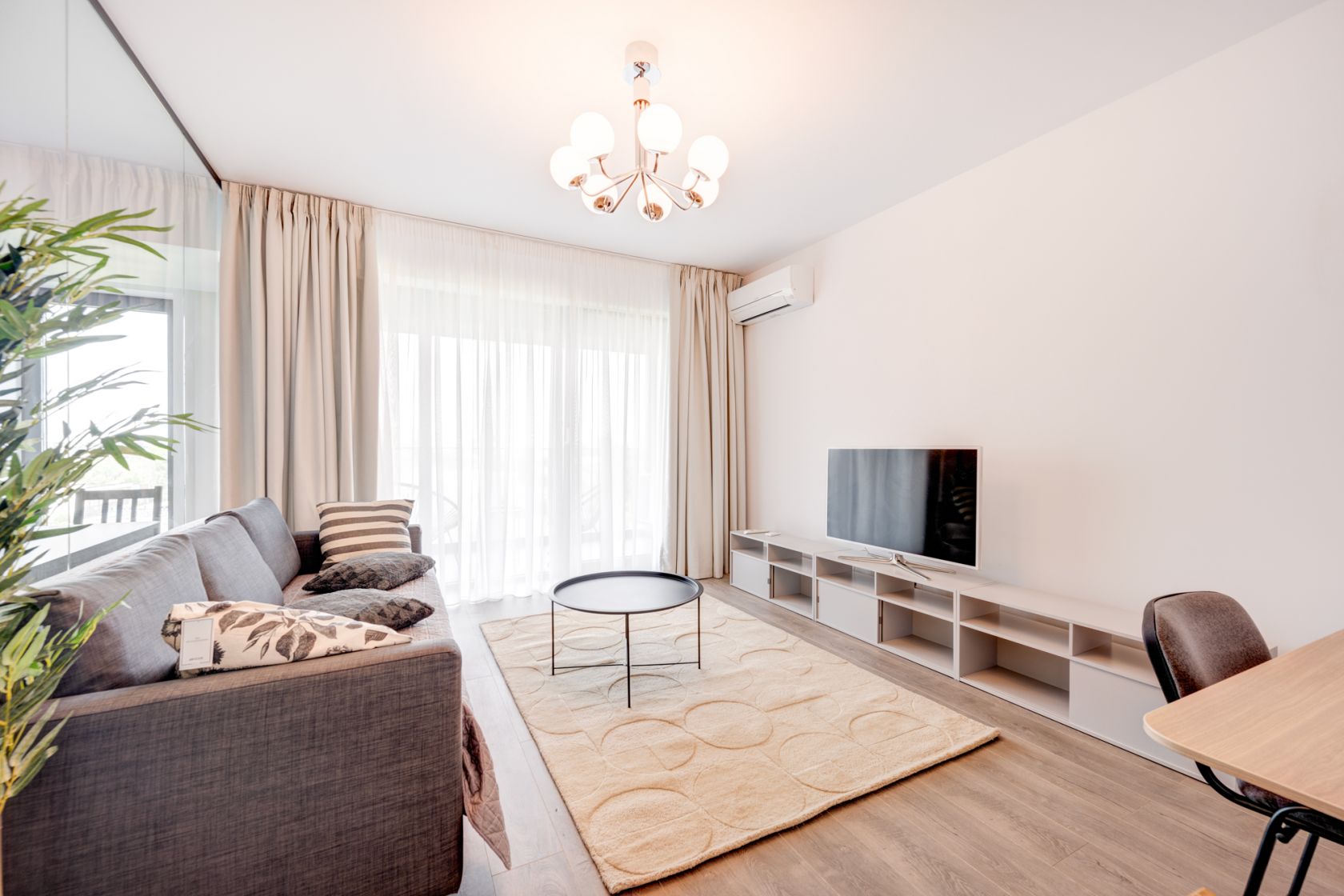 Va prezint spre inchiriere un apartament cu 2 camere, in suprafata total utila de 57.5 mp situat la etajul 5, in ansamblul Cloud9 Pipera.
