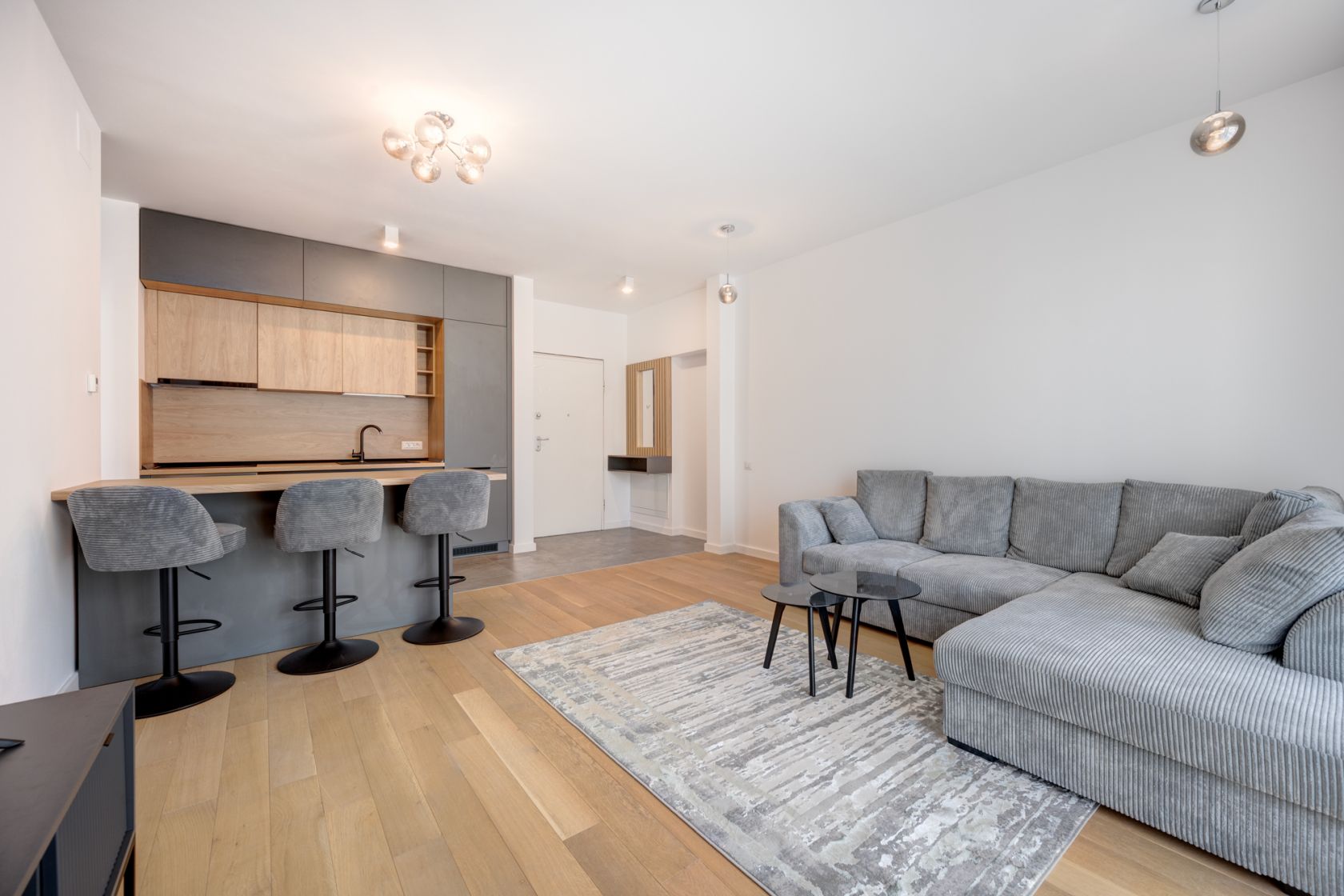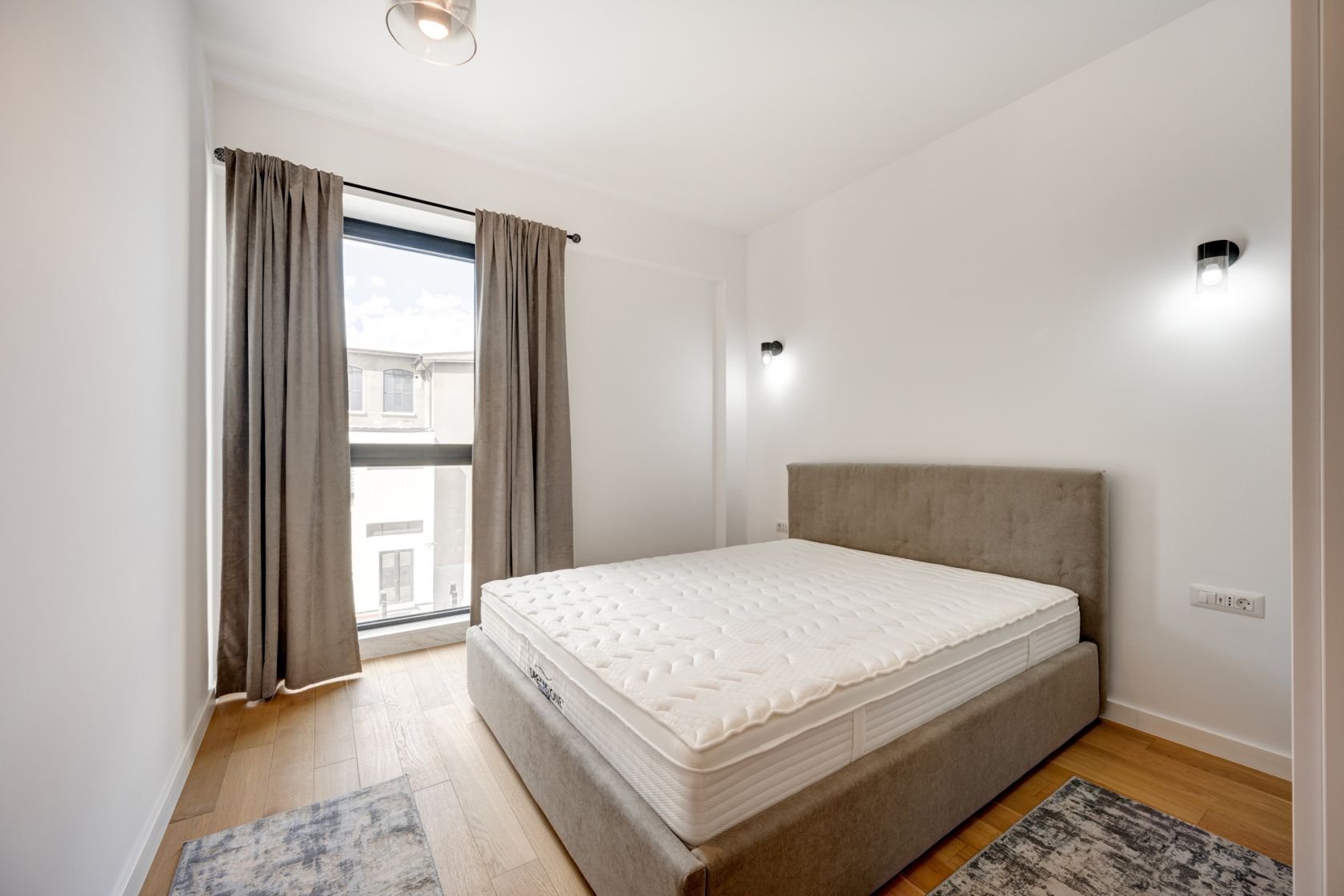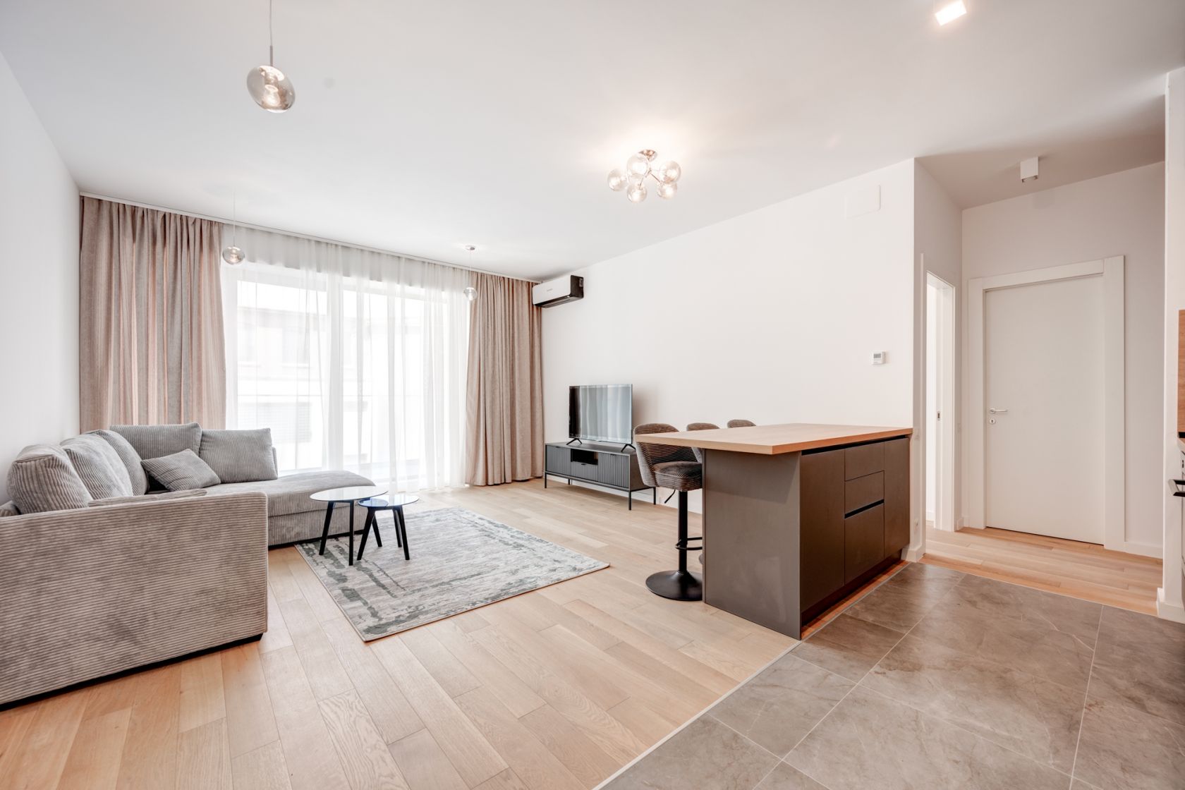 Apartament cu 2 camere - complet mobilat si utilat - prima inchiriere. Compartimentarea este excelenta, avand o zona de zi luminoasa si foarte generoasa ,de aproximativ 29 mp . Dormitorul in suprafata de 13,2 mp, are un pat matrimonial si un dulap incapator.