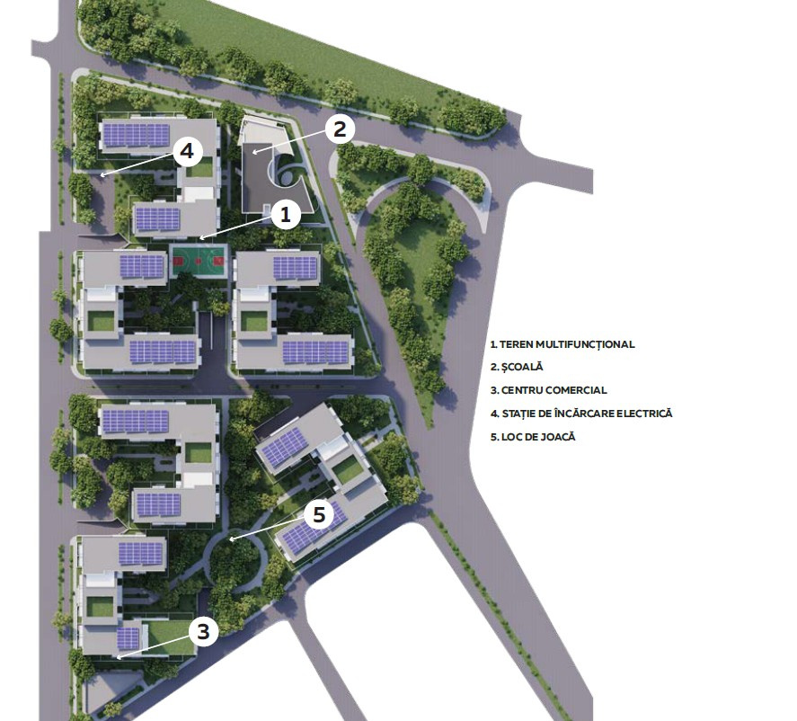 Facilitati oferite membrilor: gradinita, scoala, teren de sport, sala de fitness, loc de joaca, zone de promenada, parc, cafenea, restaurant, curatatorie, zone comerciale de shopping, facilitati pentru transport in comun, statii de incarcare pentru masini electrice, dar si o parcare numeroasa pentru biciclete, motociclete.