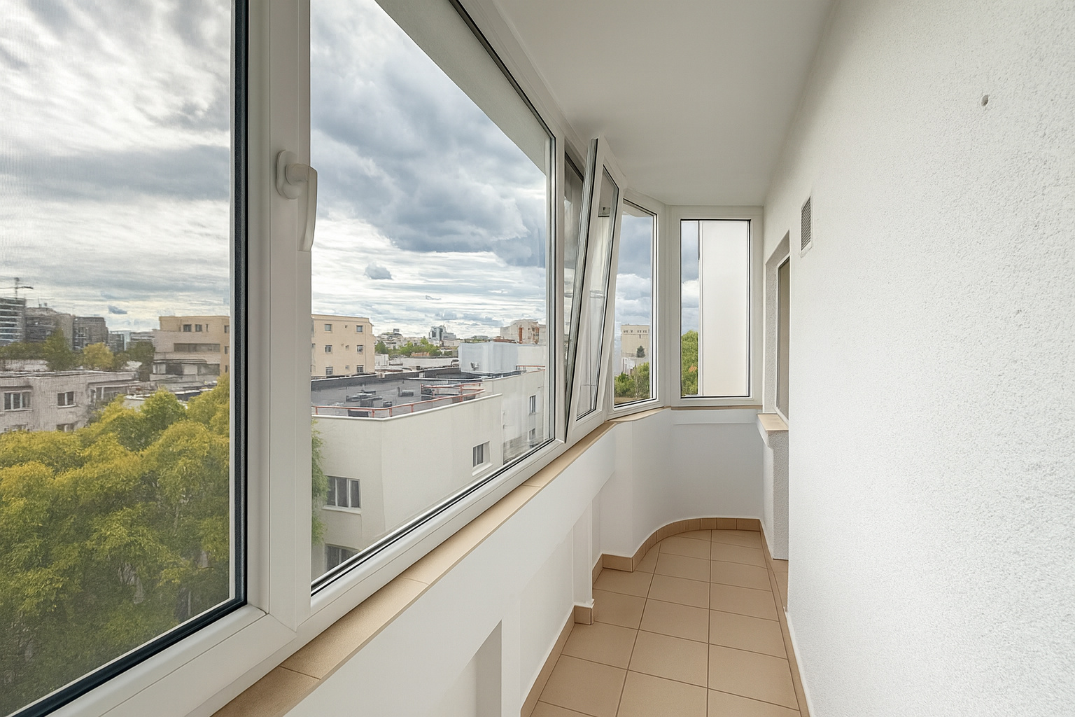 • Balcon închis: 4,3 mp, cu geamuri termopan și profile PVC