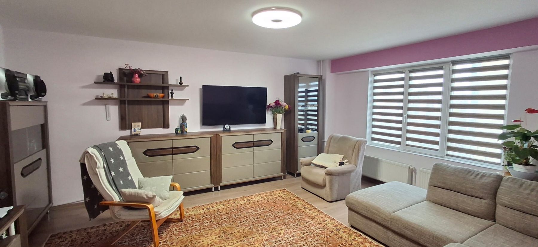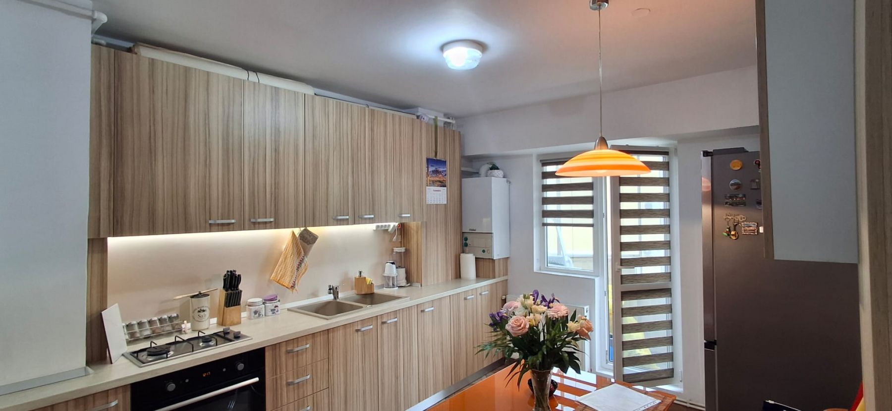 Descriere imobil: Apartament de 2 Camere cu o suprafata totala 64 mp, situat la Et. 6, intr-un bloc finalizat in An 1996, format din 8 nivele. Apartamentul este decomandat, compus din 1 sufragerie, 1 dormitor, bucatarie open space, 1 grup sanitar, balcon. Instalatia electrica, si sanitara, au fost refacute, cu ceva timp in urma. Dispune si de Centrala pe Gaz, incalzirea se face cu centrala proprie cu calorifere, este racordat la Apa, Gaz, Curent Electric. Apartamentul se vinde semi mobilat, ramane in apartament ( Bucataria, Dormitorul, Baia ). Blocul are lift, dispune de camere de supraveghere. Apartamentul dispune de loc de parcare de la Primarie, mai are si o boxa de depozitat.
