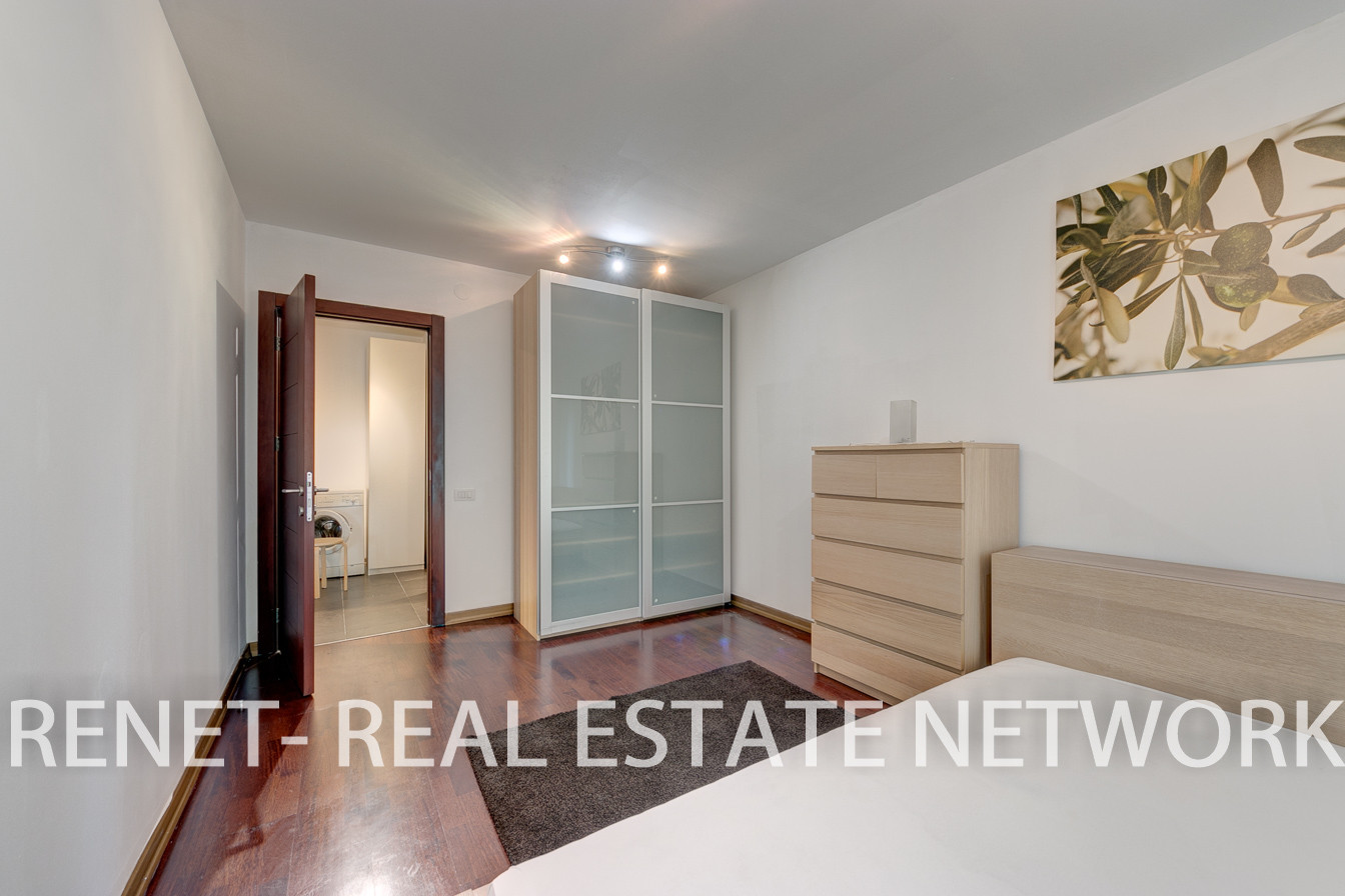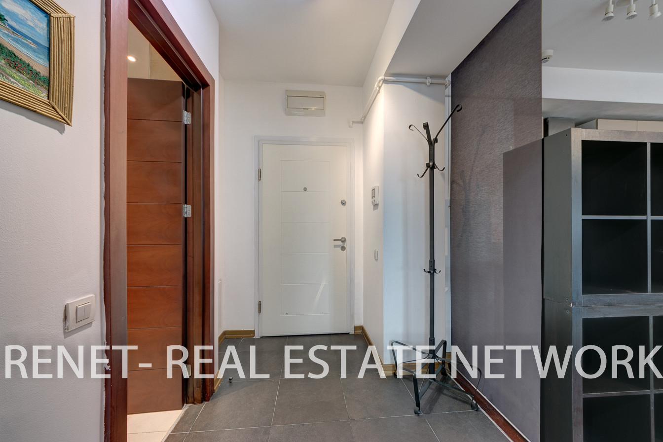 Apartamentul oferă un living luminos cu balcon, bucătărie open-space complet echipată, dormitoare cu dressing și paturi duble, plus rulouri electrice pentru confort sporit.