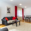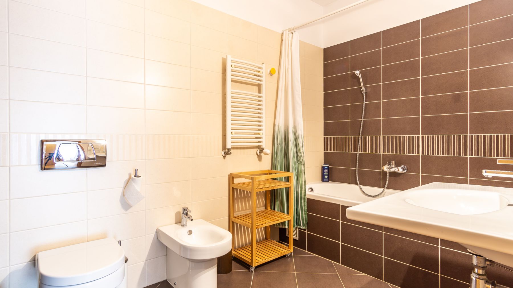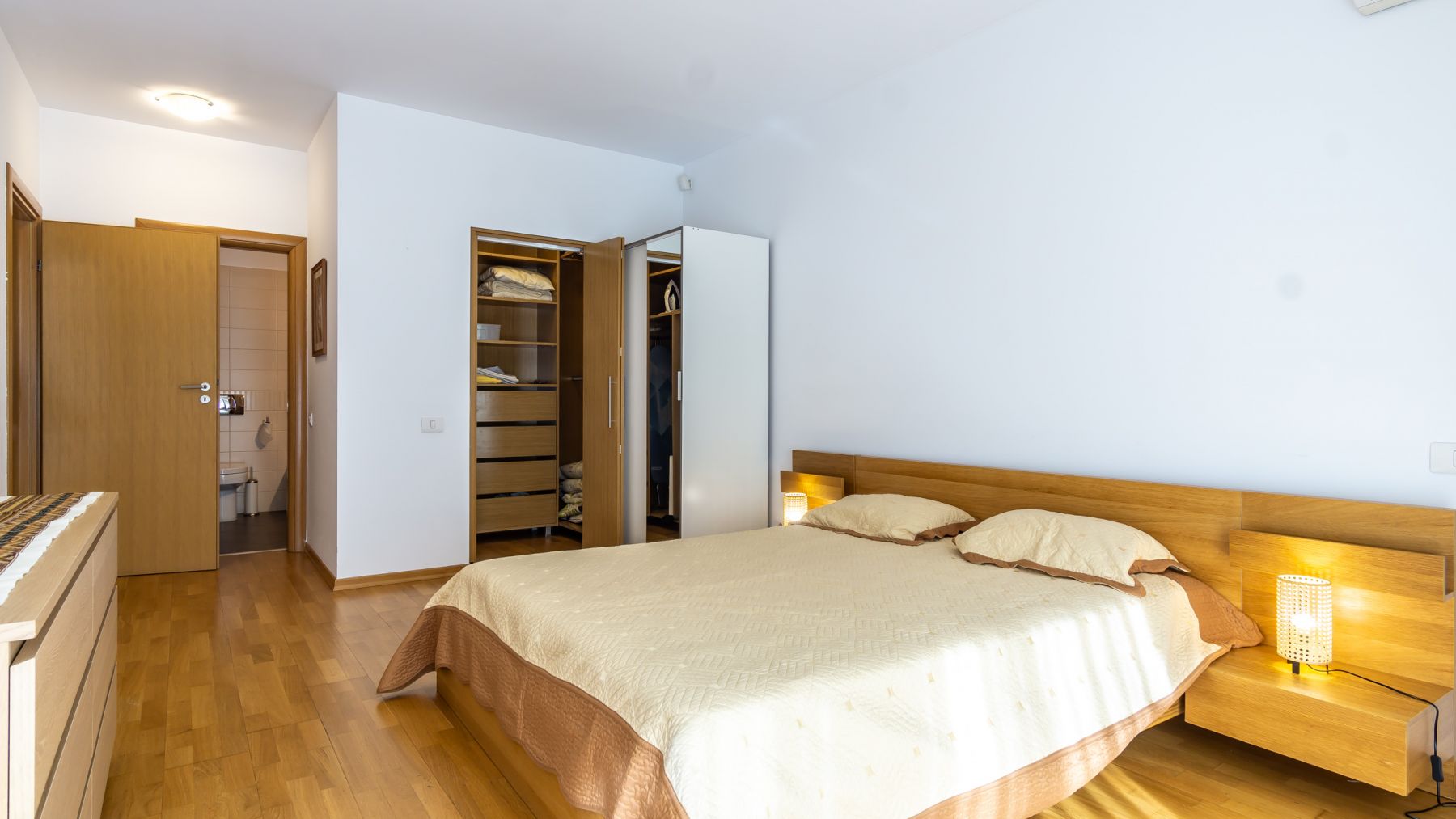 Interior: Living spațios și luminos cu spatiu de dining, mobilat cu canapele din piele, bucătărie inchisa echipată cu electrocasnice de înaltă calitate: cuptor, plită electrica, hota, mașină de spălat vase, cuptor microunde și frigider. Un dormitor matrimonial, ideal pentru familii sau cupluri, dotat cu dressing si baie proprie, decorat cu atenție la detalii. Un al doilea dormitor, perfect pentru lucru de acasă sau ca spațiu suplimentar pentru oaspeți/copii. Baia modernă și elegantă este echipata cu masina de spalat rufe si are finisaje de calitate superioară. Al doilea grup sanitar este dotat cu cabina de dus. Ferestrele de aluminiu tip termopan cu jaluzele electrice si plase de insecte si parchetul de lemn masiv ofera un comfort superior. Dispune de sistem de climatizare si incalzire (centrala termica proprie cu boiler si 3 aparate de aer conditionat) pentru reglarea temperaturii în funcție de preferințele dumneavoastră.