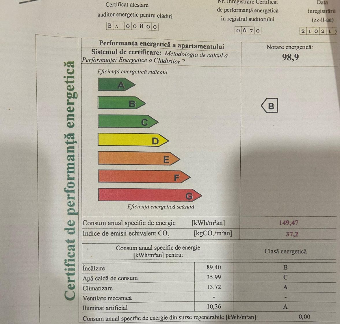 Certificat de performanta energetica eliberat in 2017 cu clasificare B, scor 98,9.