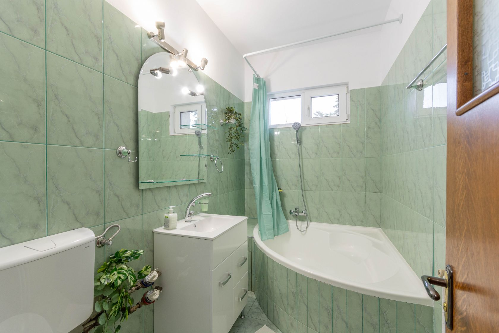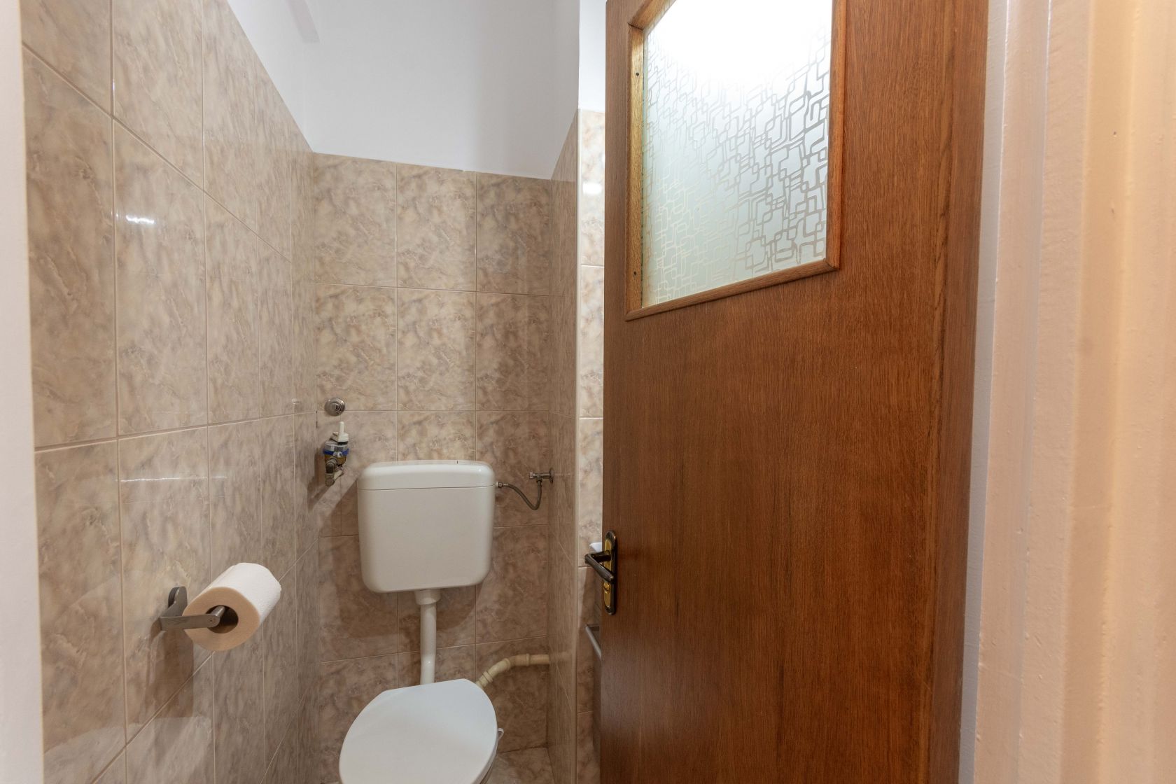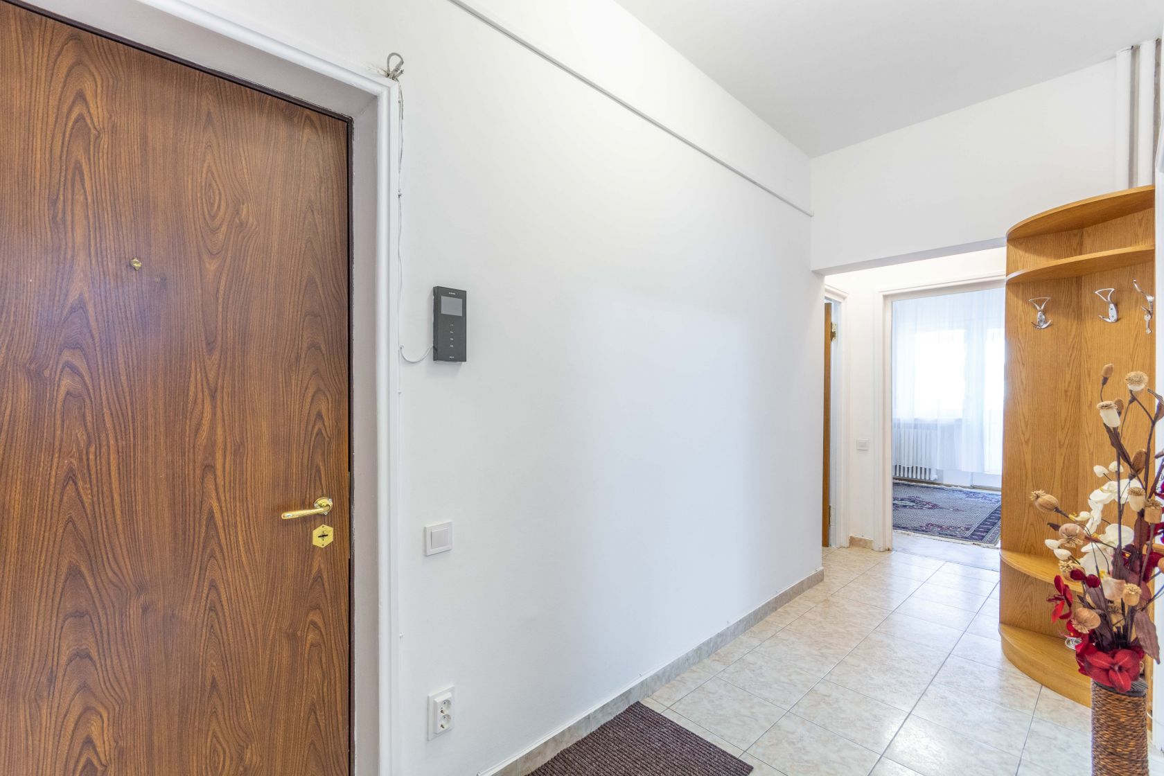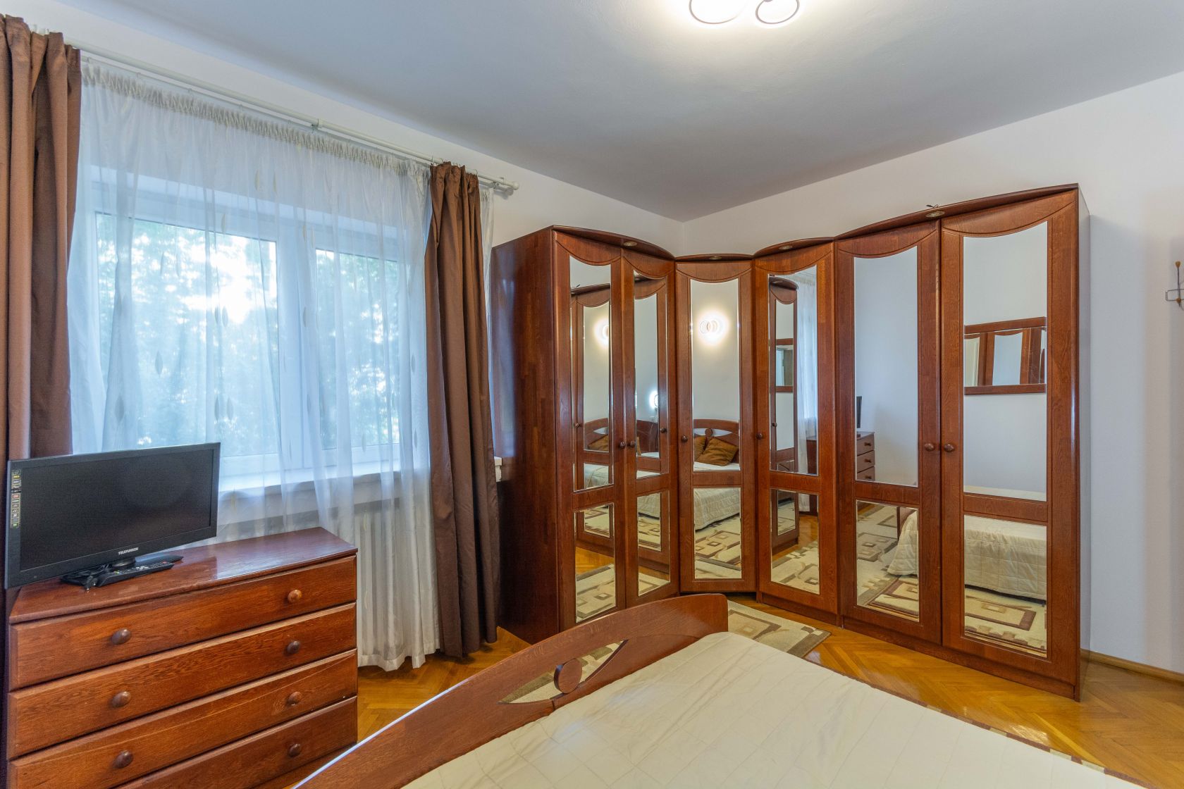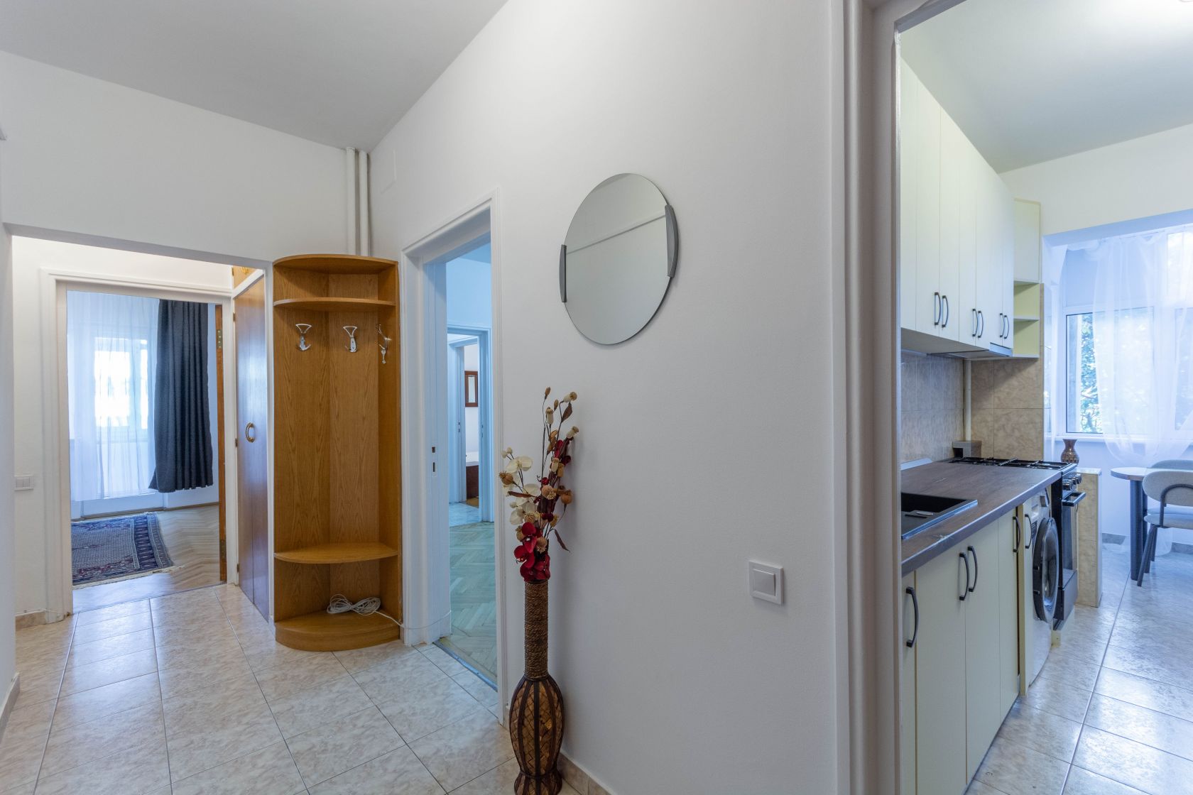 Apoi, din living treci intr-un hol. De pe care in colturi ai cele doua dormitoare. Si intre ele, baia, cu fereastra. Un dormitor este complet mobilat, cu o mobila din lemn masiv elegant care se potriveste perfect in peisaj. Iar cel de-al doilea dormitor gol, gandit drept camera de copil si unde putem aduce mobila necesara unui copil. Dar am lasat asa momentan, pentru a vedea exact ce nevoie are chiriasul. Si acest dormitor are si balcon. Iar din el, iesim spre holul principal ce duce la intrare, acolo unde vom gasi si grupul sanitar. Pentru musafiri, pentru urgente..sa fie! Adica da, avem o baie si un grup sanitar. Ceea ce e bine.