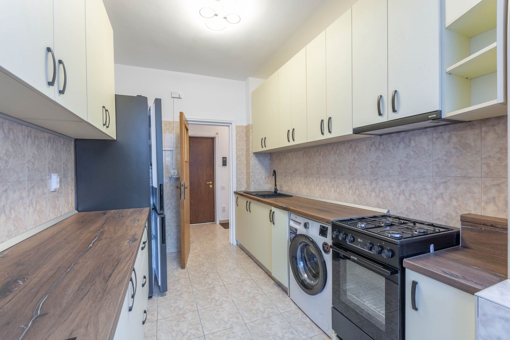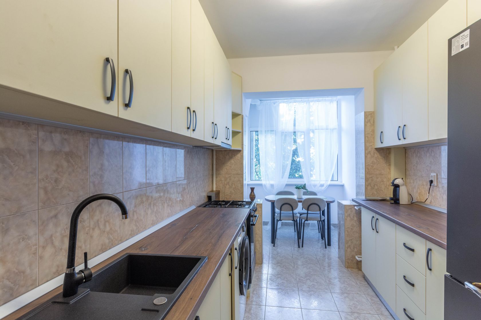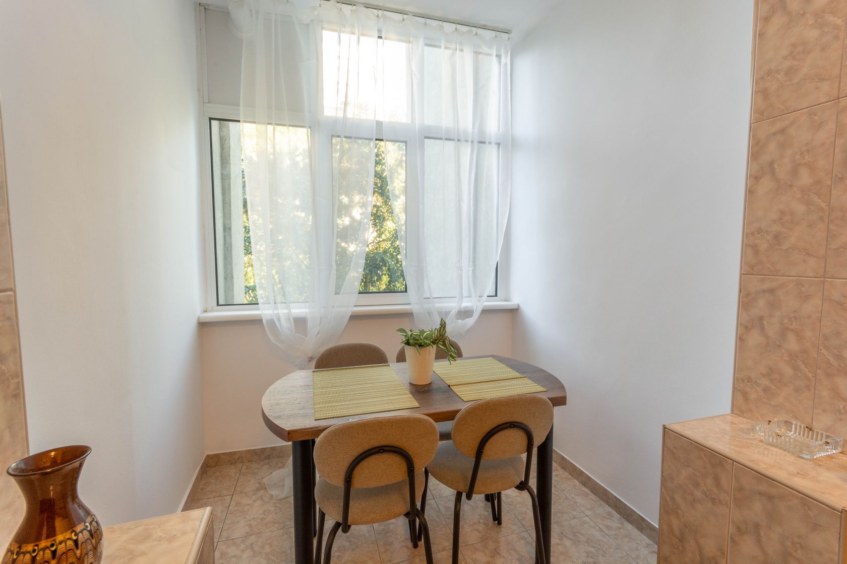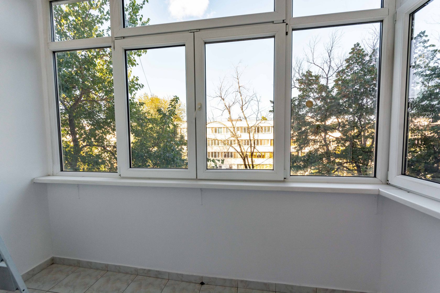 Iar apartamentul..vedeti voi, apartamentul este si el aparte. Sa luam de exemplu suprafata. Peste 80 mp la un apartament de 3 camere..si mai ales unul construit la acele vremuri..E mare! Mare! Si tare fumos impartit! Imaginati-va ca ati deschis usa casei. In fata, aveti o bucatarie mare, luminoasa si complet mobilata si utilata. Electrocasnice noi. In capatul bucatariei, balconul anterior a fost transformat in loc de luat masa. Un loc de luat masa care te face sa te simti ca esti intr-un separeu elegant al unui restaurant de lux. Cu vedere!