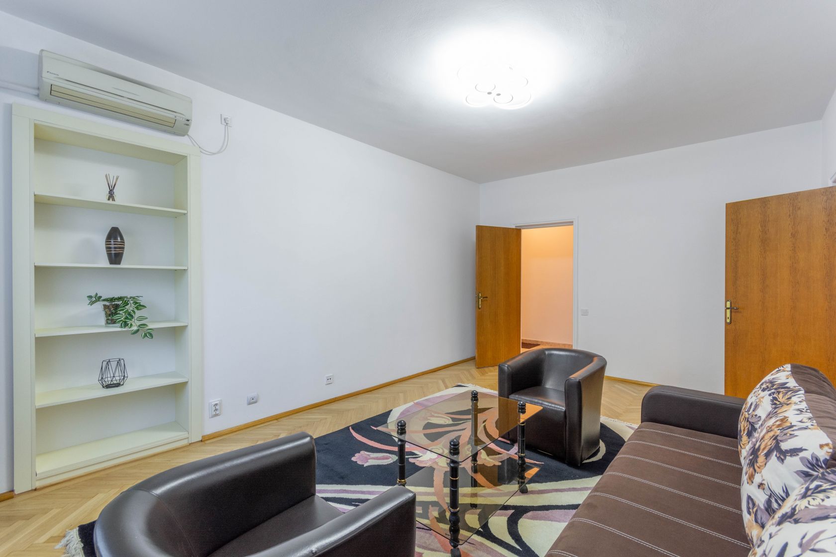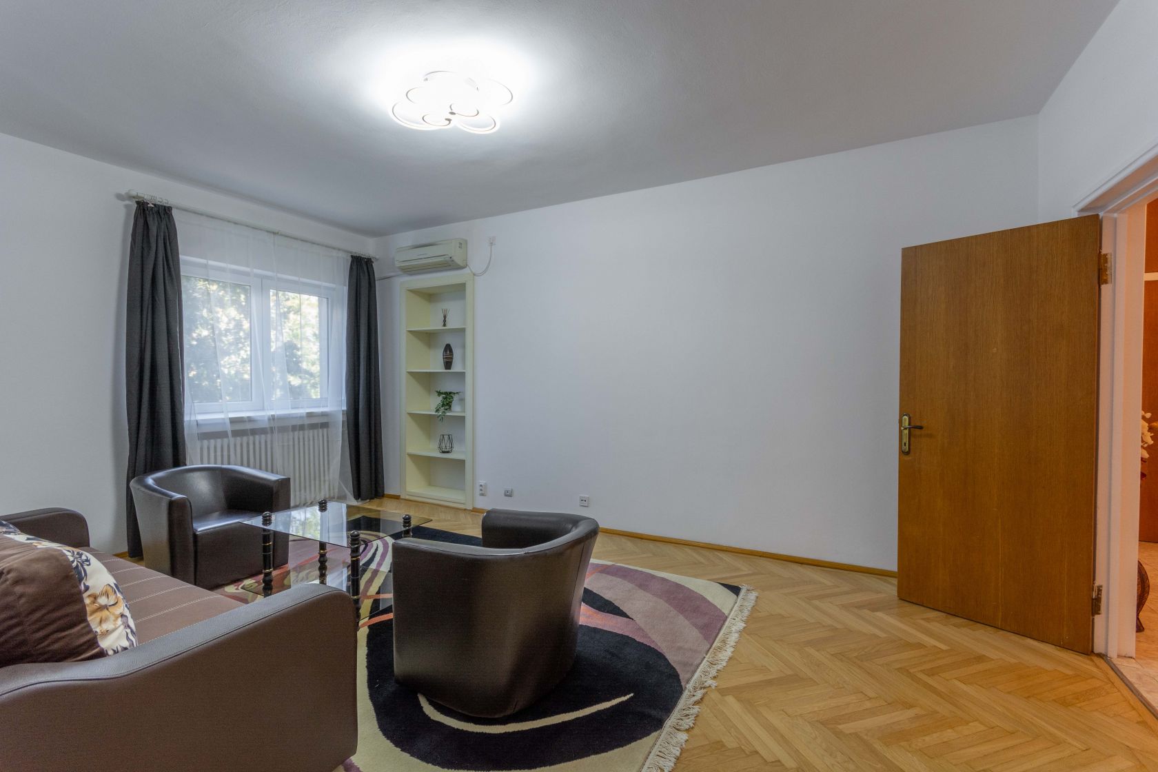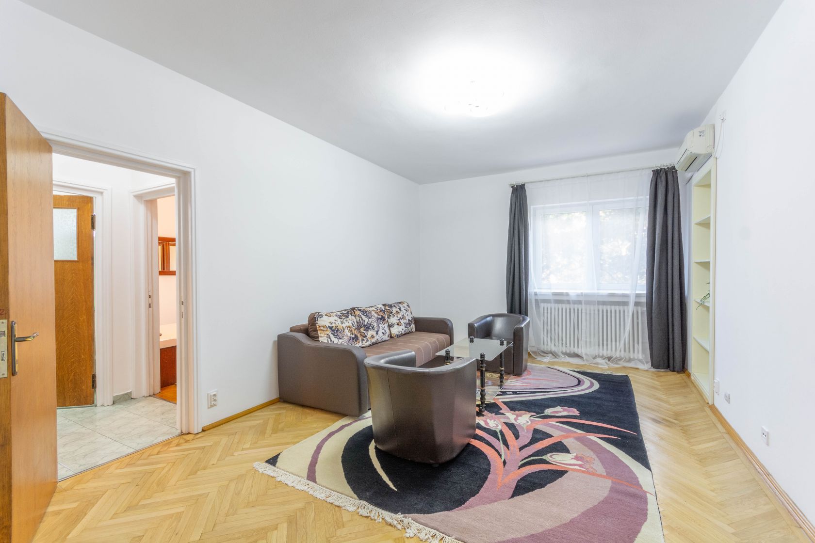 Apoi, in stanga ai un hol mare, larg. Hol din care pe mana dreapta, paralel cu bucataria, ai zona de living. Placut. Aerisit. Mobilat nou. Totul elegant. Inclusiv parchetul masiv de pe jos, care bucura ochiul. Si inima.