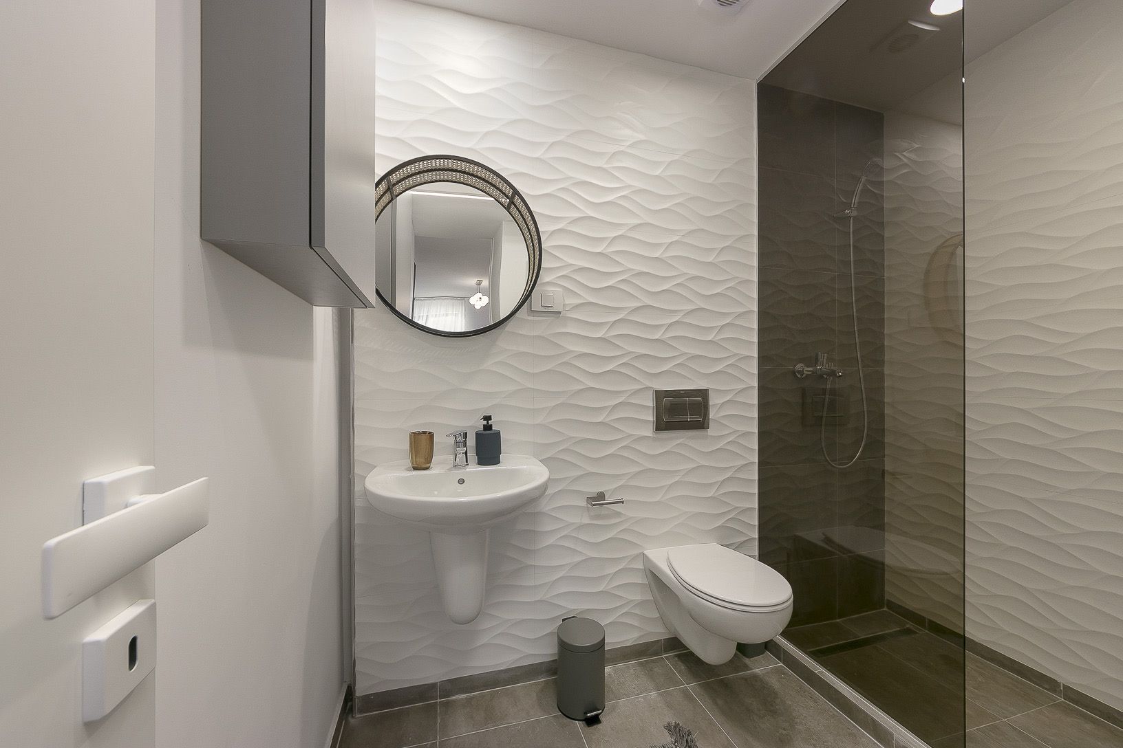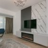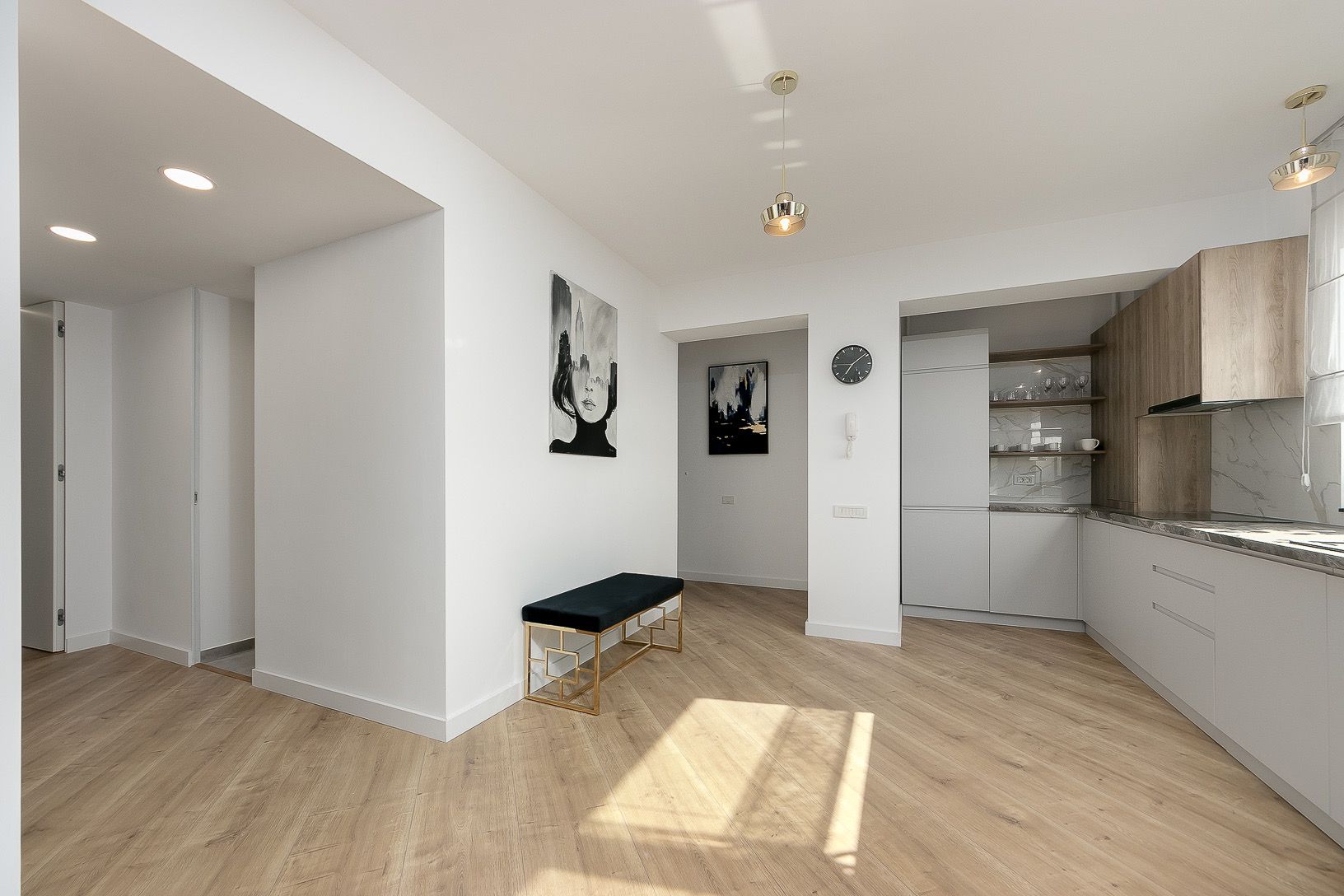 Living open-space: Centrul apartamentului este un living spațios, deschis către bucătărie, ce include o zonă de relaxare decorată cu o canapea confortabilă și un șemineu electric ce oferă sunetul și căldura unuia real. Un ecran TV generos completează această zonă, oferind un spațiu ideal pentru momente de relaxare.