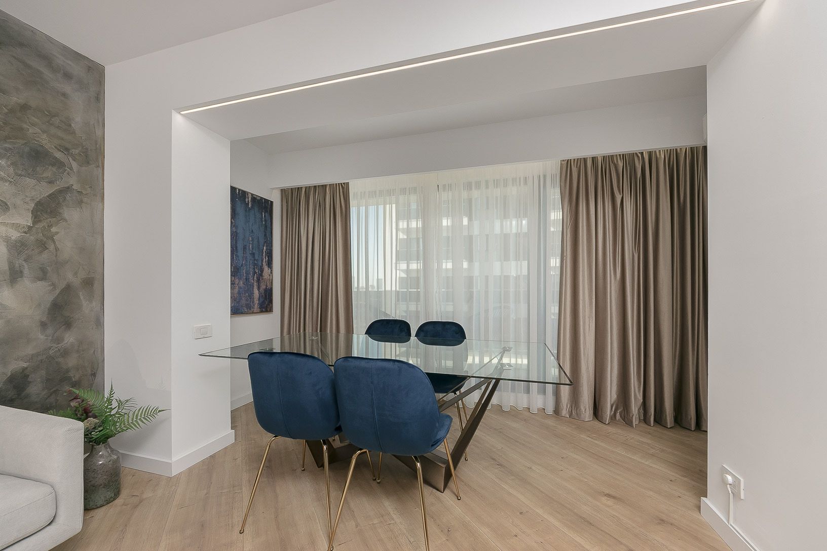 Design premium, în stil modern și elegant: Decorat cu accent pe lux, simplitate și eleganță, apartamentul include elemente de mobilier atent alese, cum ar fi masa de dining Skorpio de la Cattelan Italia, candelabrul FLOS semnat de Gino Sarfatti și canapeaua italiană LeComfort, toate reflectând o atmosferă deosebit de primitoare.