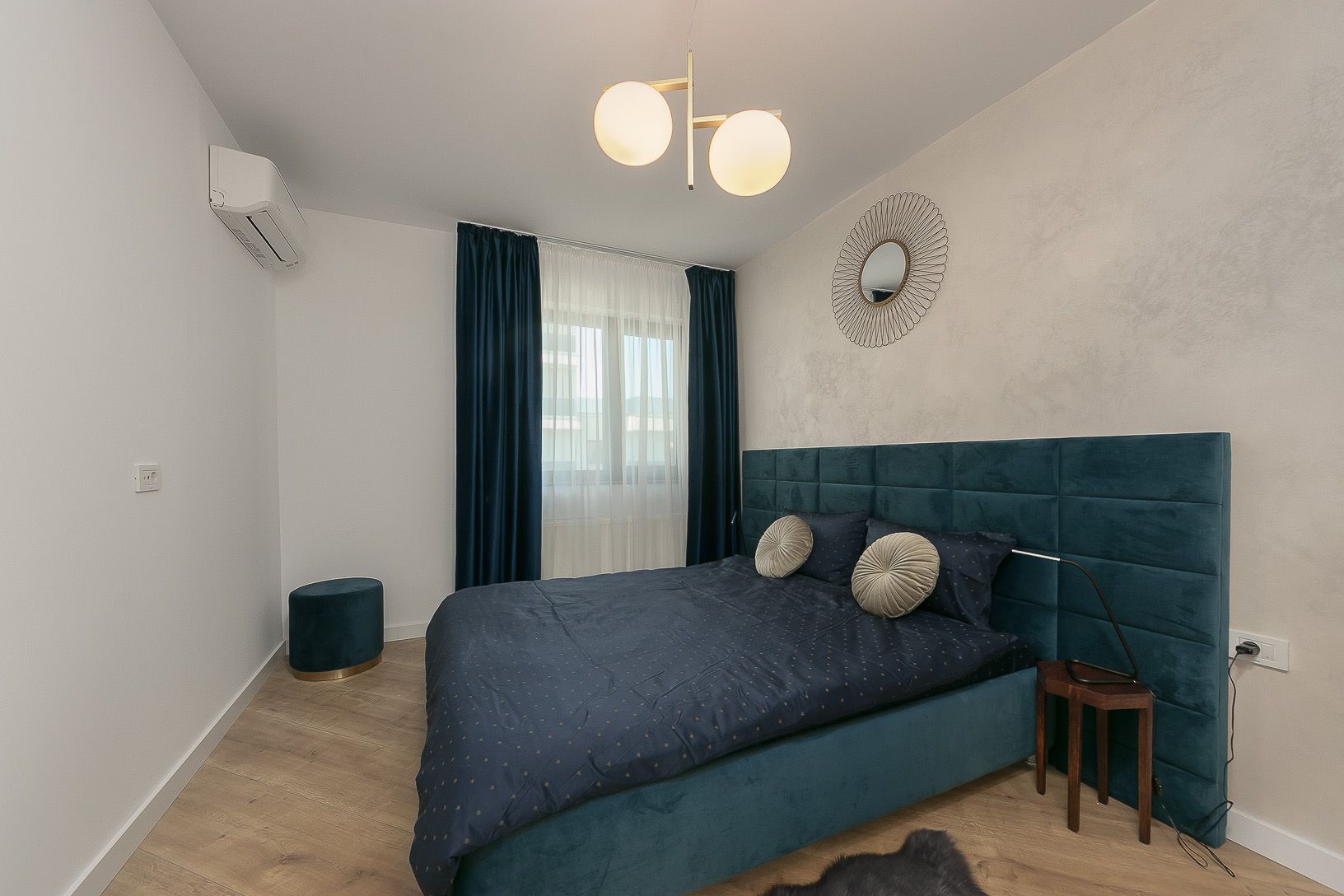 Dormitoare calde și relaxante: Decorate cu textile din catifea și corpuri de iluminat cu lumină difuză, dormitoarele păstrează atmosfera primitoare și relaxantă din restul apartamentului, oferind un refugiu liniștit și elegant.