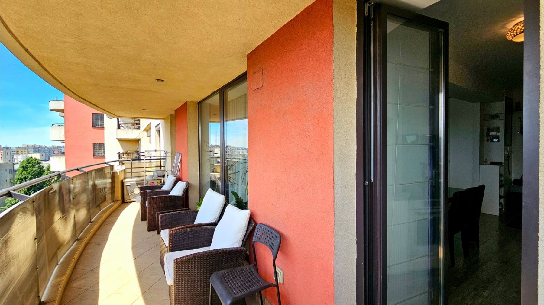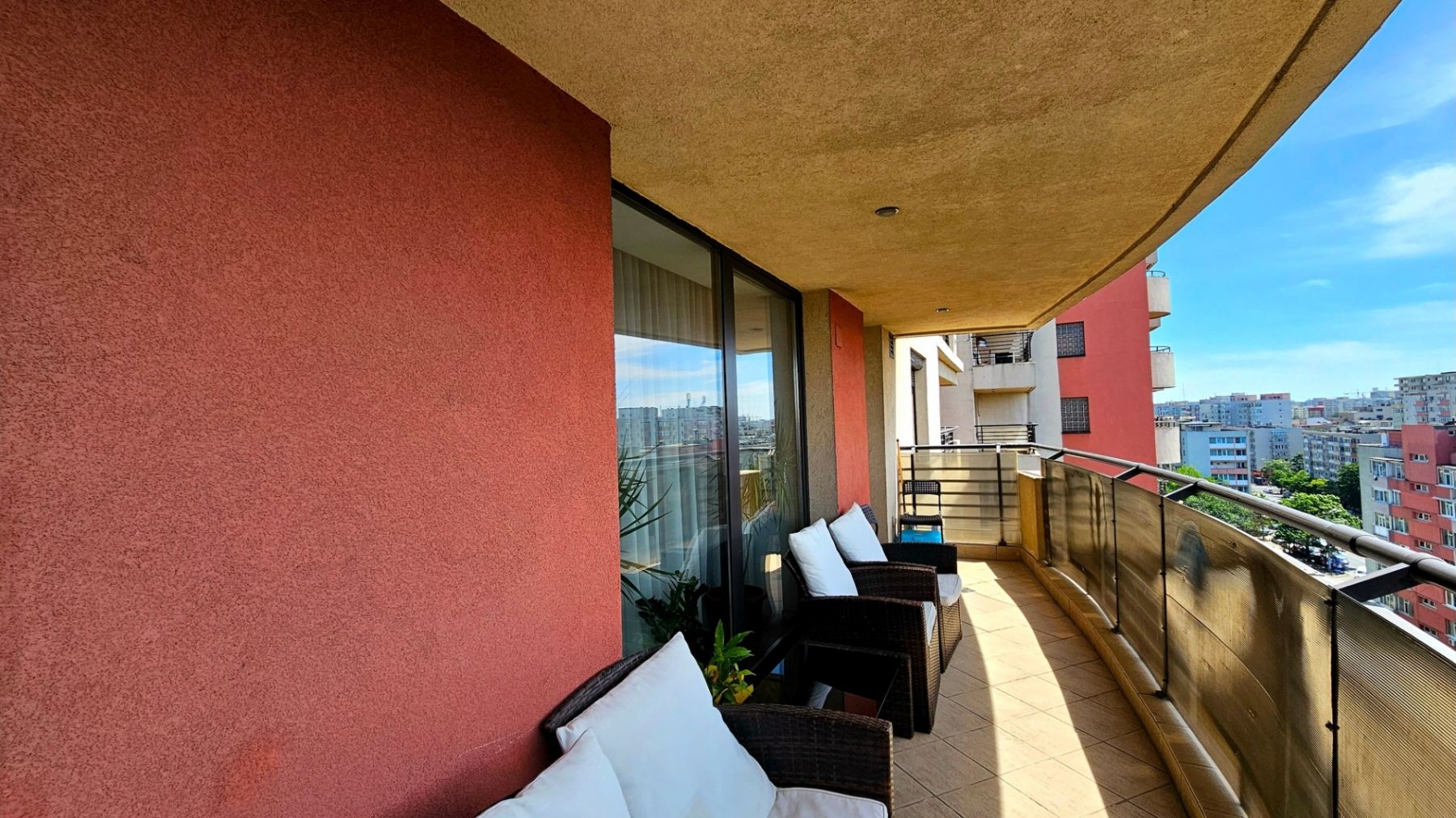 Vedere Liberă: Terasa generoasă cu ferestre mari și vedere impresionantă spre Casa Poporului.