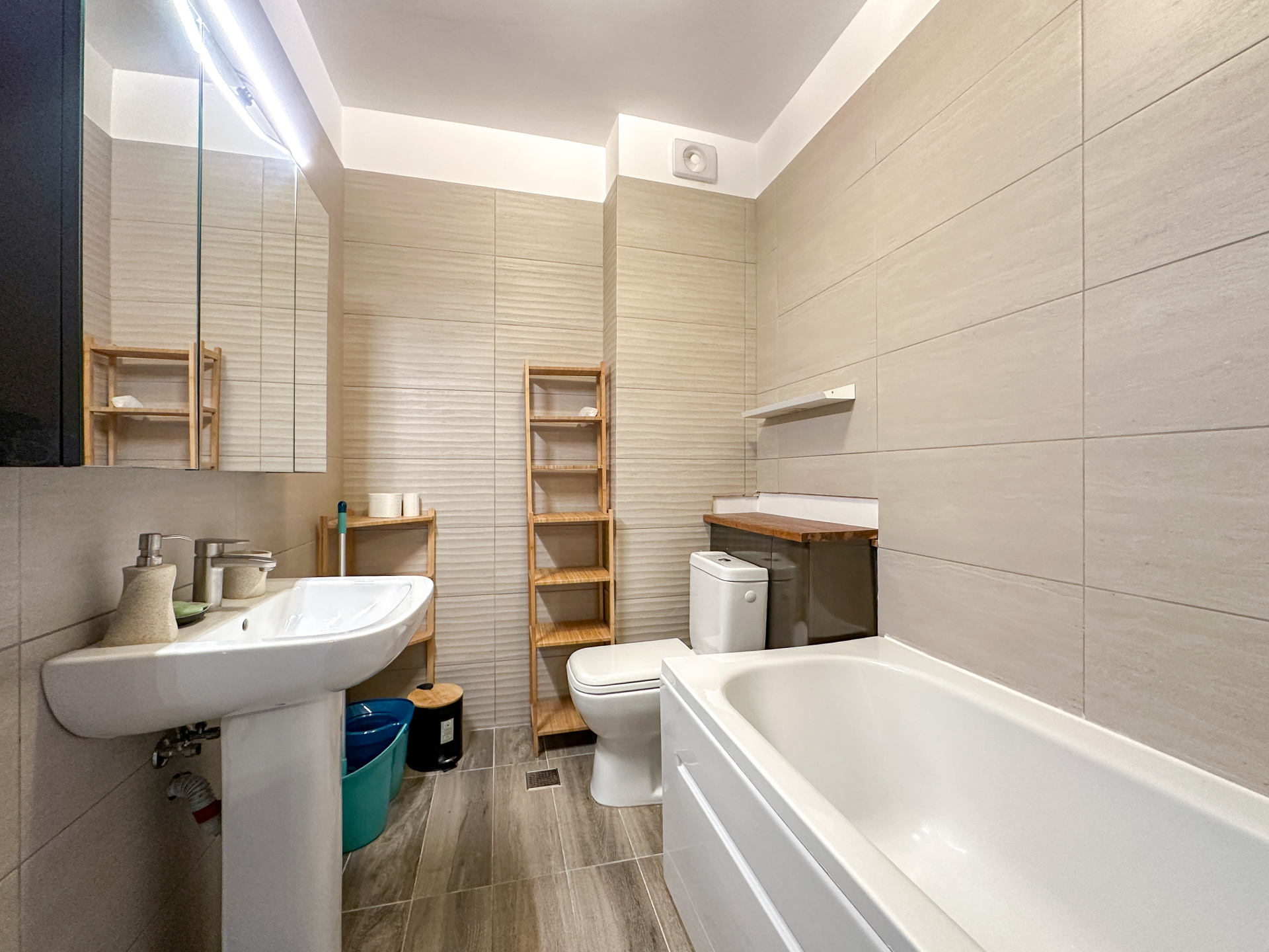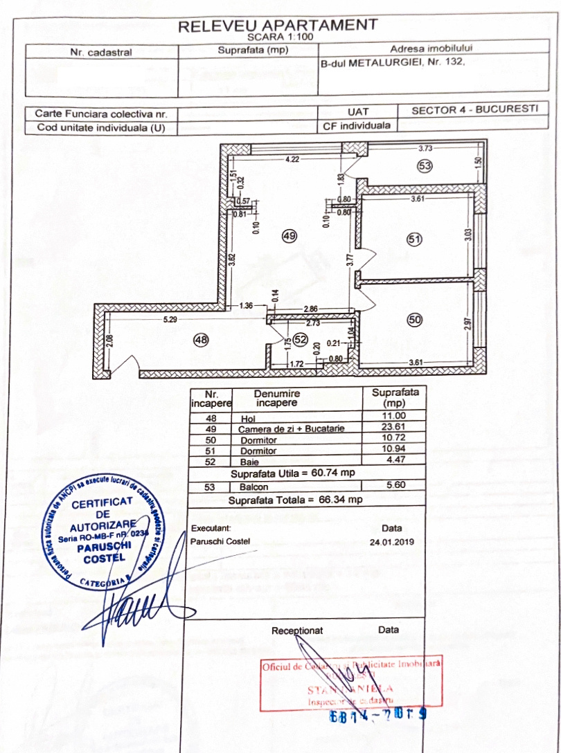 Apartamentul are o suprafață de 60,74 mp utili + un balcon 5,60 mp, și următoarele dotări/caracteristici: