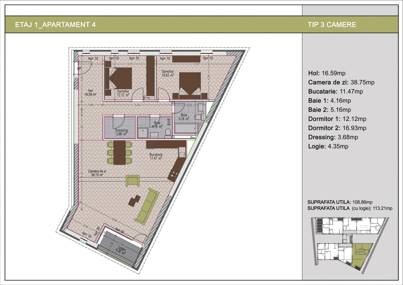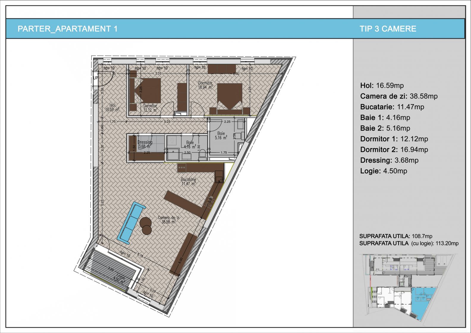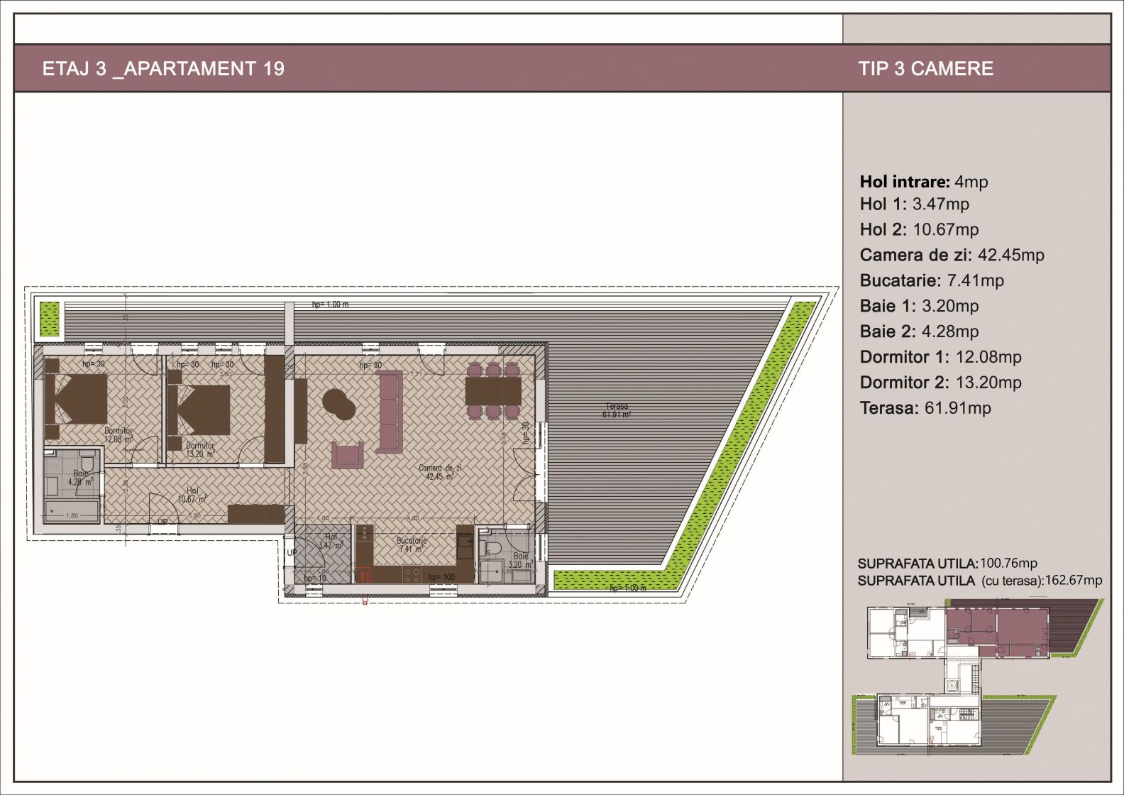Suprafata totala: 101mp utili + 62mp terasa = peste 163mp spatiu total