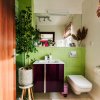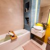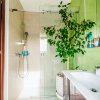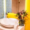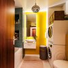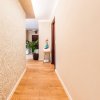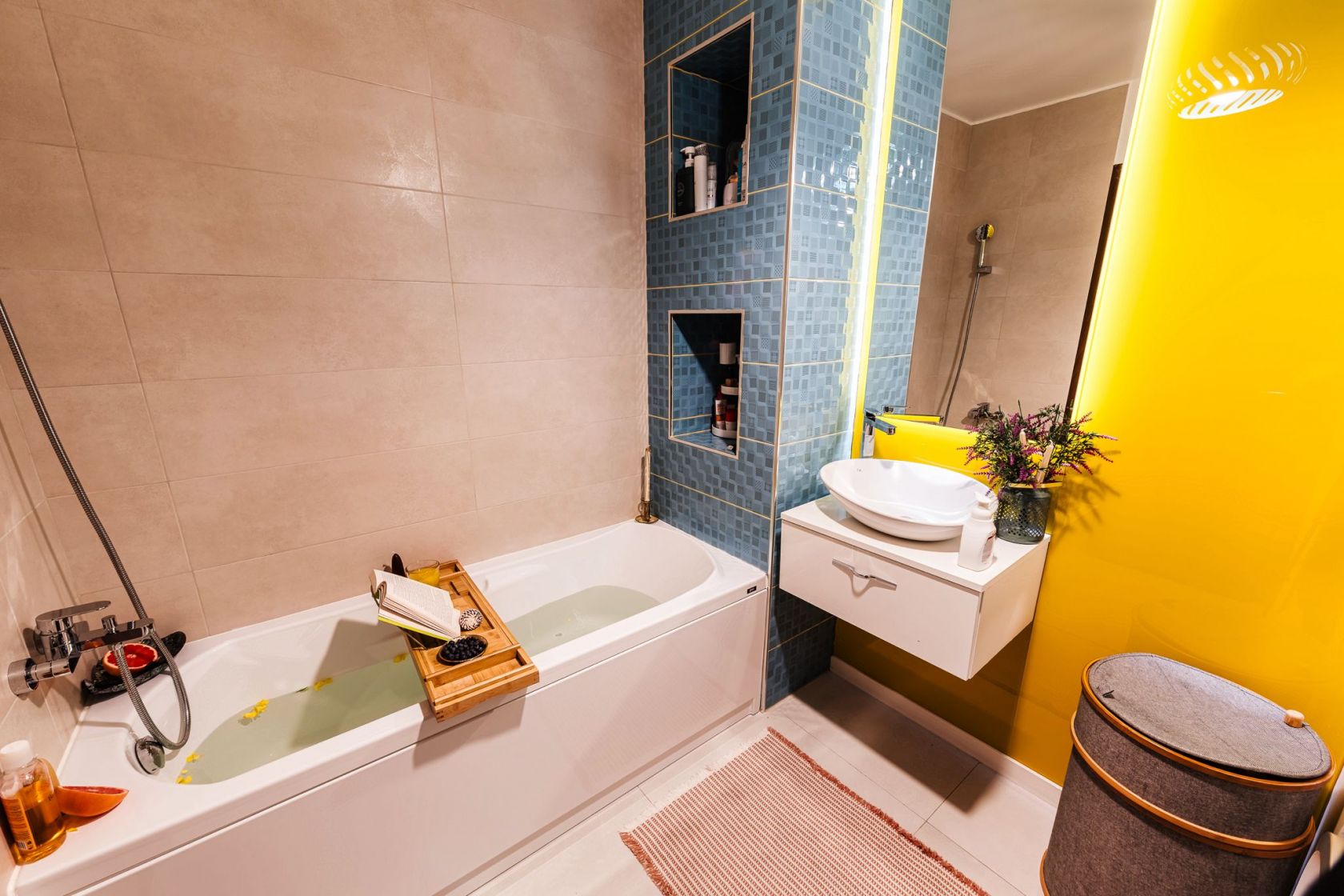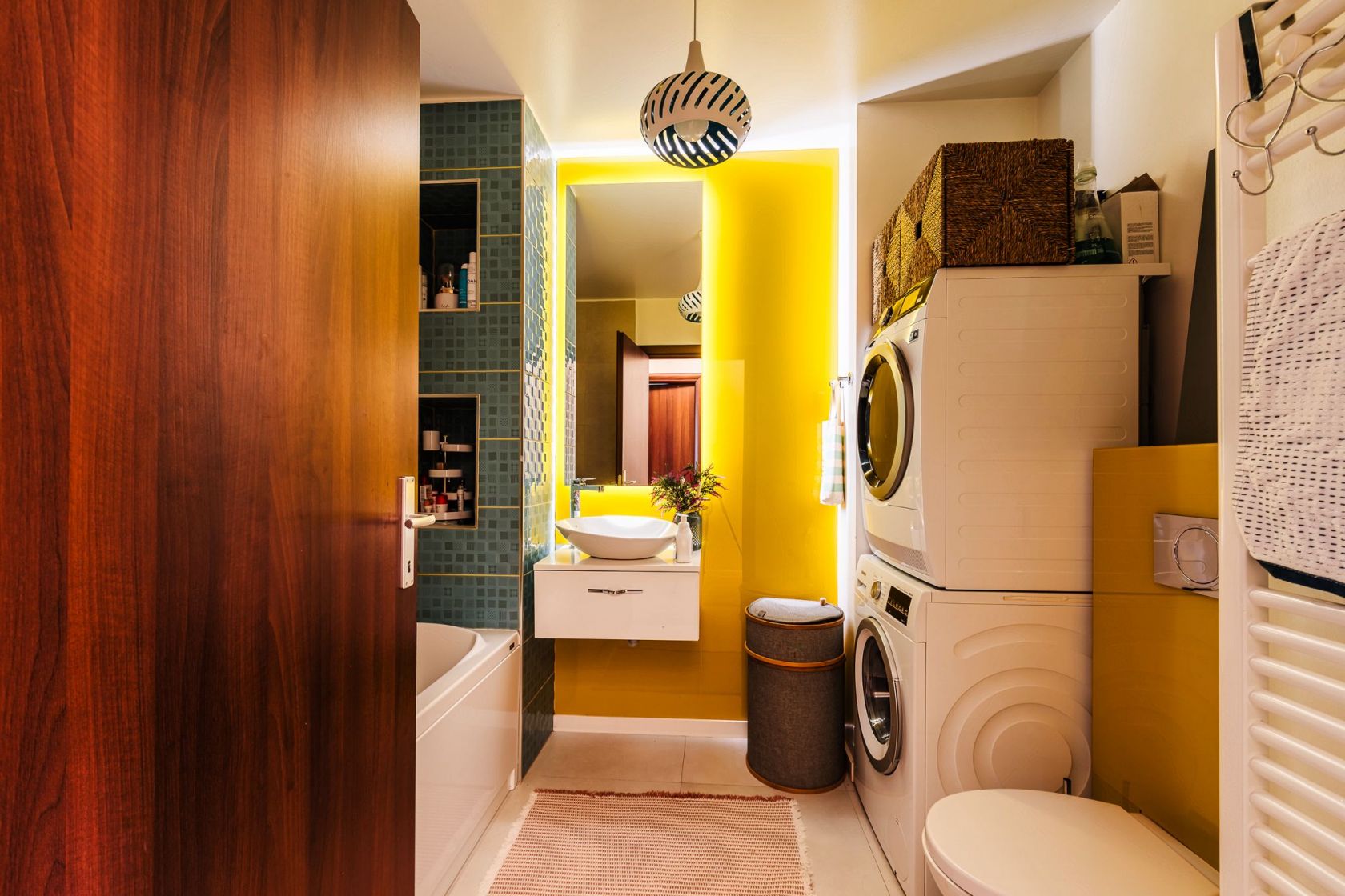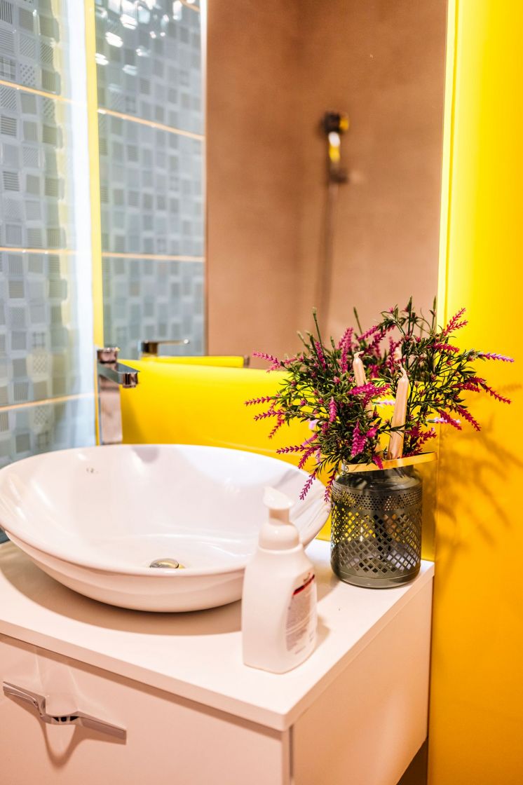 Baia de pe hol are un perete placat cu sticla galbena si o oglinda prevazuta cu led, bateriile sunt tot Porcelanosa ca si vasul de toaleta, iar chiuveta, cada si mobila de baie au fost achizitionate de la Diseno. Baia are suficient spatiu pentru masina de spalat si uscator suprapuse.
