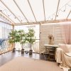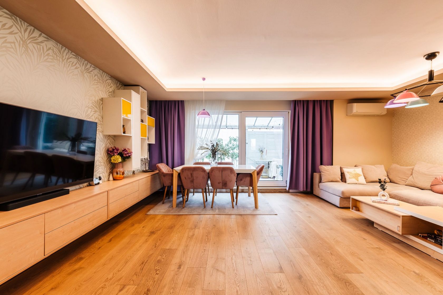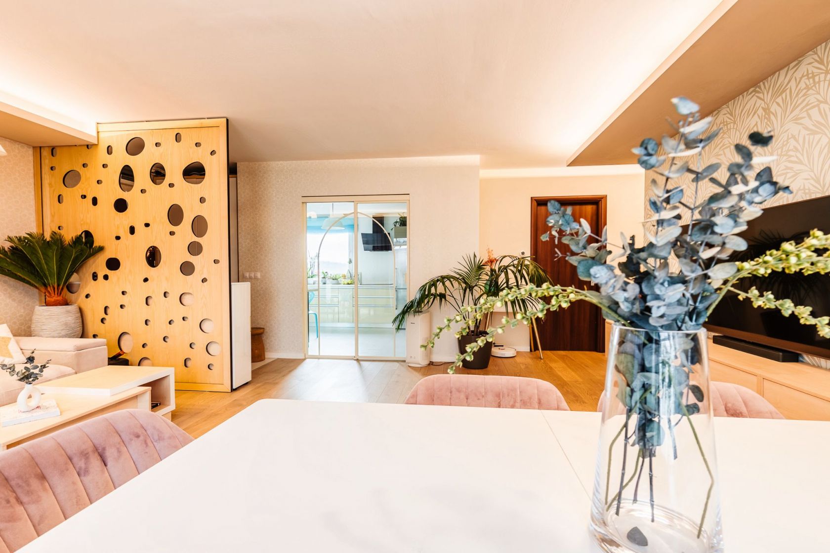 Iluminarea din living este completata de o scafa facuta pe comanda, care strabate tot holul pana in zona dormitoarelor prevazuta cu banda led. Masa si scaunele din catifea roz sunt de la Bonami.