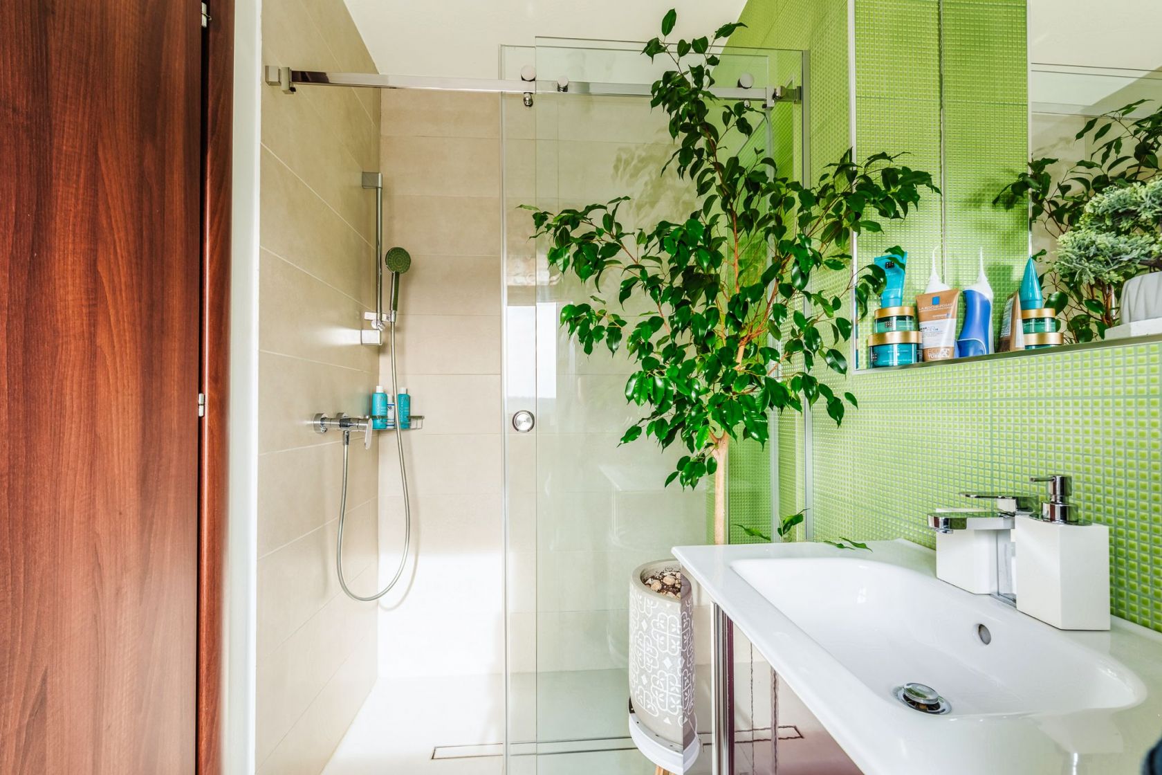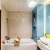 Dormitorul are baie proprie cu dus walk-in prevazut cu usa glisanta de sticla, cu baterii Porcelanosa si vas de toaleta Villeroy&Boch. Chiuveta si corpul de mobilier sunt de la Diseno ca si gresia din intreg apartamentul.