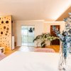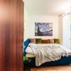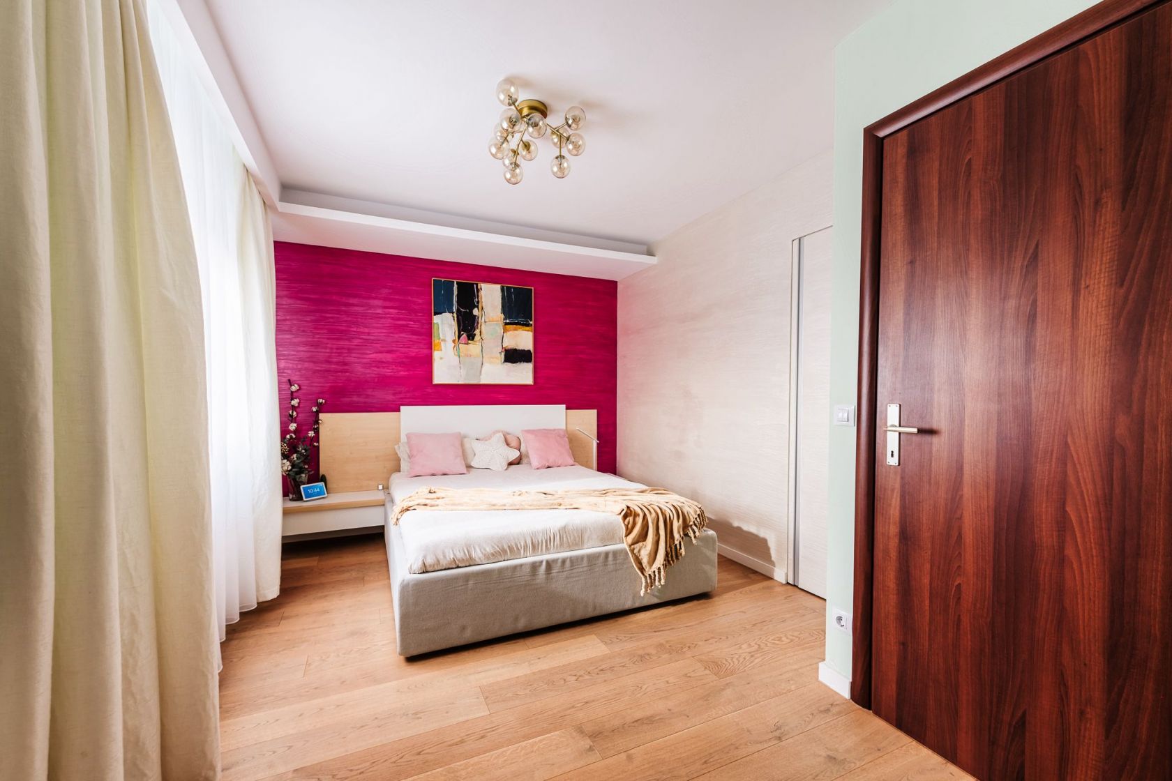 Dormitorul matrimonial include un pat Divanissimi cu lada de depozitare, dulap cu TV alb LG montat pe suport lucrat pe comanda. Accesul in dressingul walk-in se face folosingd o usa Filomuro.