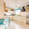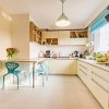 Mobila din bucatarie, este pe comanda, din MDF lucios este prevazuta cu banda led deasupra blatului si include electrocasnice incorporabile Bosh (cuptor, cuptor cu microunde, frigider 70 cm latime) si masina de spalat vase Siemens. Hota este decorativa din sticla neagra de la Beko, iar plita electrica Electrolux. Chiuveta din granit negru si bateria sunt de la Franke. Exista montat pe blat si un sistem de filtrare a apei Aqua Sana. Centrala termica este marca Viessman cu boiler de 120 l si este situata in camera tehnica.. Bucataria este prevazuta si ea cu TV montat pe perete-Samsung.