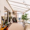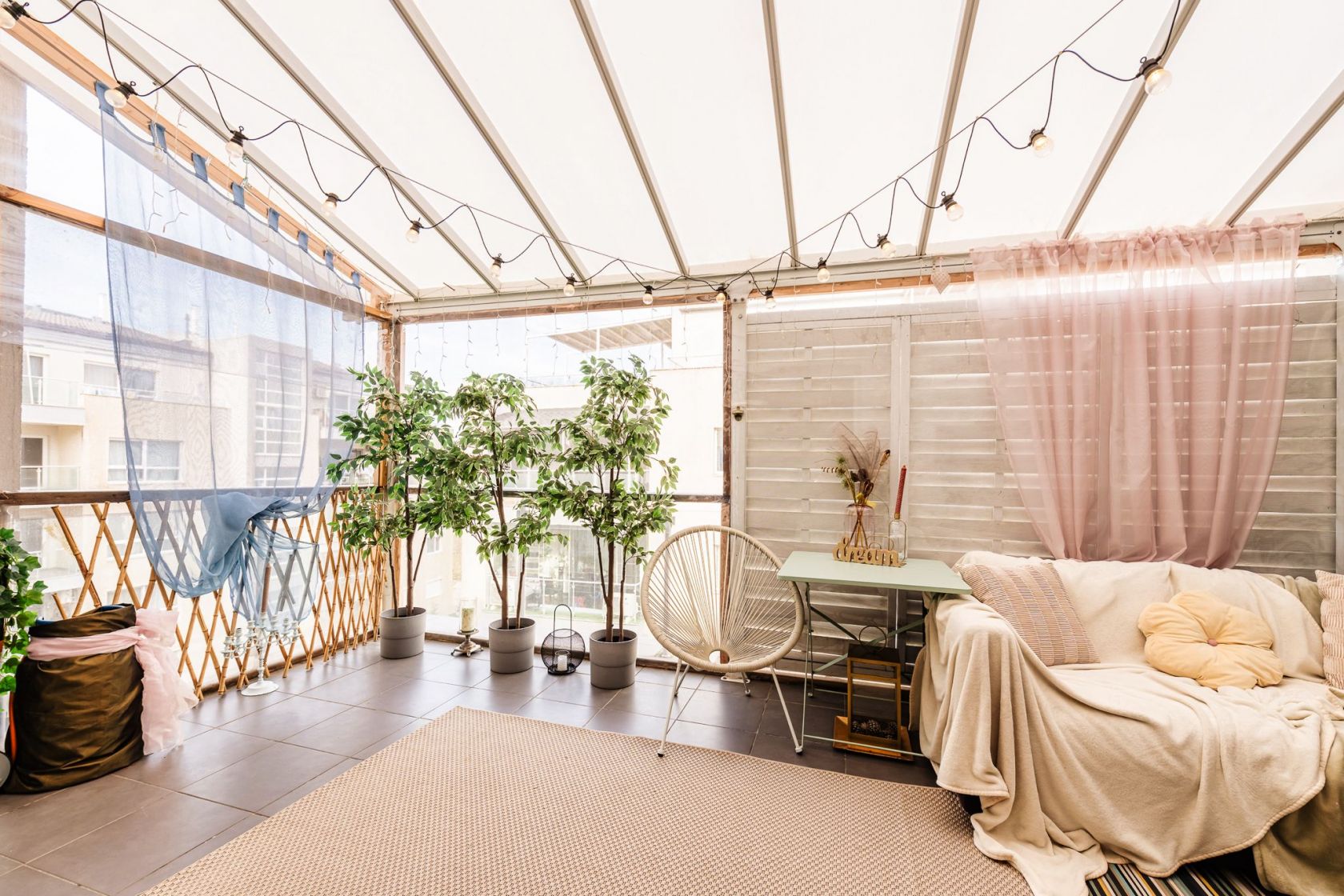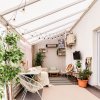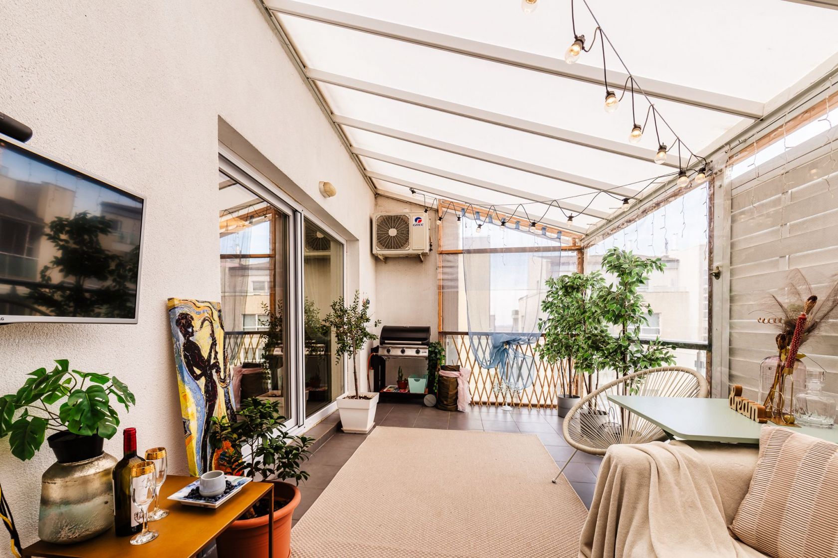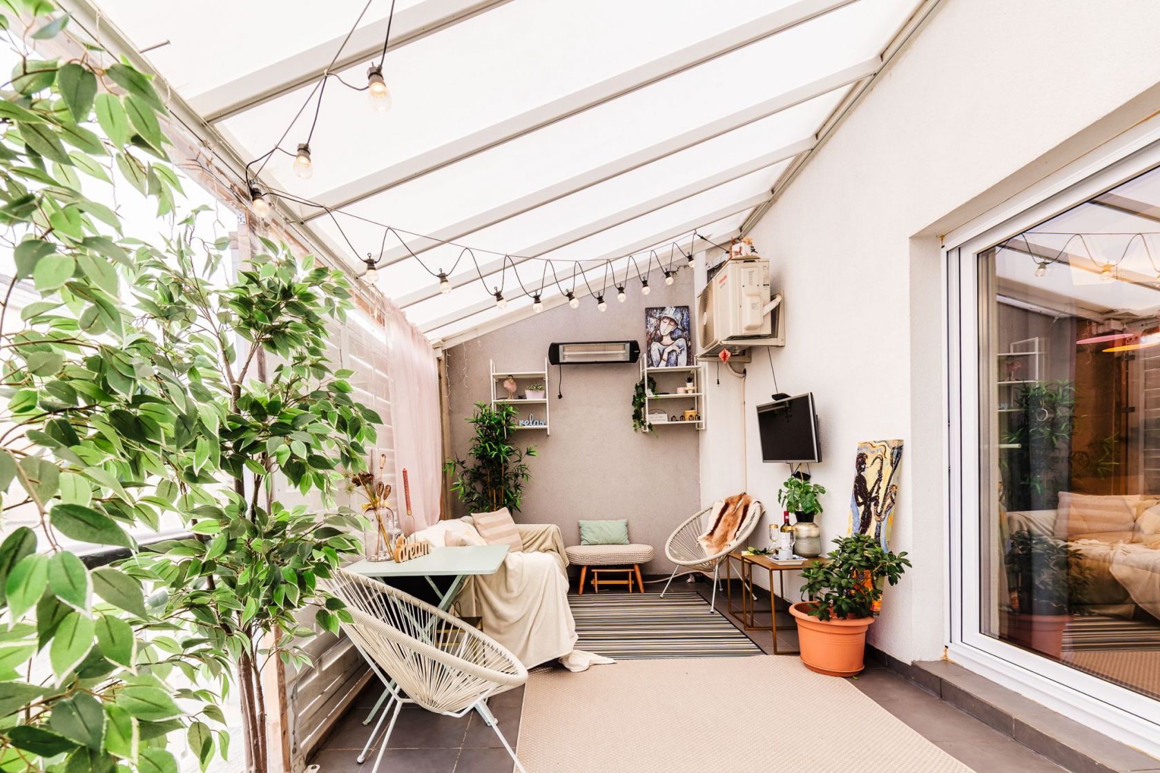 Terasa este acoperita si amenajata ca si camera de relaxare si este prevazuta cu incalzitor, TV si o canapea comoda Ikea.