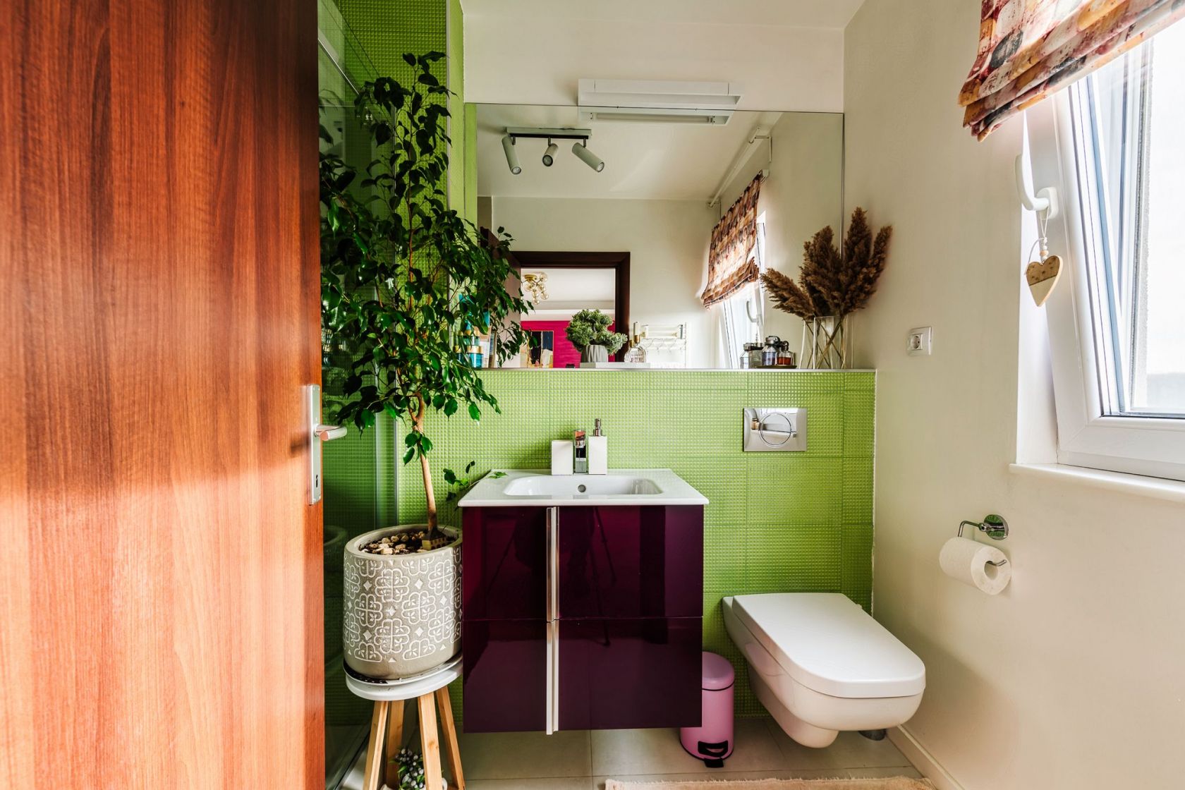 Biroul include un corp de iluminat statement achizitionat de la Ioooi si o jaluzea moderna din lemn.