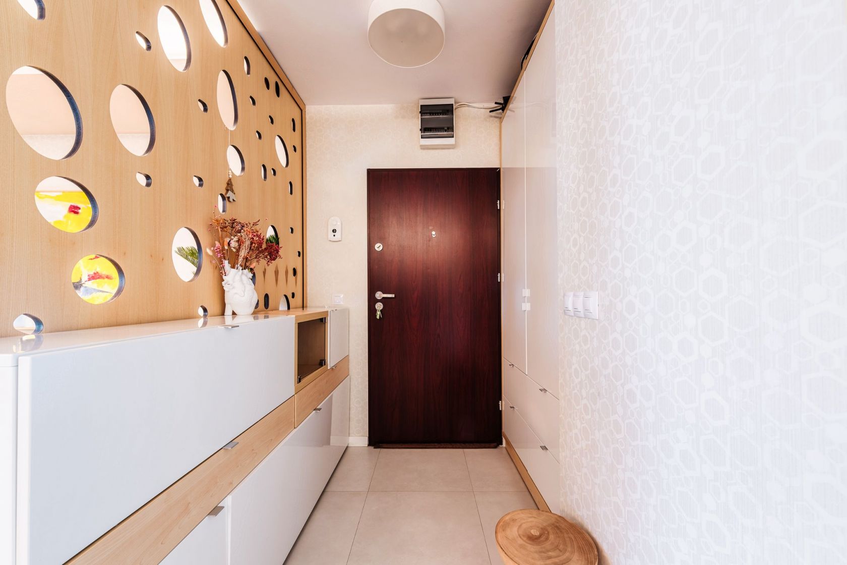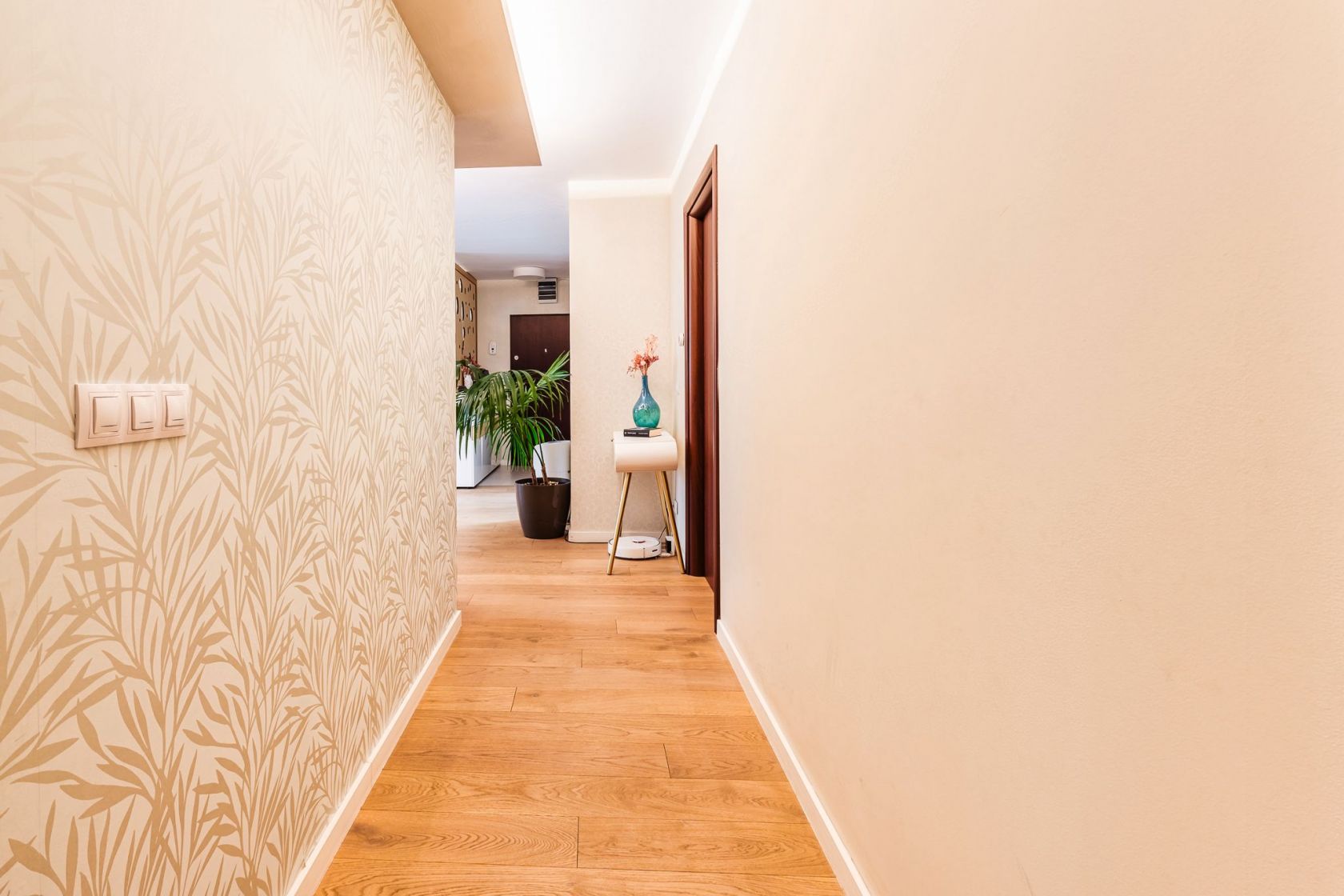 Inca din hol ne intampina un panou decorativ din lemn masiv ce ne face sa simtim ca am pasit intr-o proprietate cu adevarat deosebita, calda si primitoare. Pardoseala din toata casa este, de tip dusumea, din lemn masiv si plinta duropolimer.