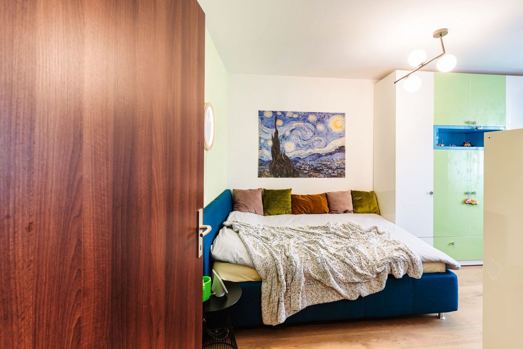 Dormitorul copilului include un pat generos achzitionat de la Kika, o veioza Moon deasupra patului care creeaza a atmosfera magica seara si o reproducere Van Gogh de la Europosters.
