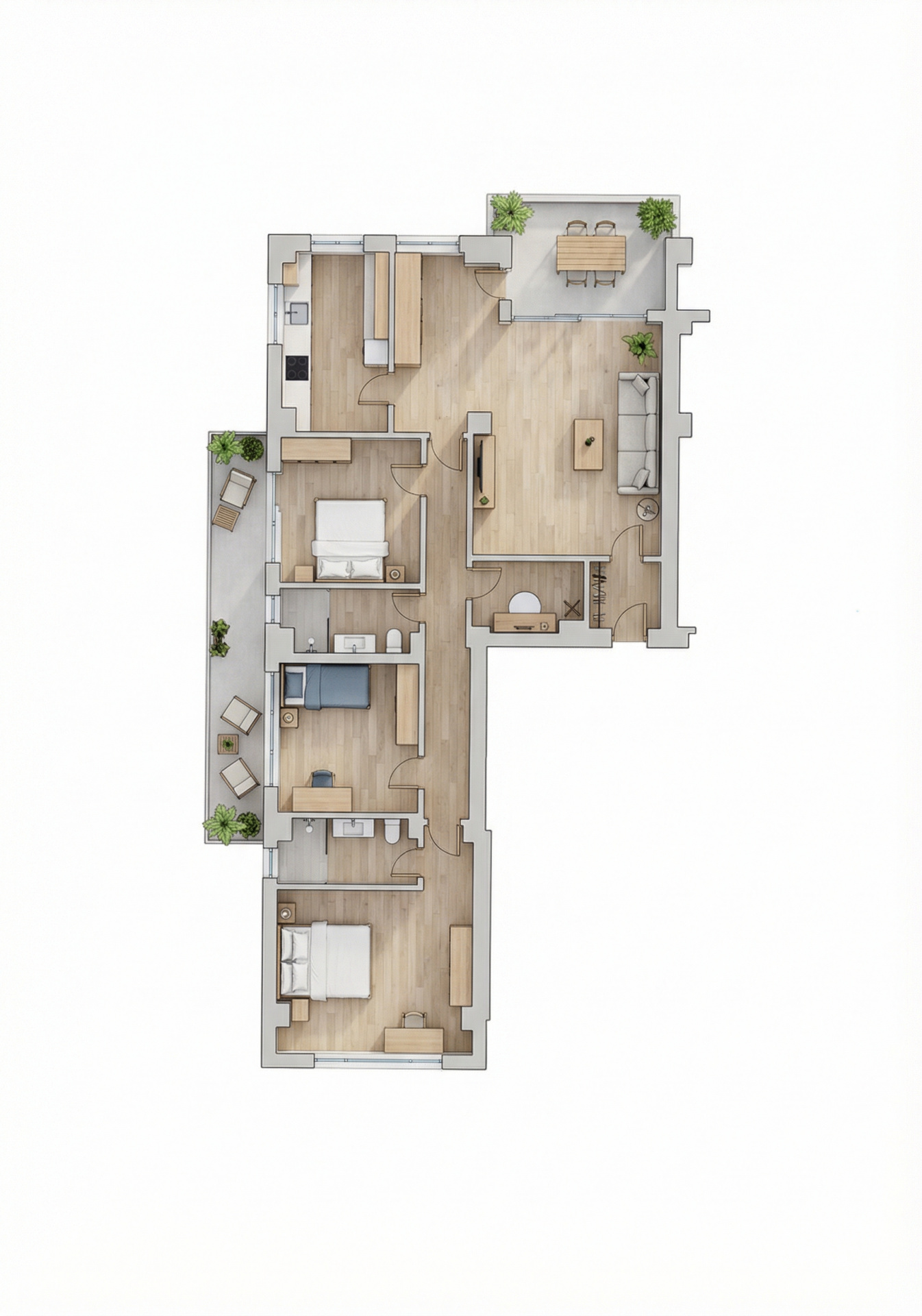 Compartimentare: living + dining, bucătărie separată, 3 dormitoare, 3 băi