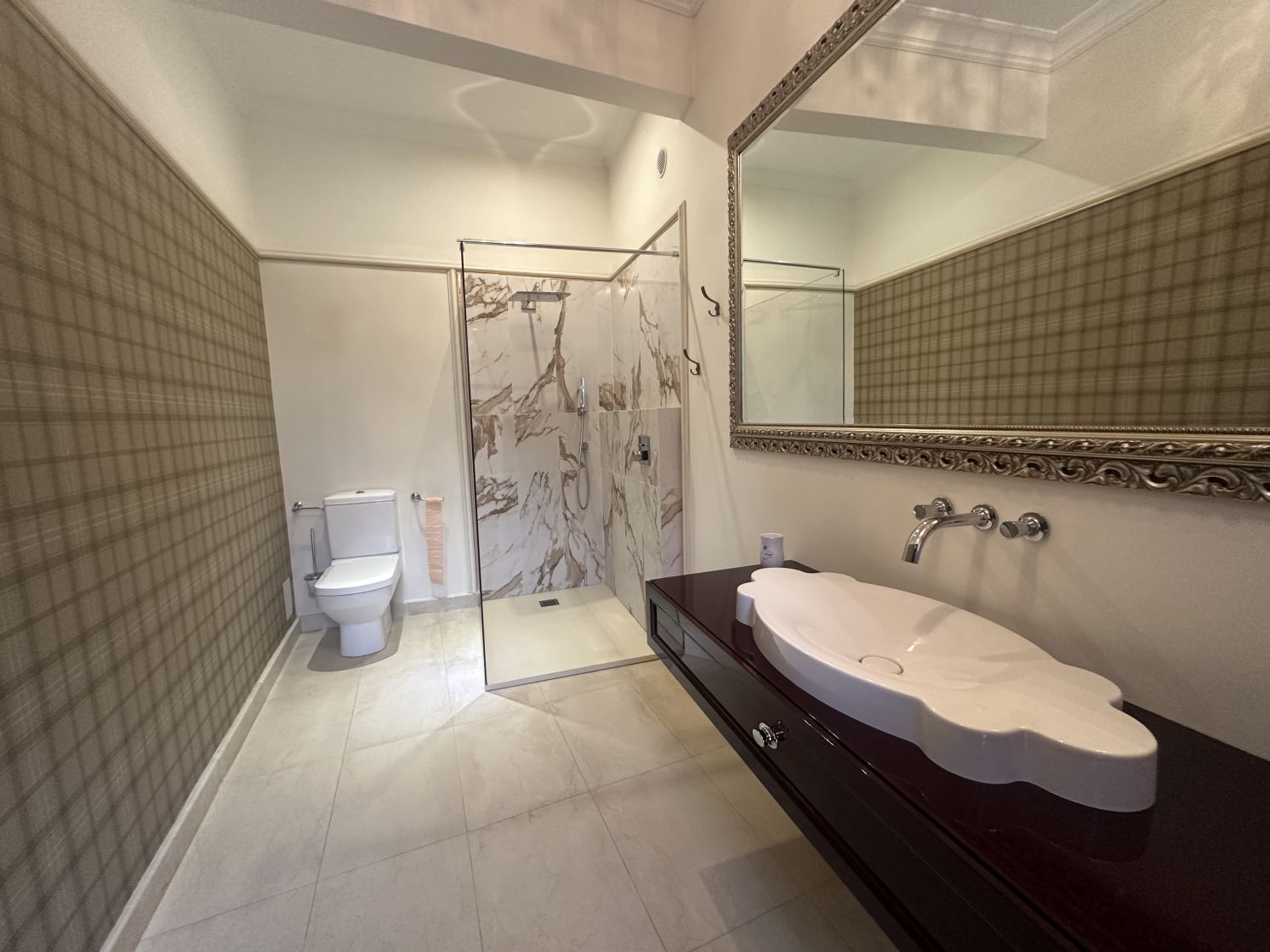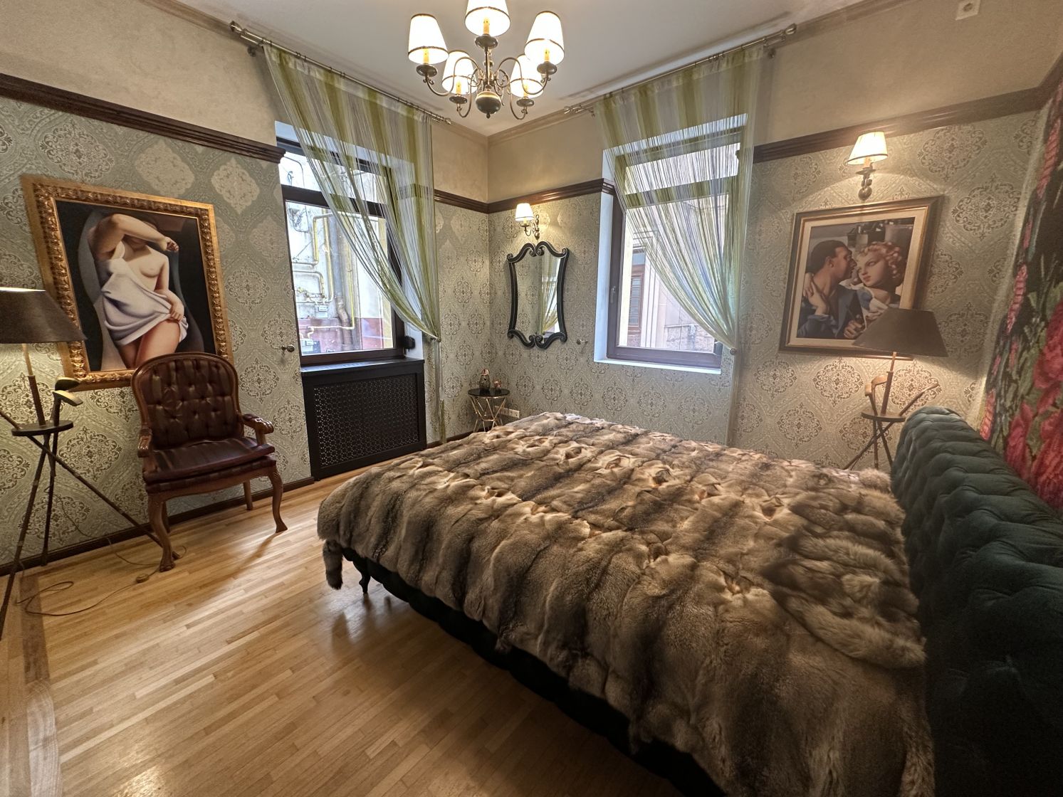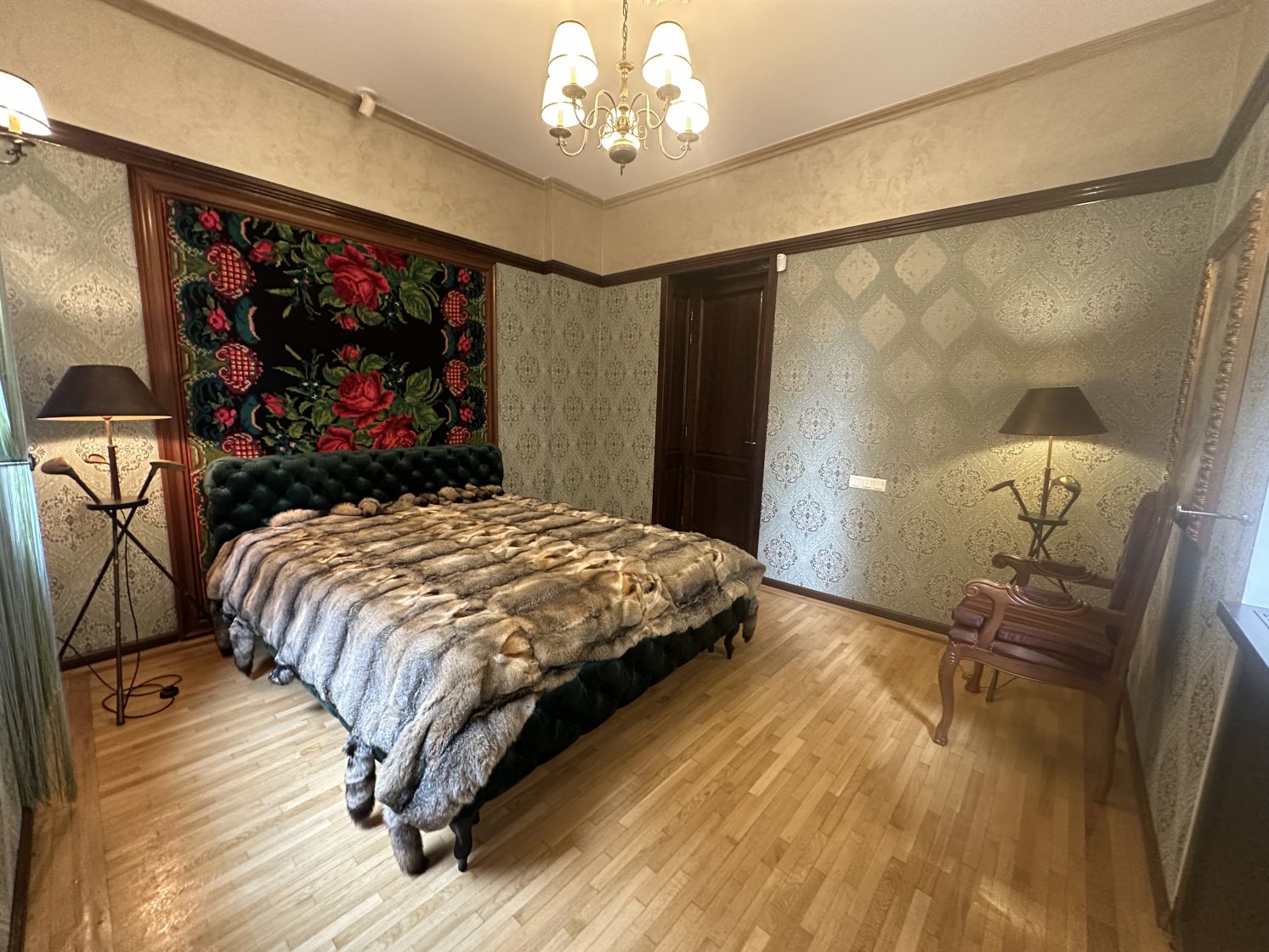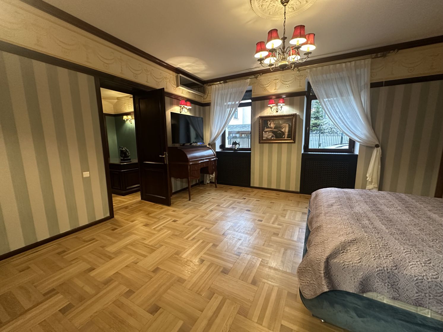 Apartamentul este total mobilat si utilat, are suprafata de 190 mp, 6 camere, 2 camere tip dressing, bucataria cu camara si centrala termica, 3 bai cu fereastra, tavanului este inalt de 3 m, iar balconul transformat intr-o camera-seif.