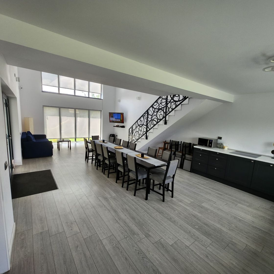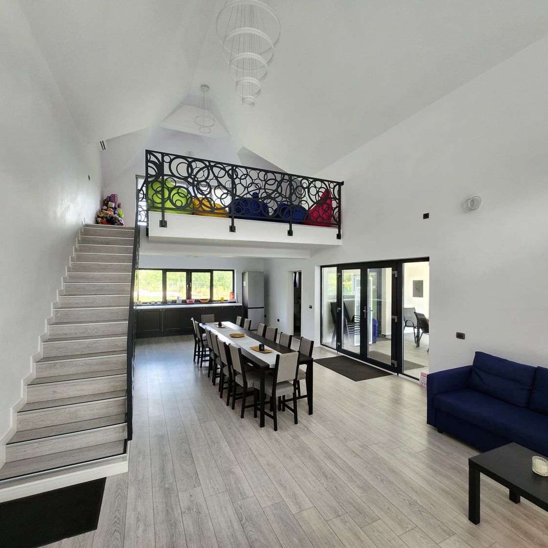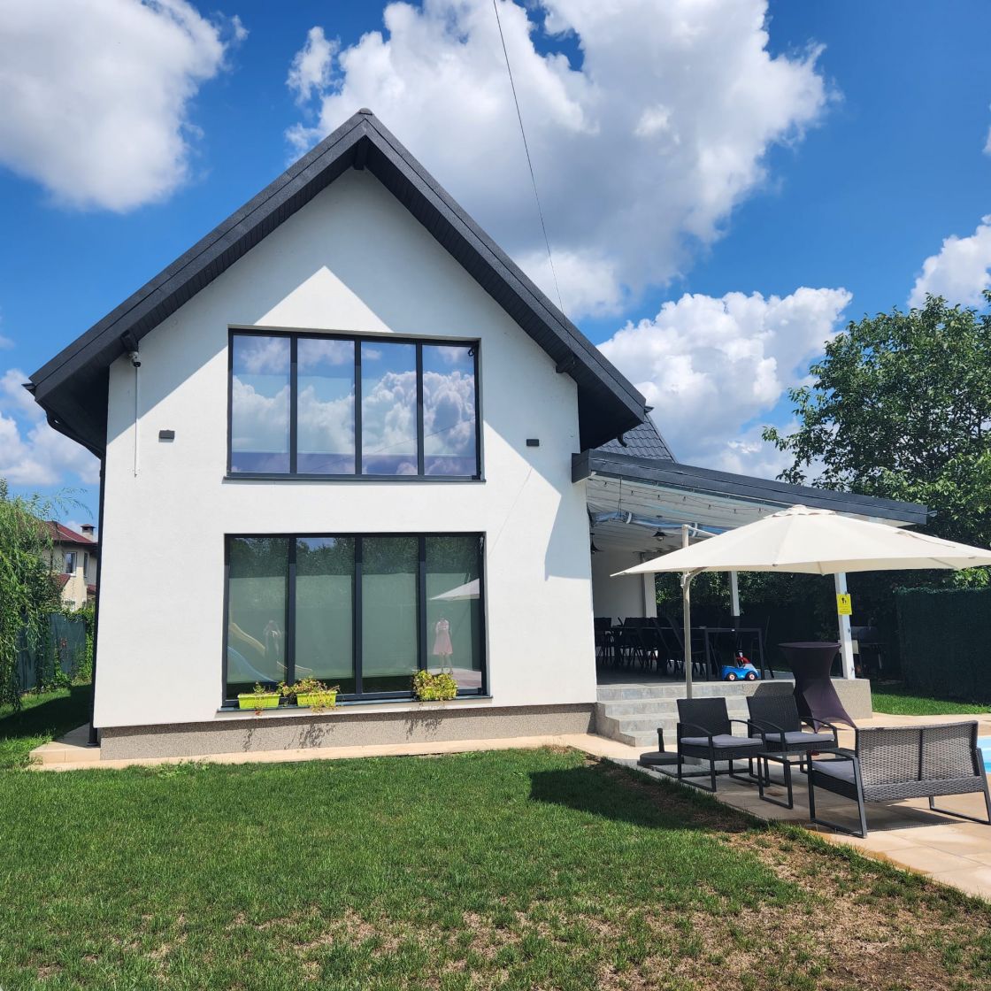 Va propunem spre vanzare vila individuala cu piscina in Saftica, Aleea Tec. Cu un teren de 1310 mp si o suprafata construita de 150 mp desfasurata astfel: parter: 116 mp: living bucatarie open space, doua bai, debara, terasa si mansarda 34 mp open space. Vila este mobilata si utilata pentru locatie de evenimente.
