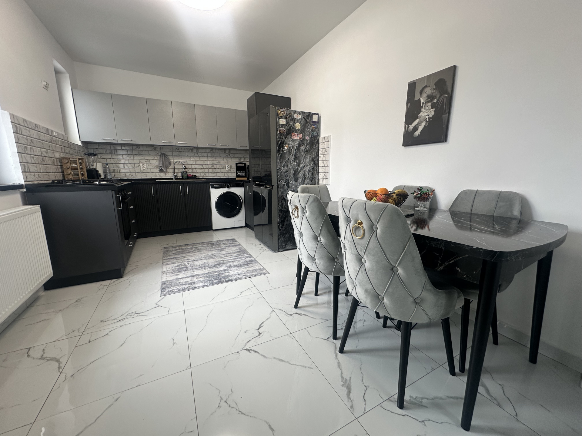 - Bucătărie mobilată și utilată, aragaz, frigider, mașină de spălat rufe, dotată cu centrală termică proprie,