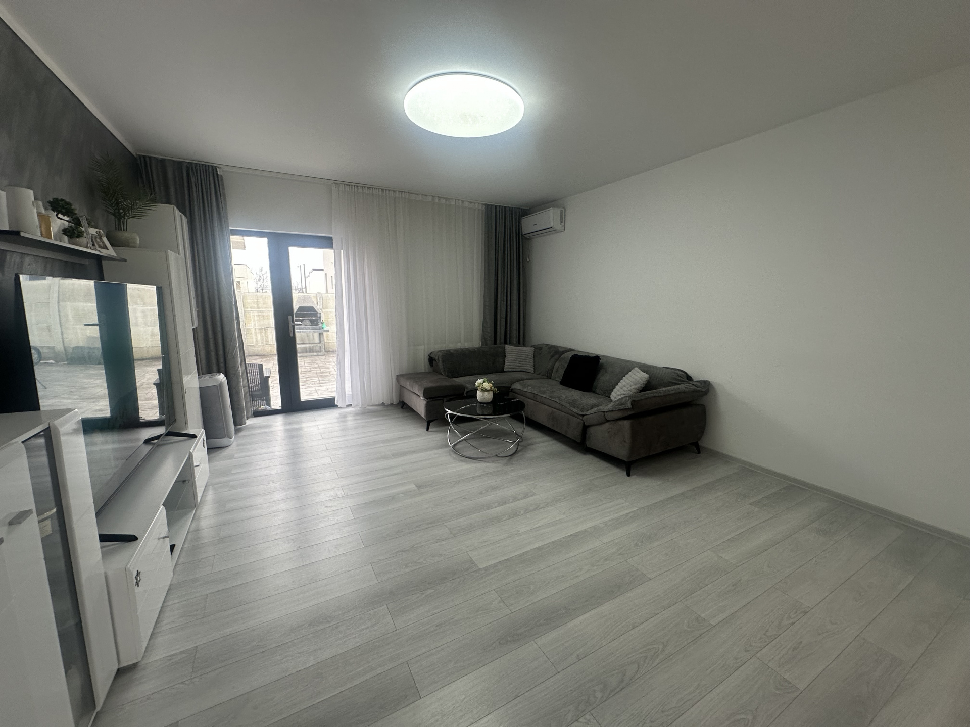 - Living luminos, cu canapea colțar, comodă cu televizor și aer condiționat, având acces direct către curtea din spate,