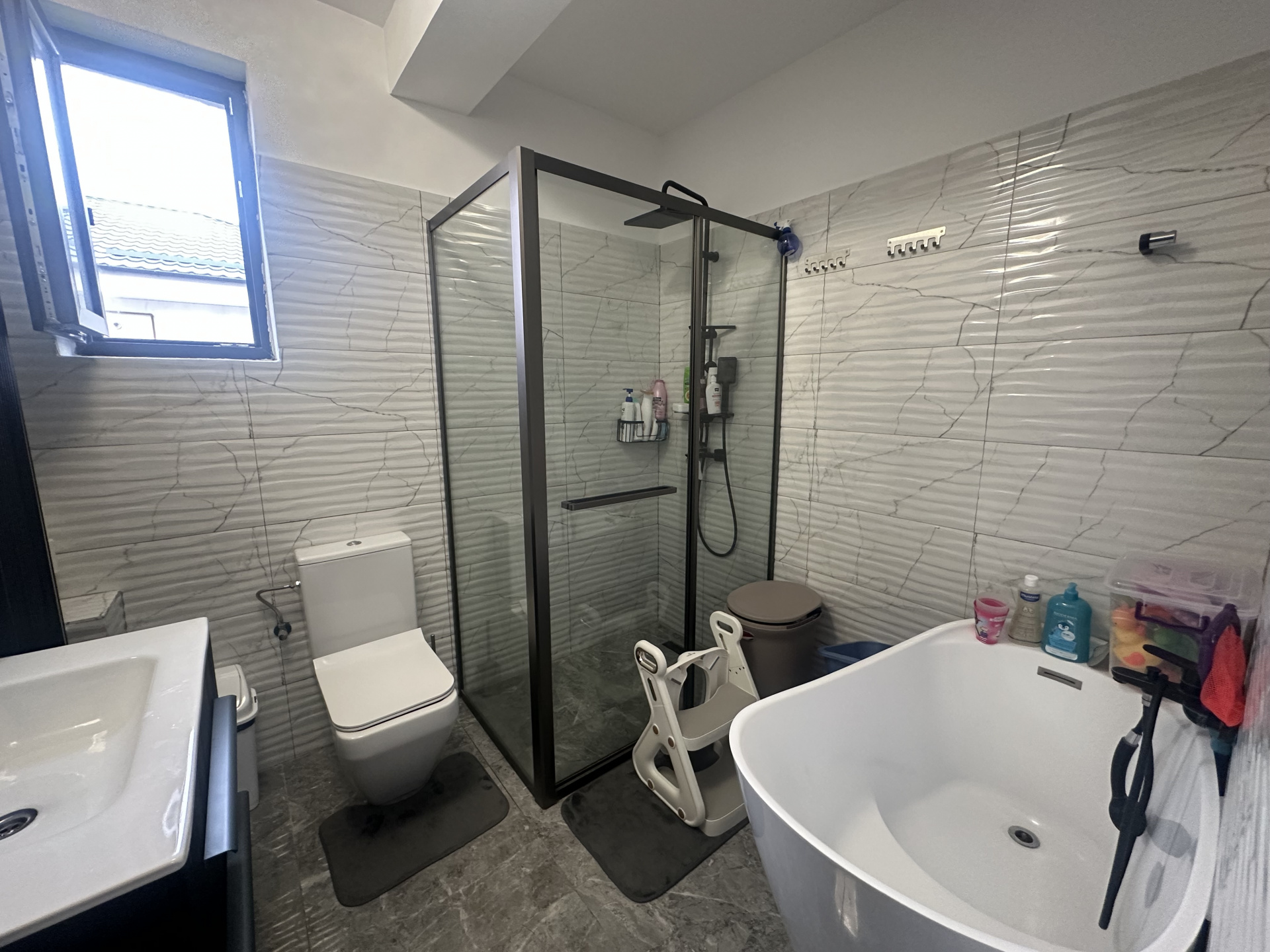 - Baie spațioasă, cu fereastră pentru aerisire naturală, cadă și cabină de duș.