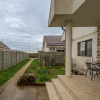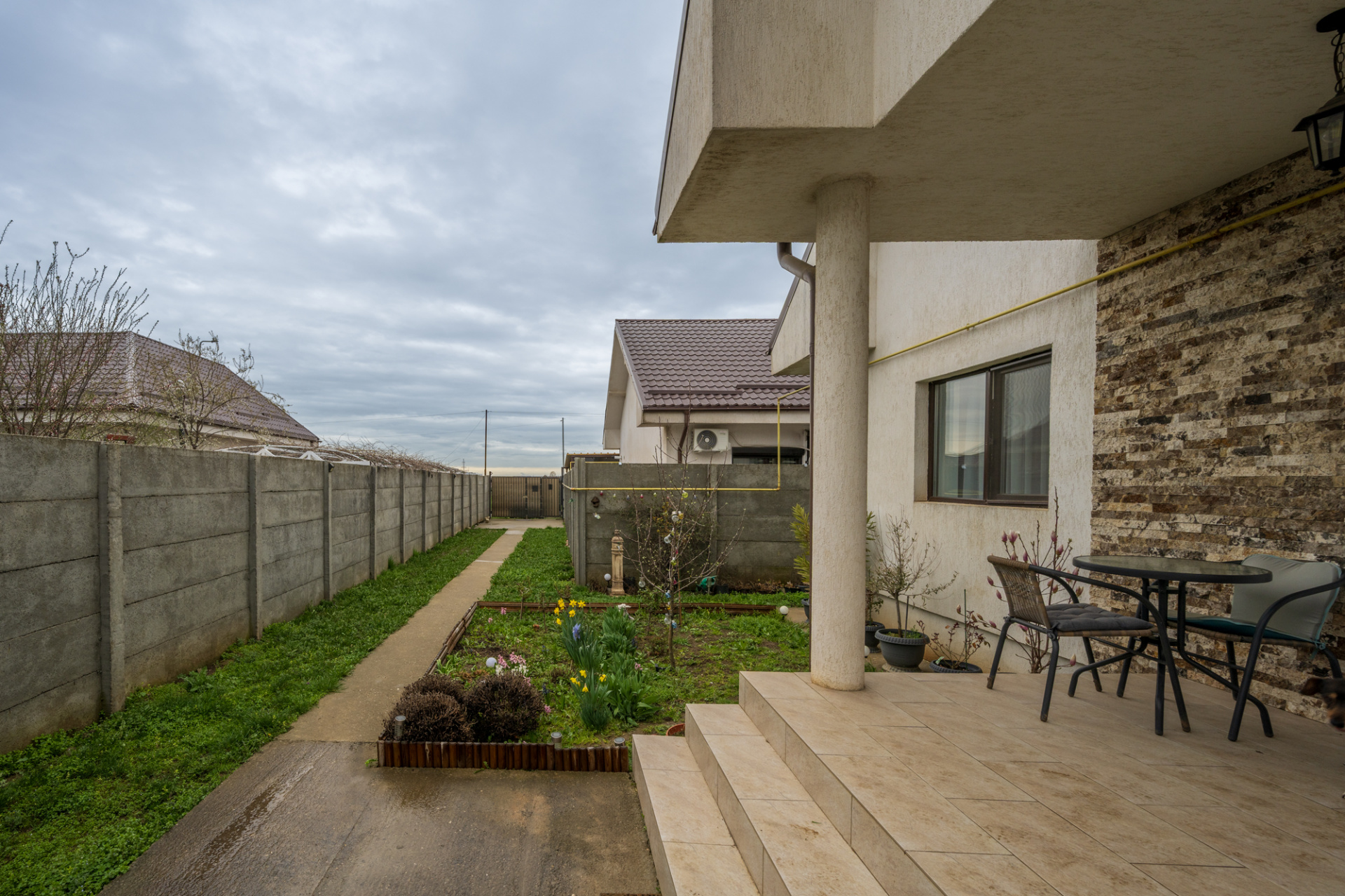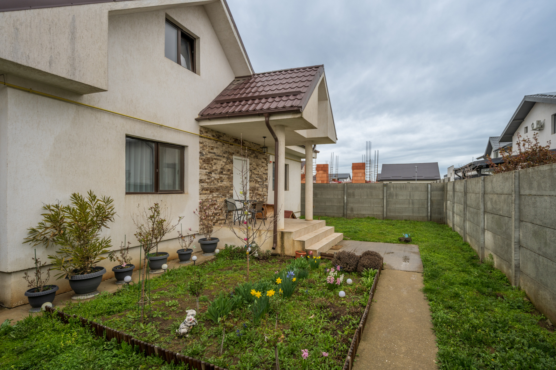 Curtea nu este foarte mare, dar este bine ingrijita, amenajata cu flori si pomi fructiferi. Se poate amenaja si un foisor, exista o zona potrivita chiar in fata casei. Terenul este in forma de L, cu o alee la intrarea dinspre strada (care face parte din proprietate, respectiv din lotul de teren al casei), zona in care s a amenajat un loc pentru parcat 1-2 masini.