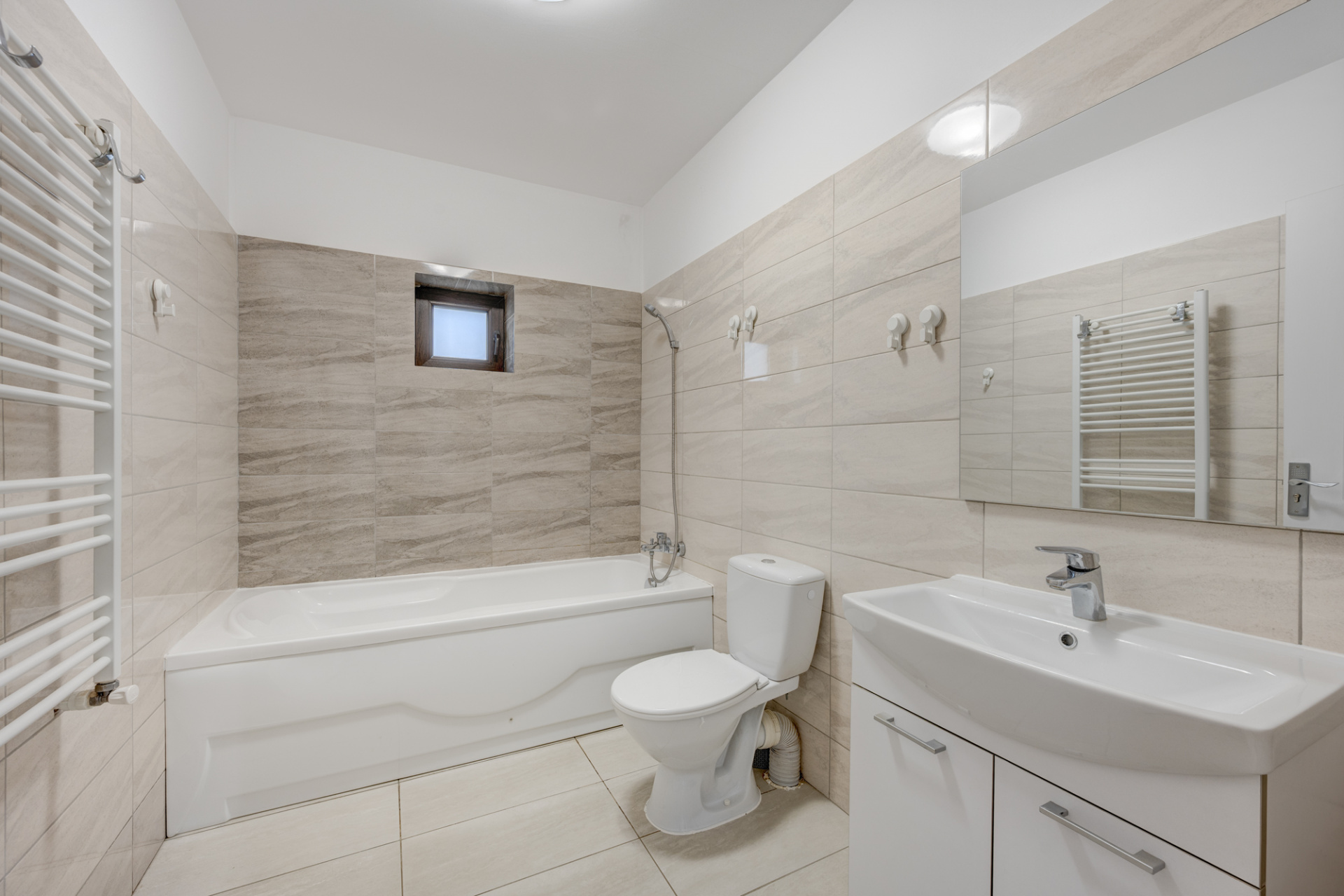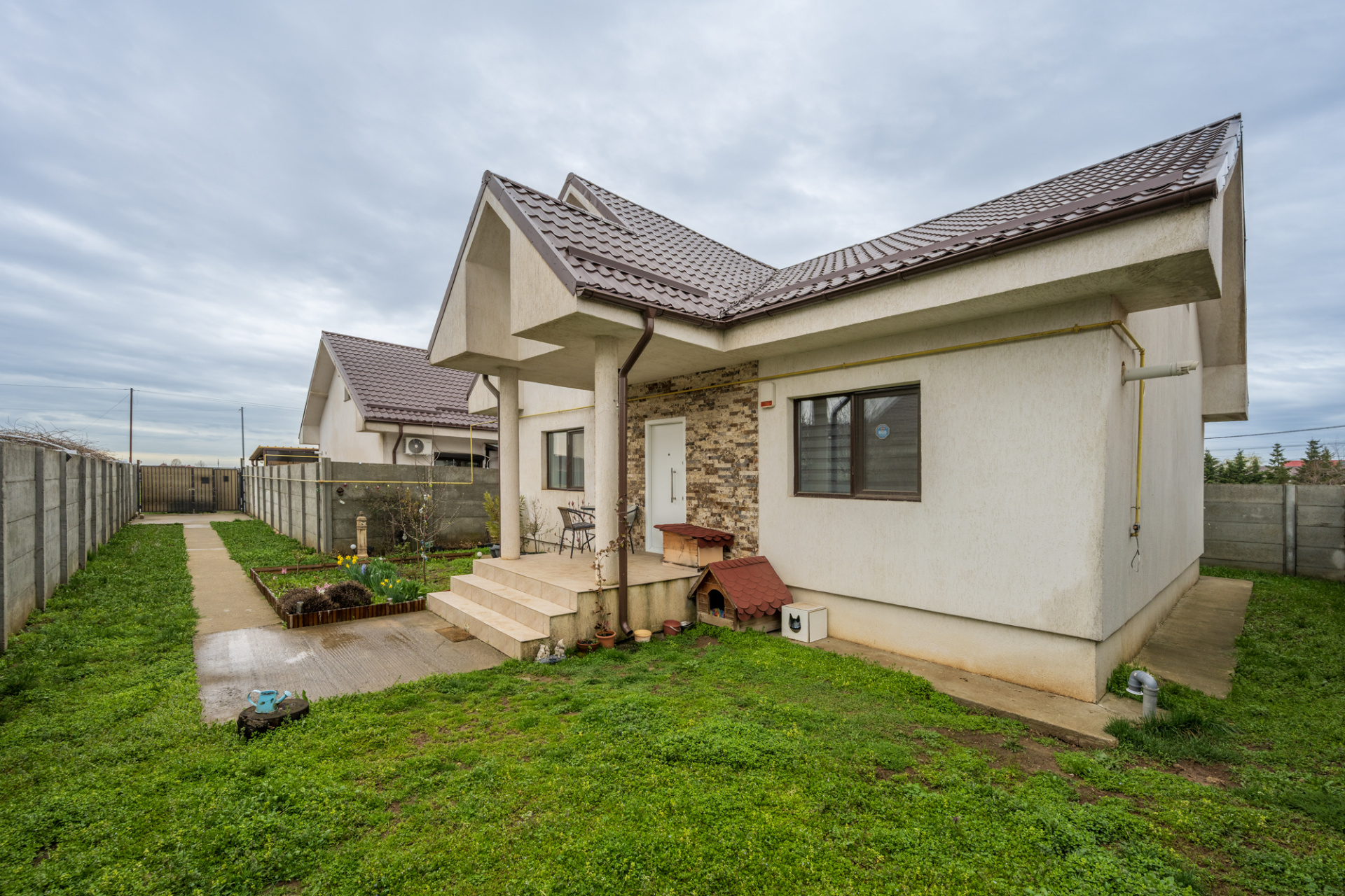 Casa este finisata, dotata cu centrala termica proprie pe gaz ( Ariston in condensatie 23kw) si incalzire prin calorifere din otel, ferestre cu geam termopan si tamplarie pvc, plase de insecte la toate ferestrele, sistem de alarma, usi interioare moderne. Pardoselile sunt placate cu parchet laminat in camere si gresie in hol, baie si bucatarie. Instalatia electrica este pe conductori din cupru (2,5mmp grosime). Proprietatea este in stare foarte buna, a fost locuita 5 ani de proprietari si este extrem de bine intretinuta si nu necesita niciun fel de reparatii sau retusuri, cu exceptia amenajarii podului.