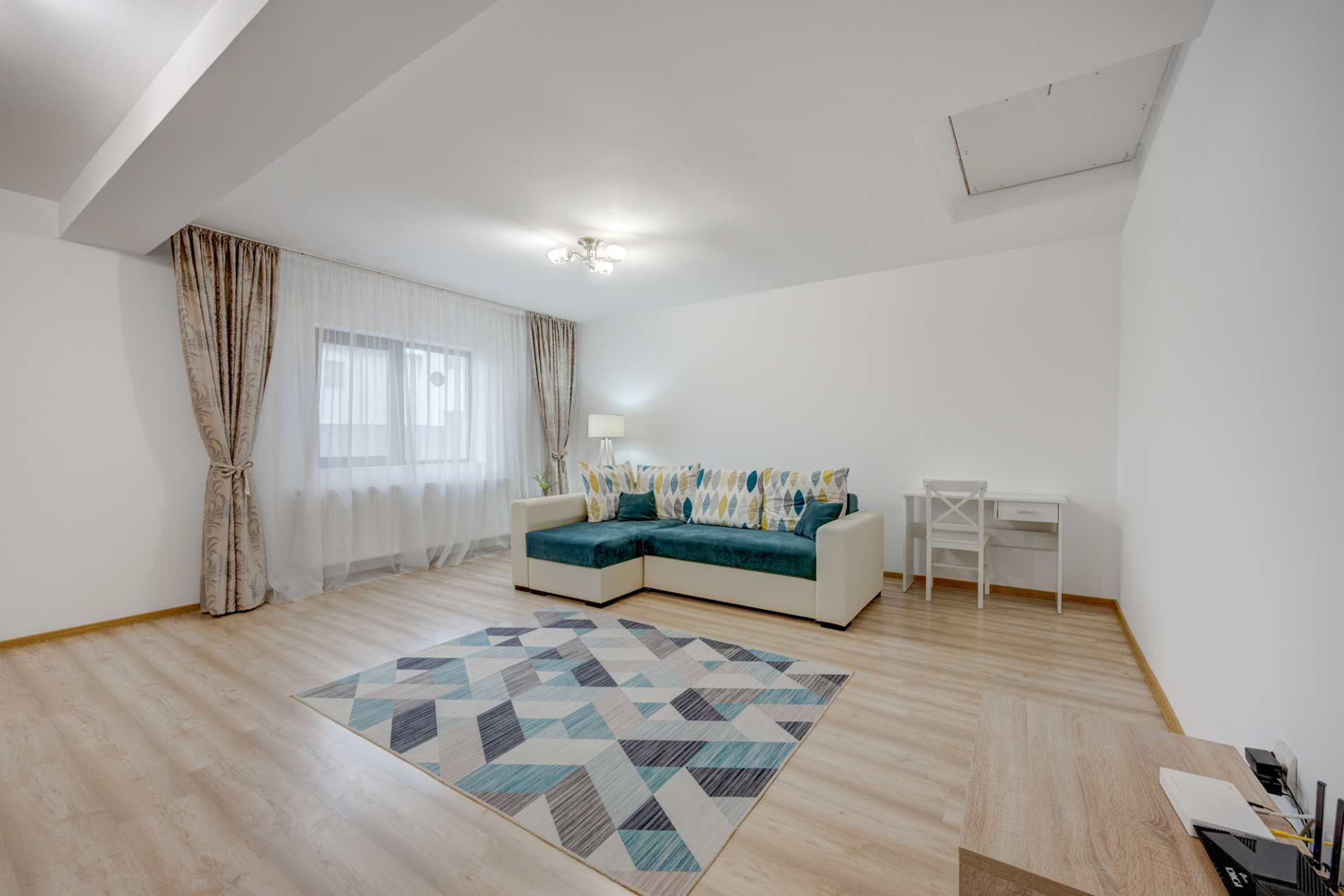 Livingul are o suprafata de 28 mp, este amenajat cu o canapea, birou si mobilier depozitare si comota cu TV. Din living se face accesul catre pod ( pe o scara retractabila). Podul este spatios, are ferestre cu lumina naturala, are instalatiile trase pentru apa si calorifere si este izolat cu vata minerala. Nu este planseu din beton peste parter. Cele doua dormitoare au suprafate de 13,2 mp si 13,4 mp. Unul dintre dormitoare este mobilat iar al doilea dormitor este nemobilat. Grupul sanitar este echipat cu toate obiectele sanitare, cada si are si fereastra pentru aerisire naturala.