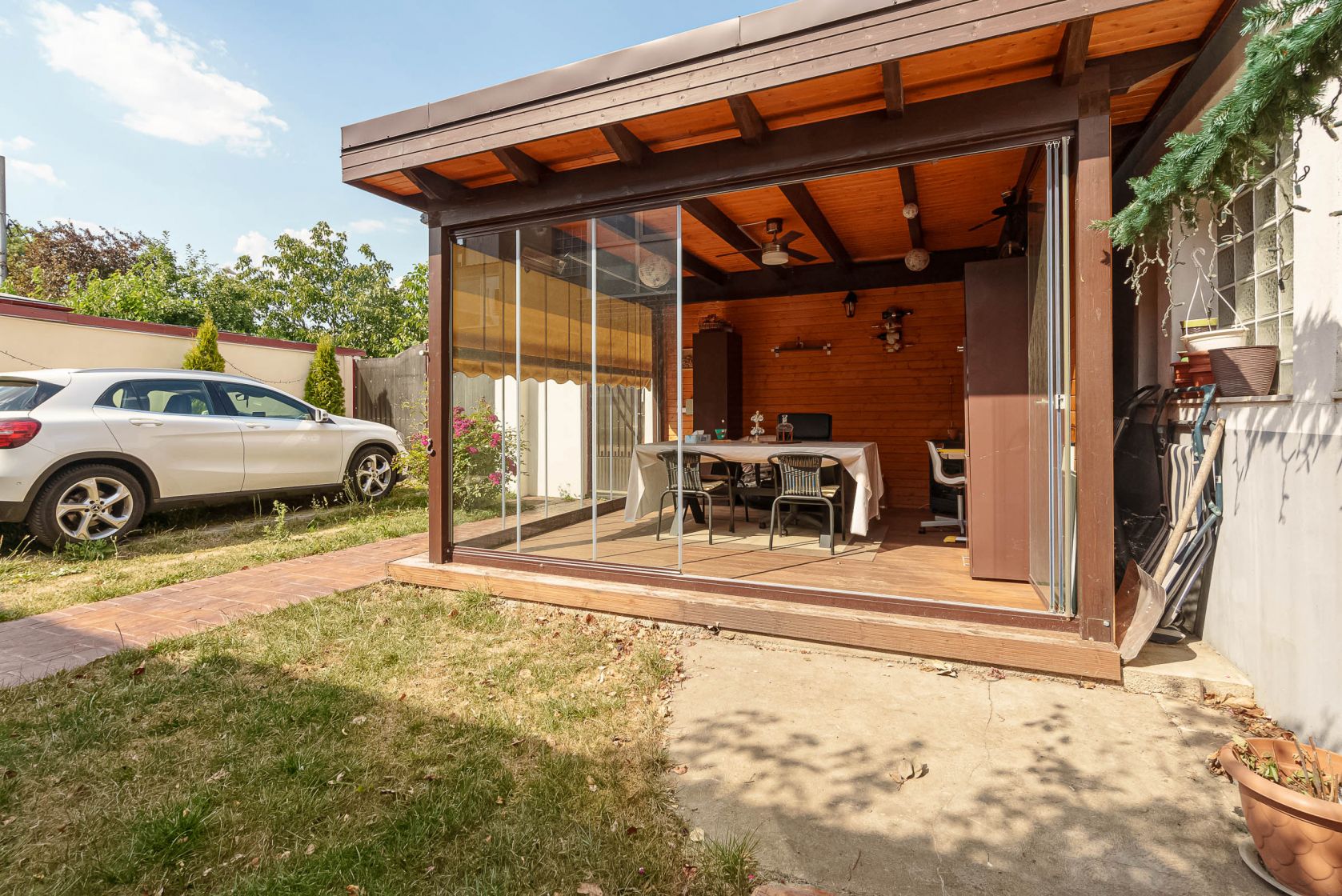 Curtea oferă un foișor modern de 16 mp, perfect pentru relaxare și socializare în orice anotimp, datorită geamurilor retractabile care permit deschiderea completă.